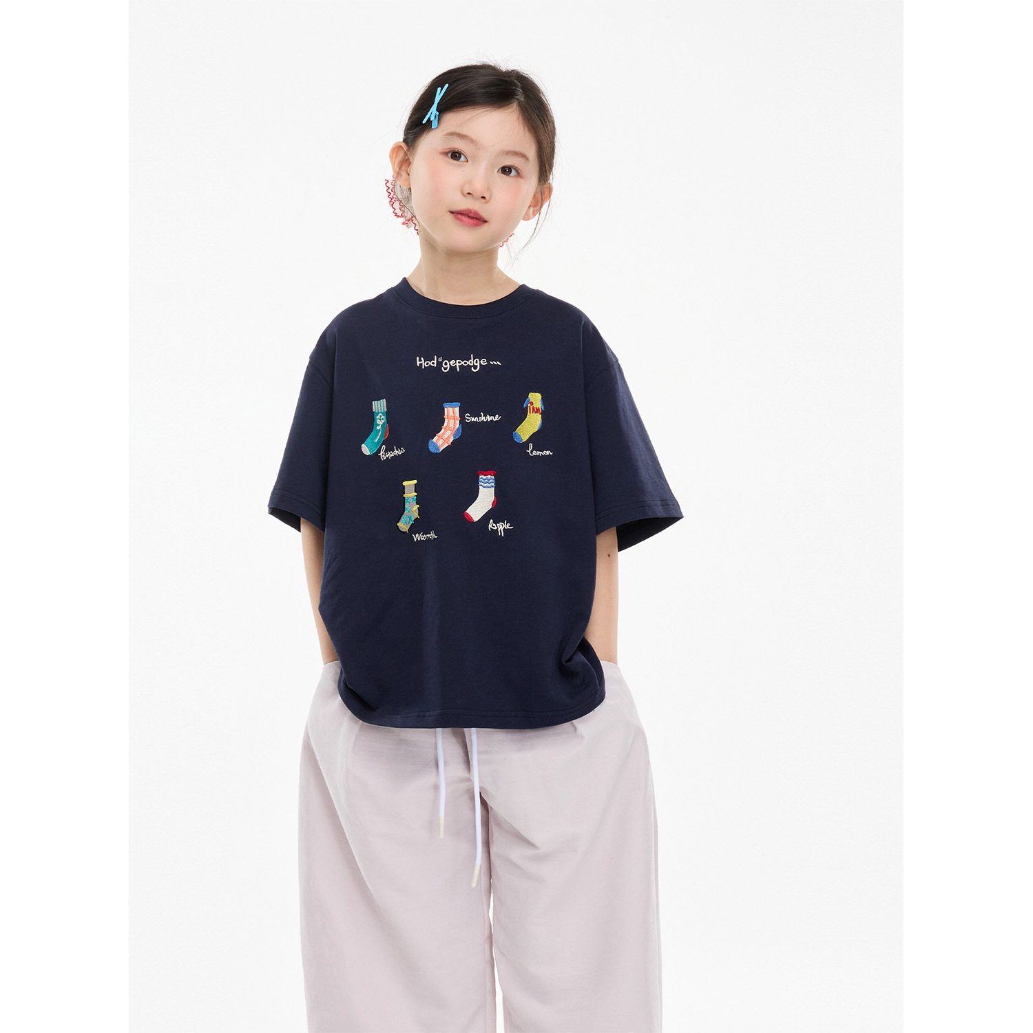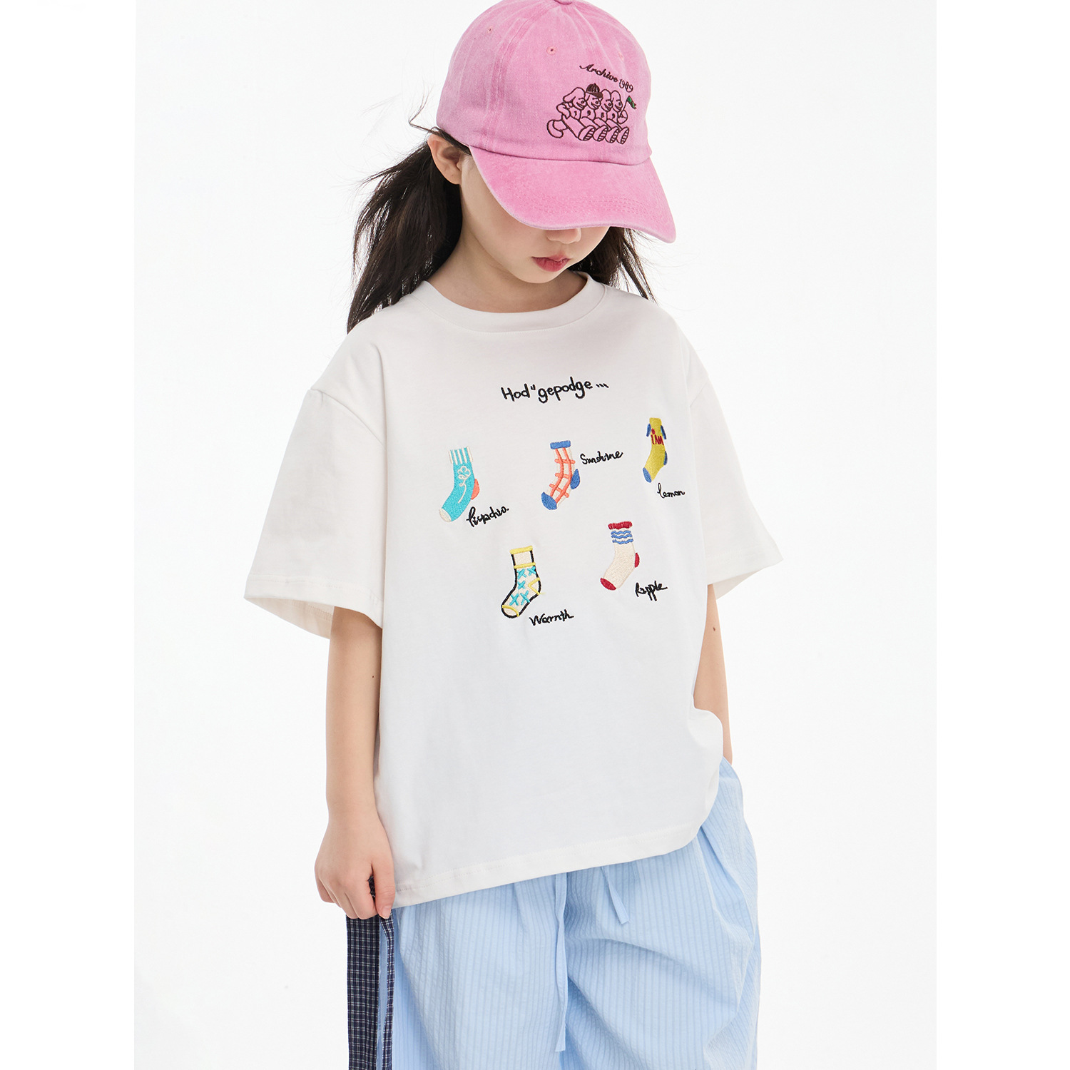 여자 작은 양말 자수 티셔츠 2025 여름 새로운 어린이 틈새 디자인 센스 짧은 소매 큰 어린이 올매치 탑스토어 가기