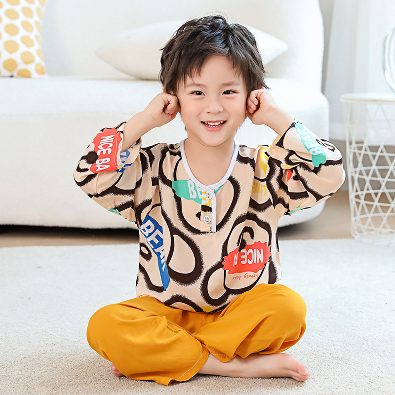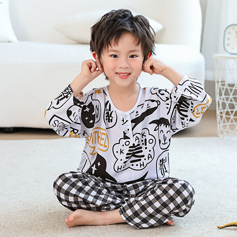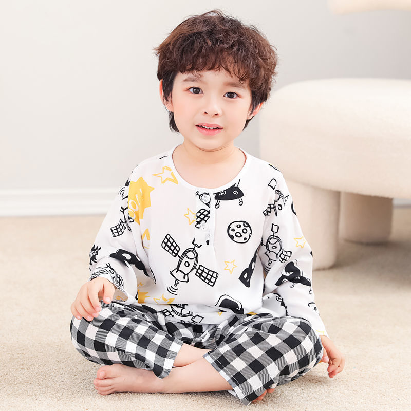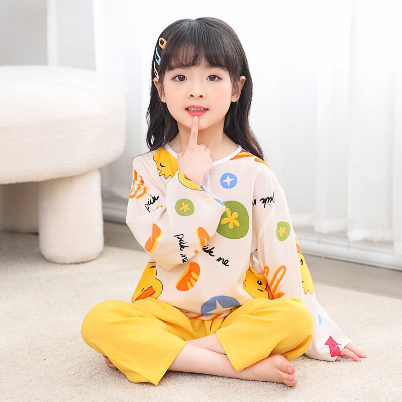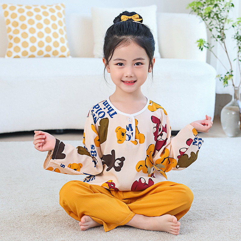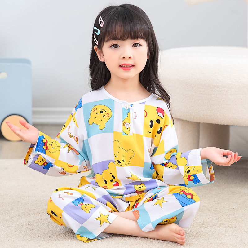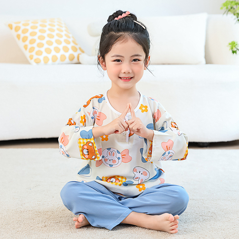 어린이 면화 실크 잠옷 얇은 여름 긴팔 소년 소년 면화 실크 에어컨 가정 의류 소녀 소녀 정장
