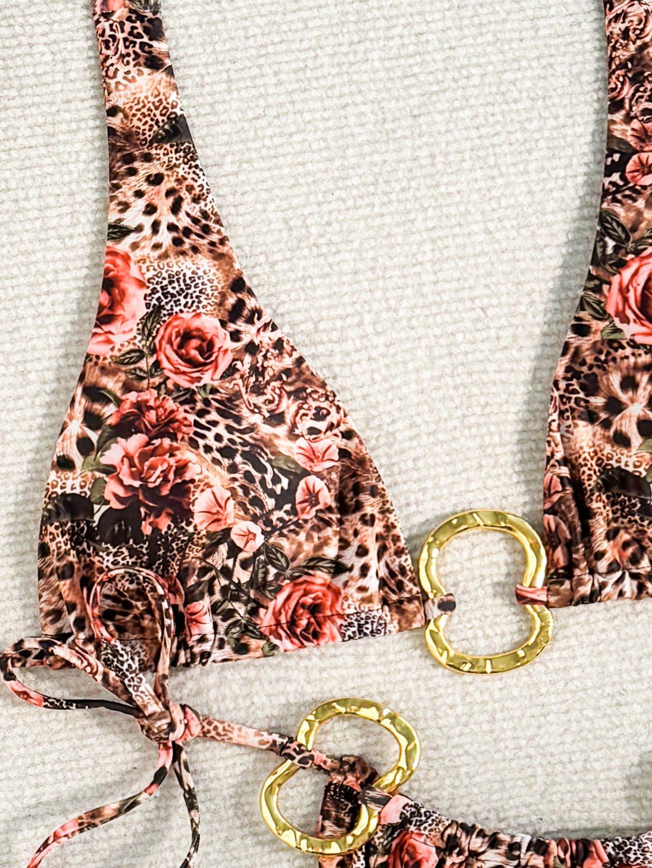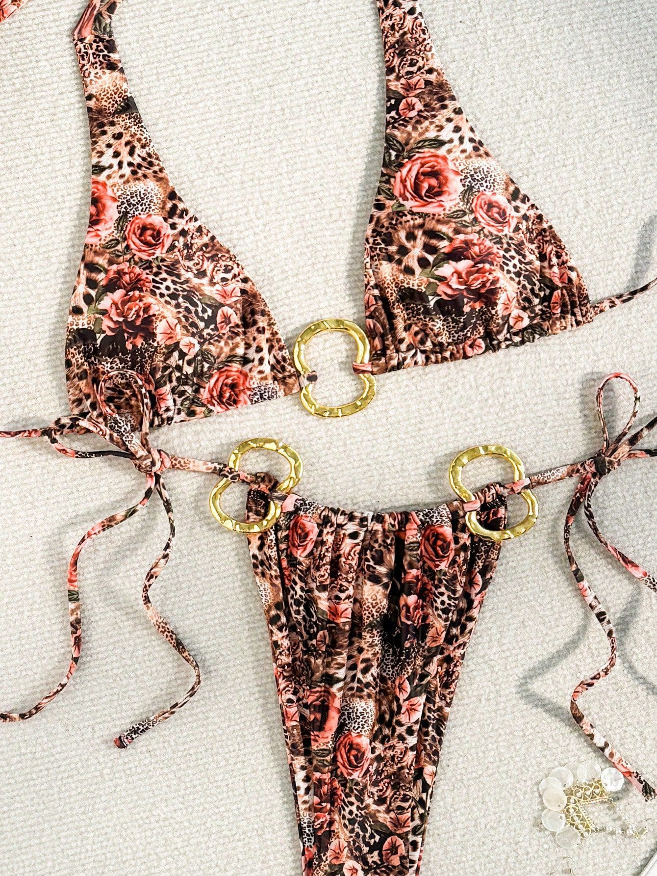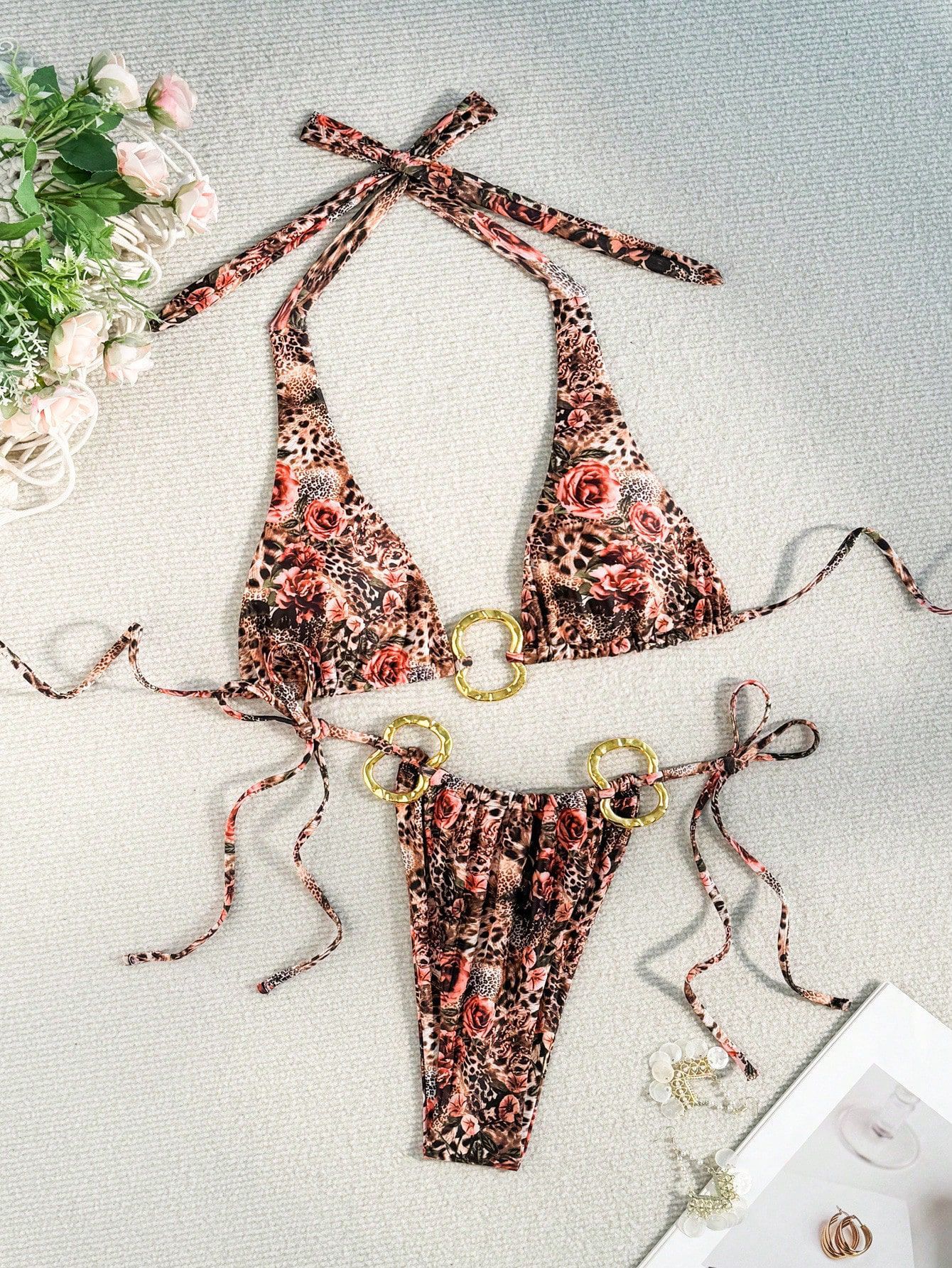 2025 Amazon 섹시한 타이거 프린트 로우 웨이스트 패셔너블 여성용 홀터넥 레이스 업 스플릿 비키니 비치 슈트