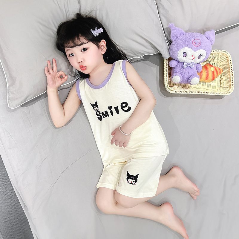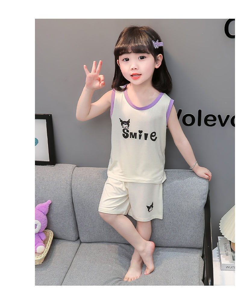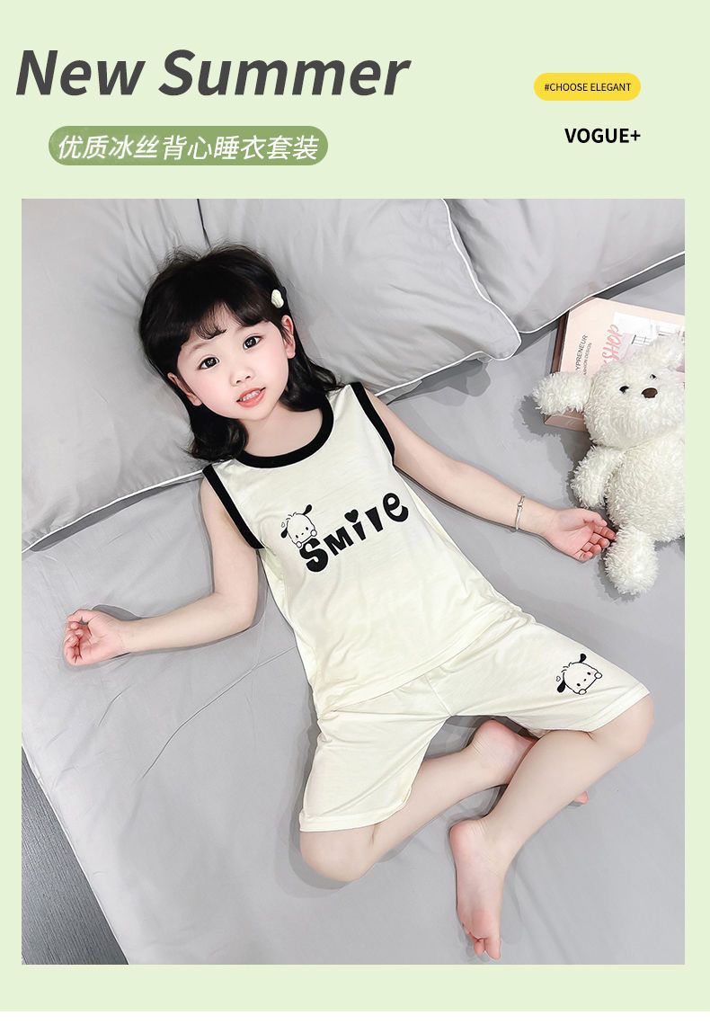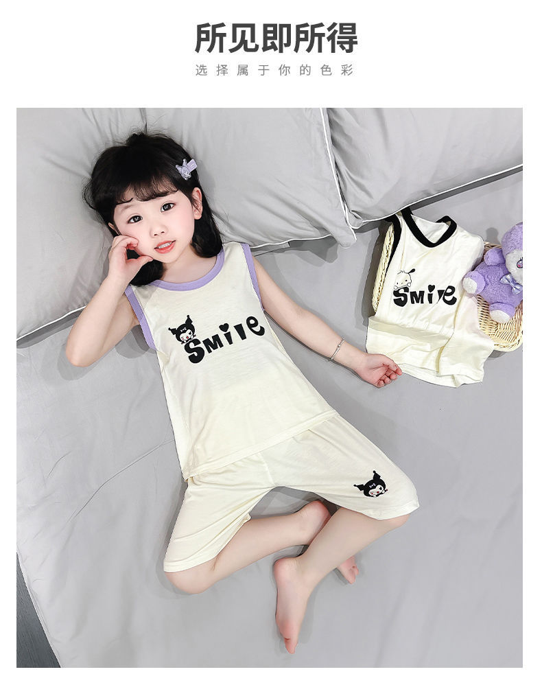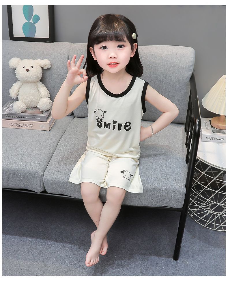 여자 여름 얇은 조끼 잠옷 2024 새로운 어린이 가정 의류 큰 어린이와 소녀 에어컨 의류 투피스 세트
