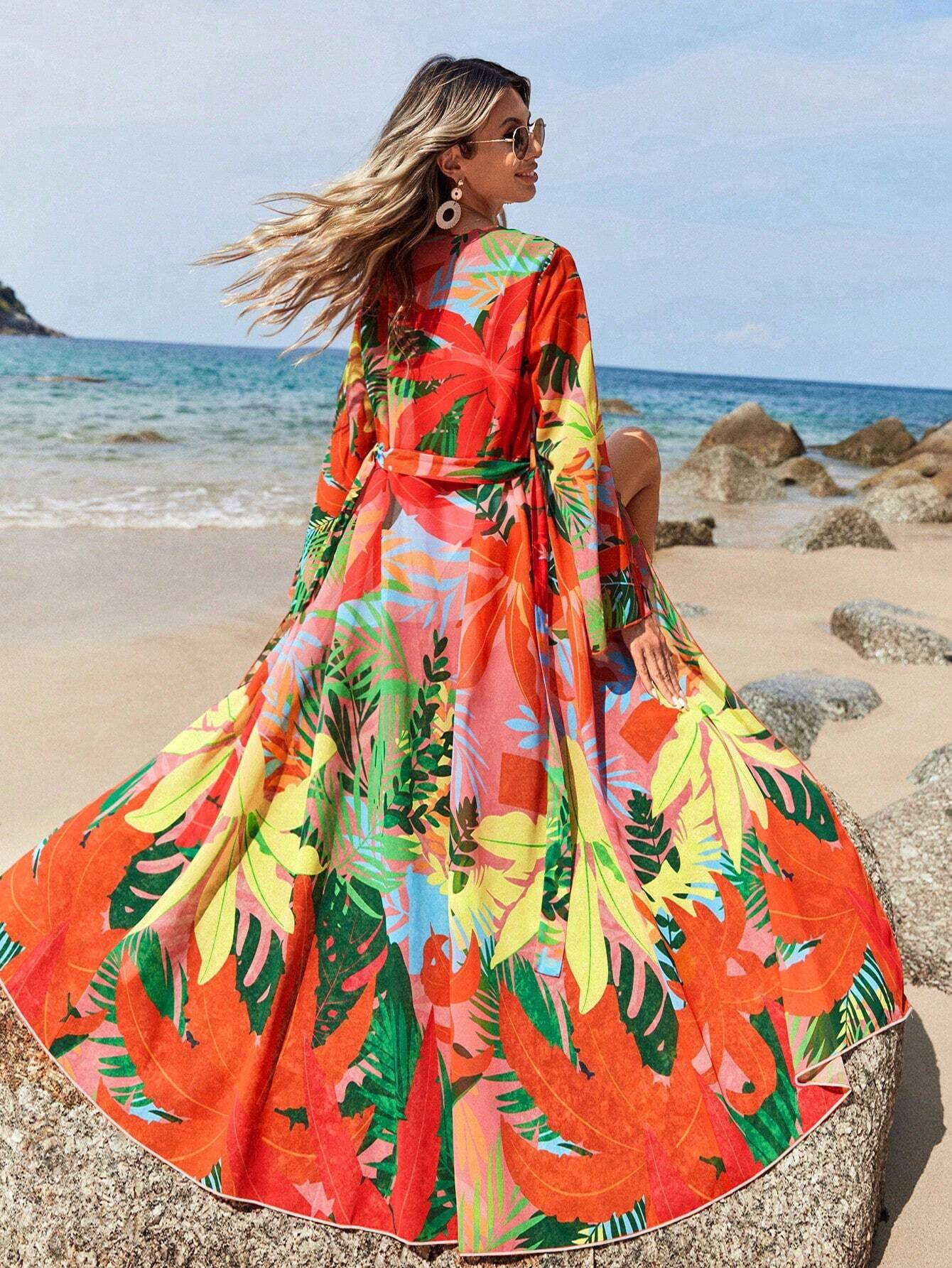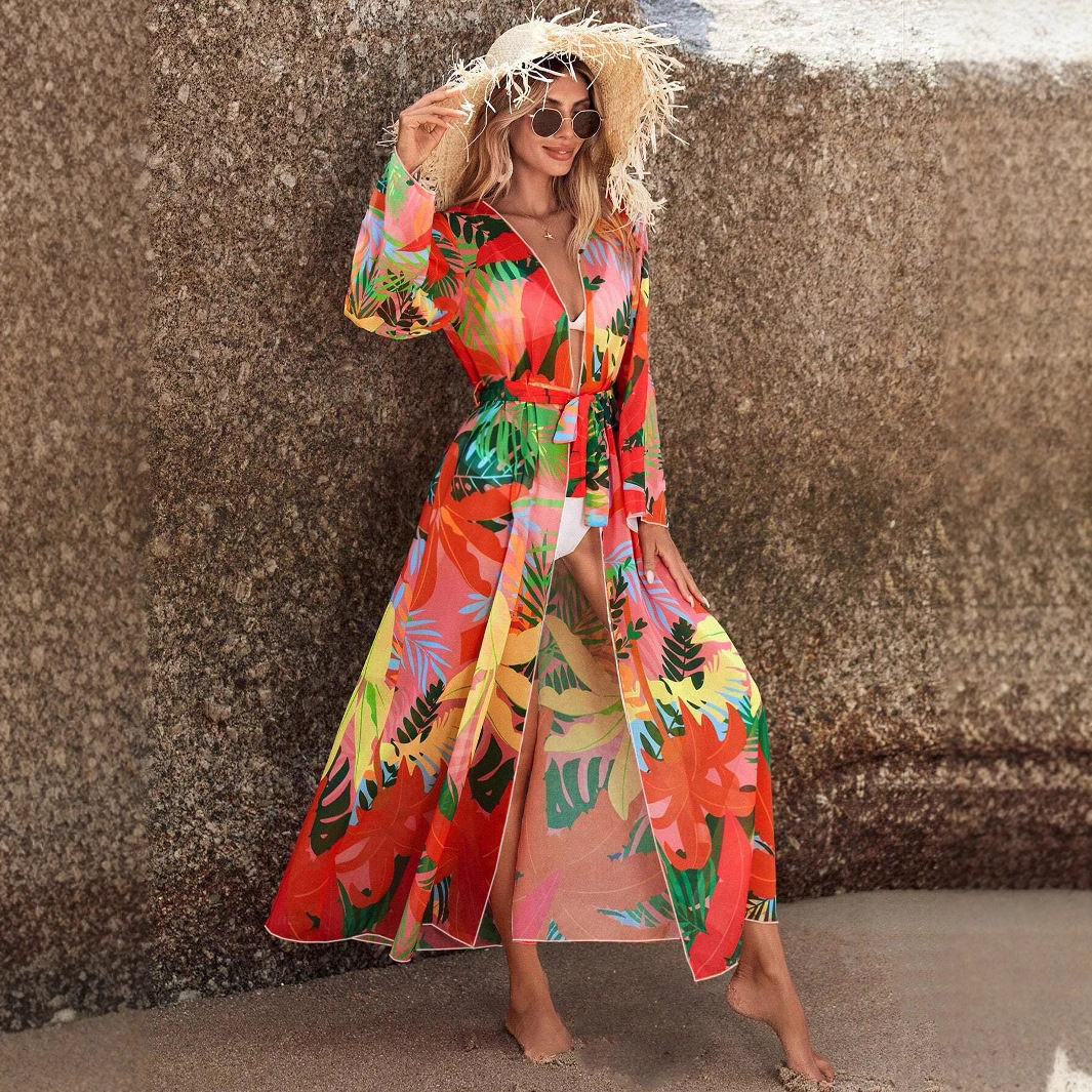 국경을 넘나드는 인기 비치 커버업 쉬폰 긴팔 프린트 휴가 자외선 차단 가디건 비키니 롱 스커트 아우터 커버업