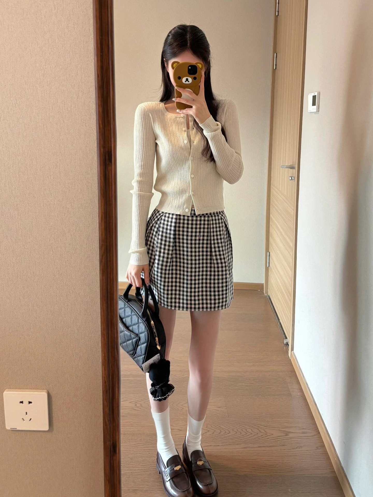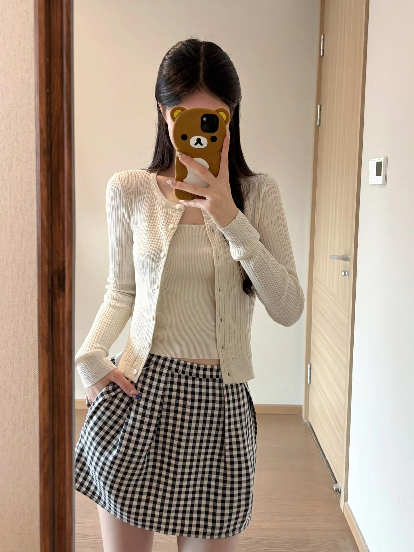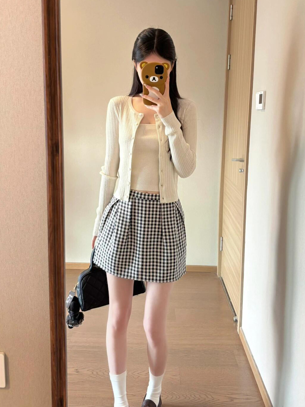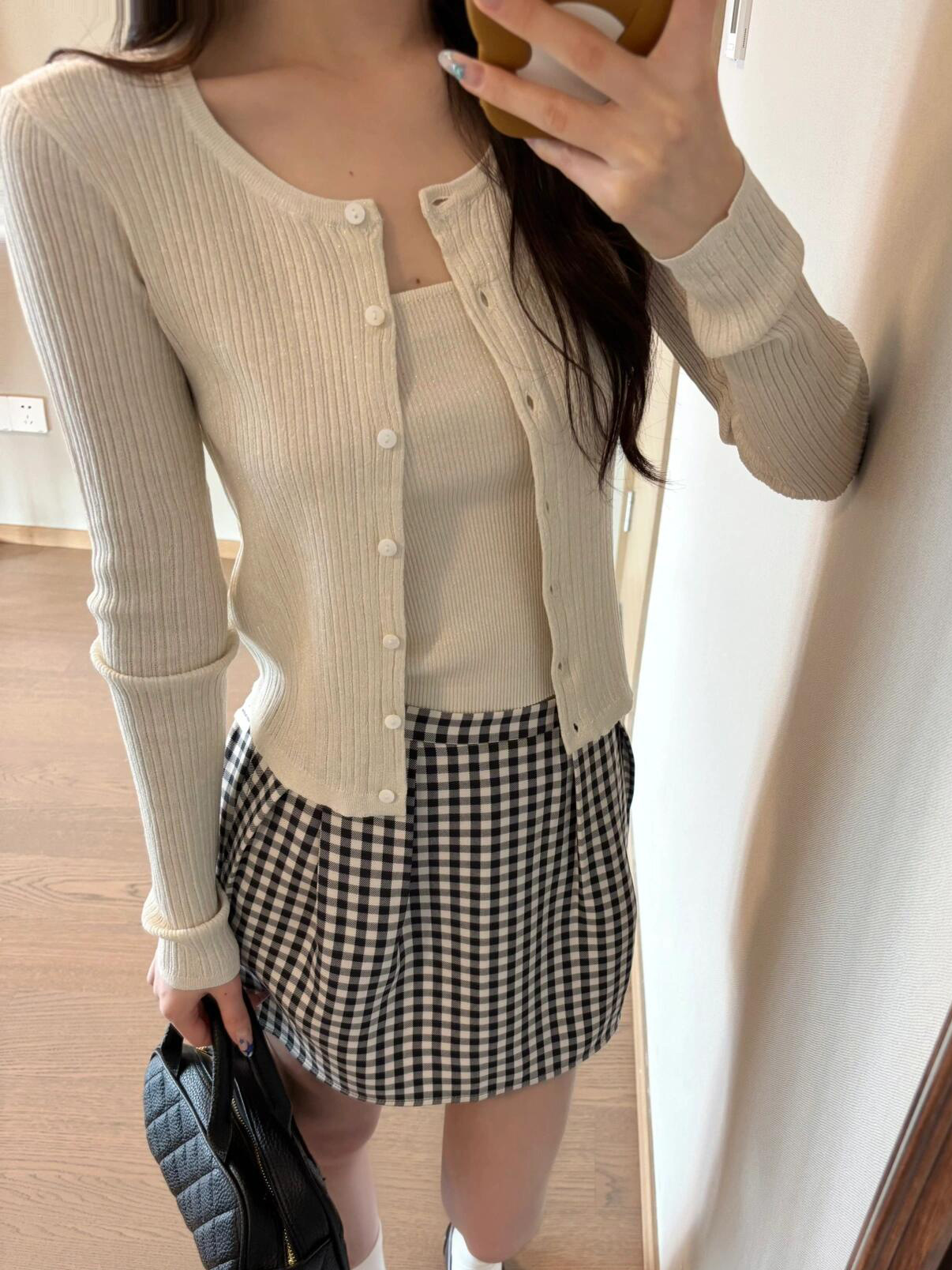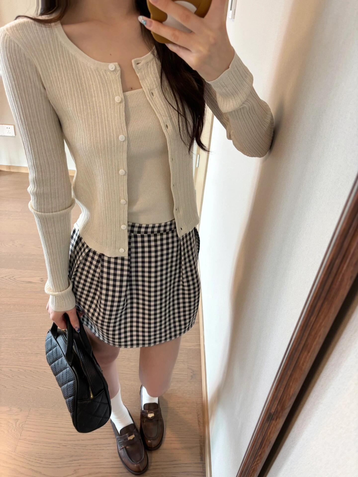 2026년 신상 초봄룩은 한국식의 부드러운 스타일을 담은 니트 가디건과 스트랩이 달린 체크무늬 스커트 세트입니다.