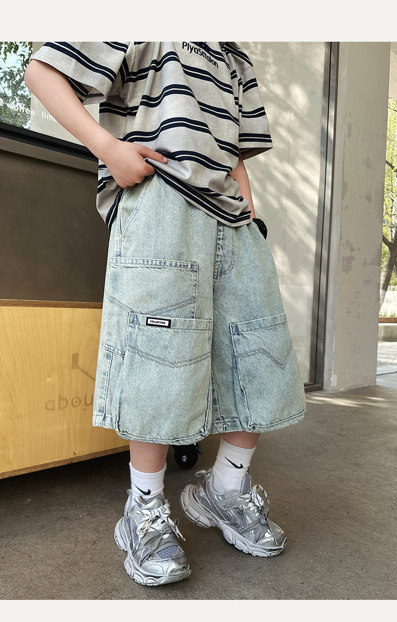 남학생 데님 작업복 반바지 2025 년 여름 새로운 어린이 5 점 바지, 큰 소년 여름 유행 바지
