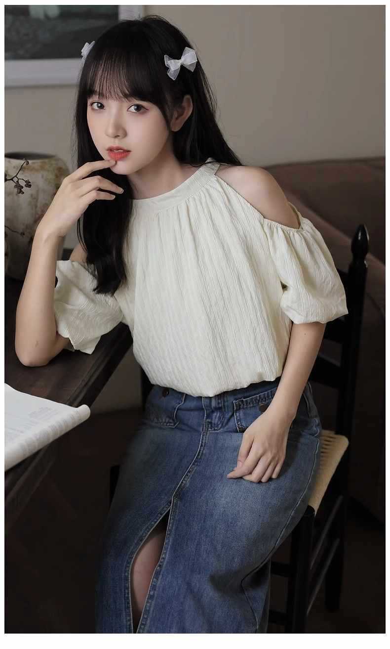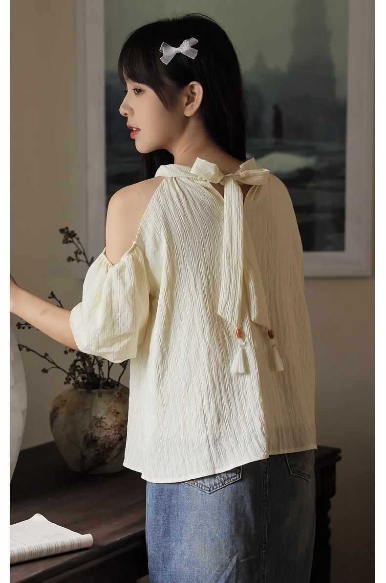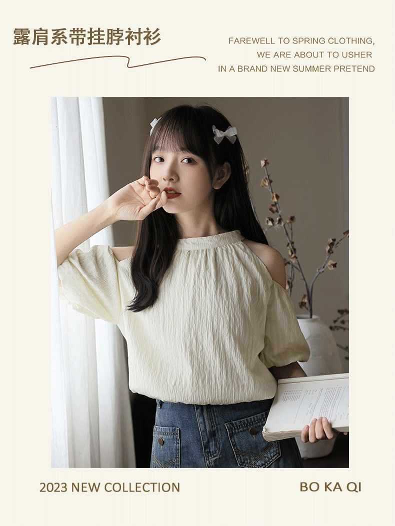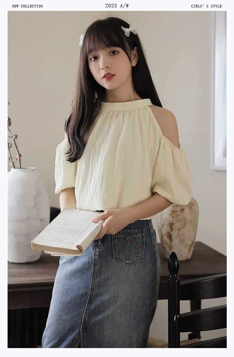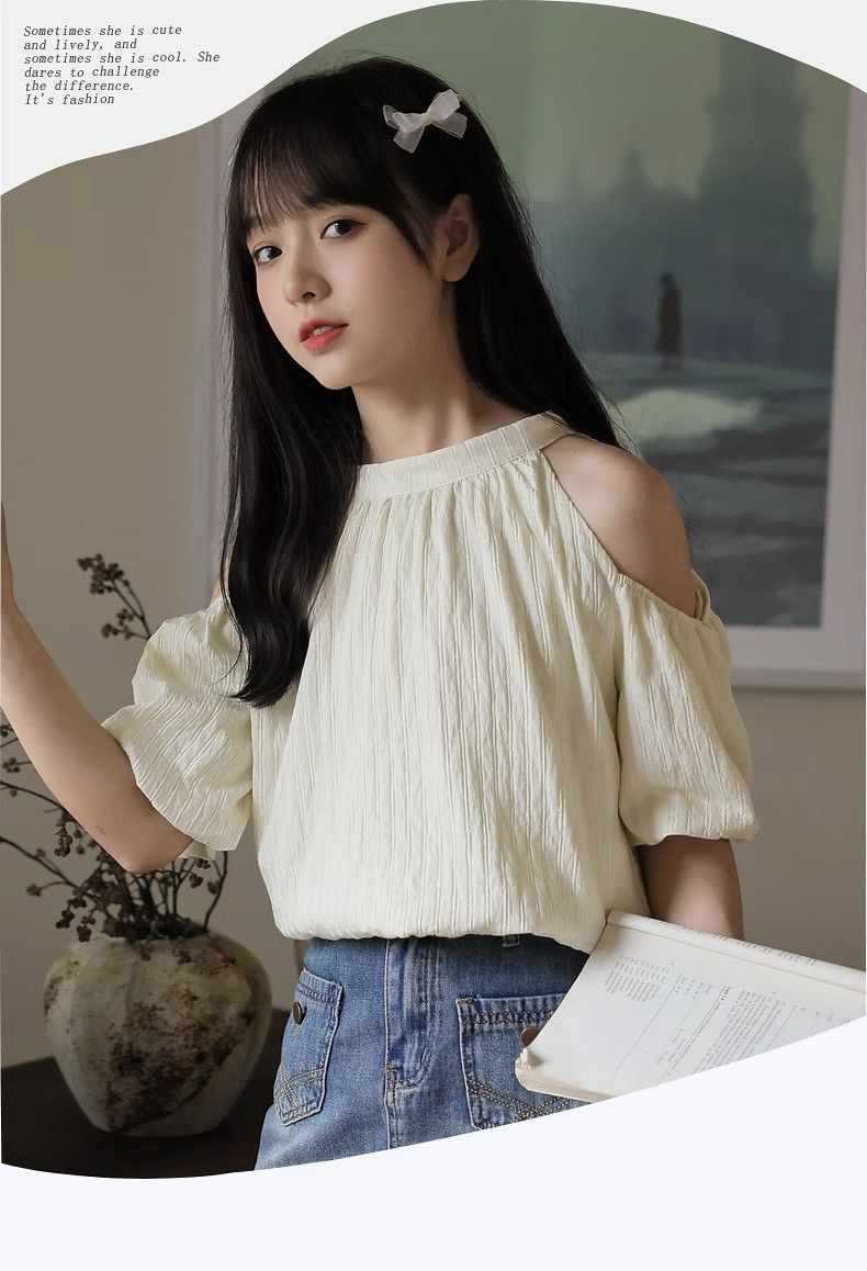 여름 여성을 위한 프렌치 스타일 리본 오프숄더 쉬폰 셔츠, 스위트 홀터넥 퍼프 슬리브 셔츠, 루즈 탑스토어 가기