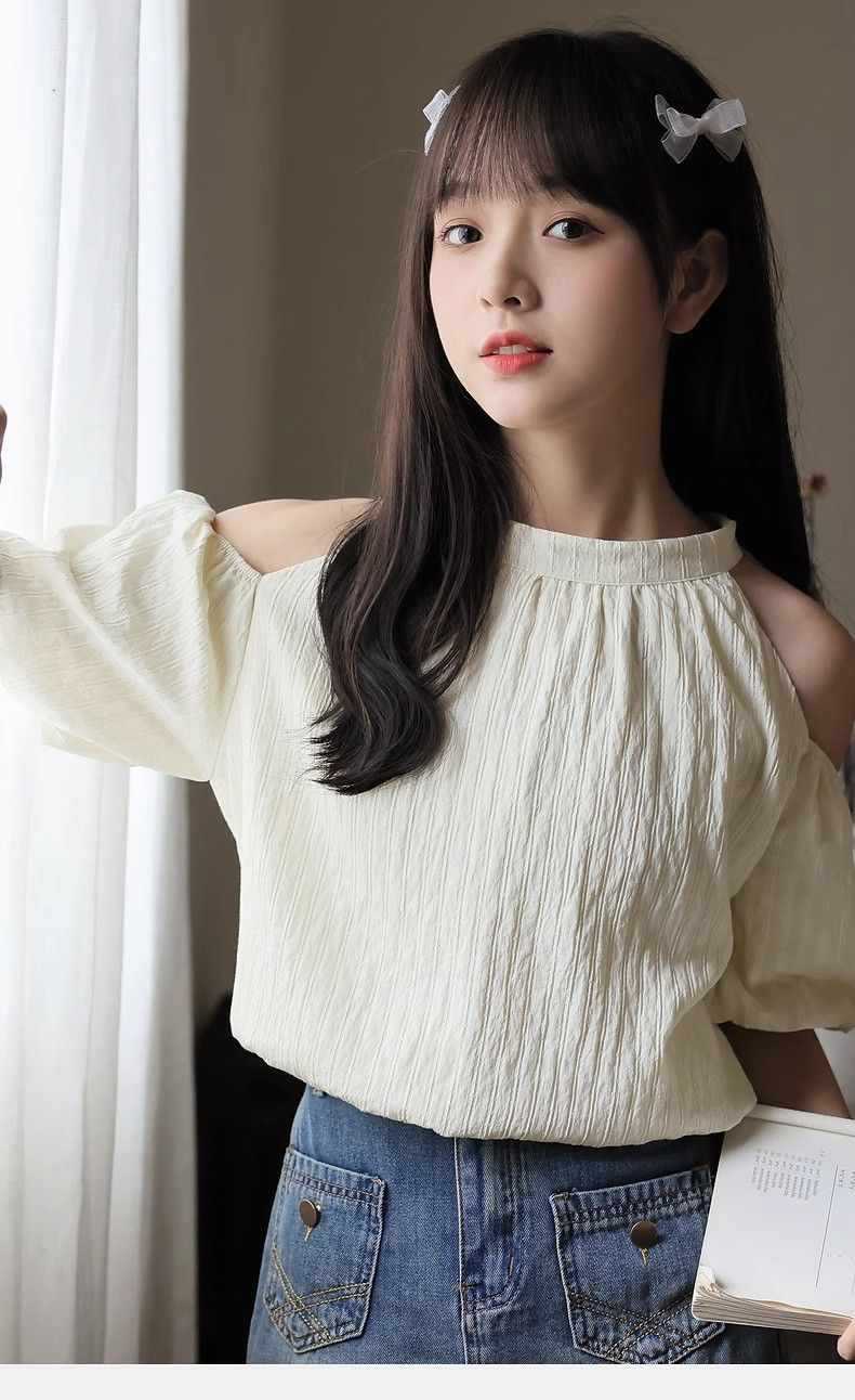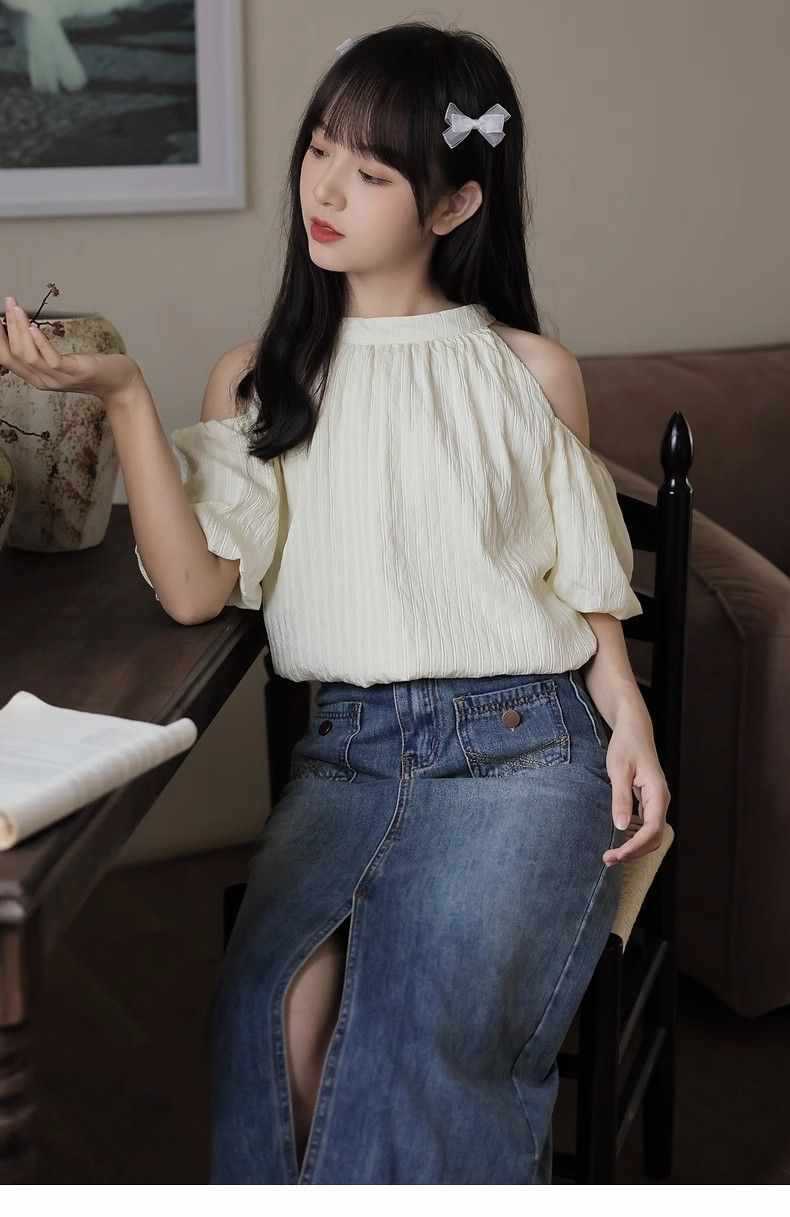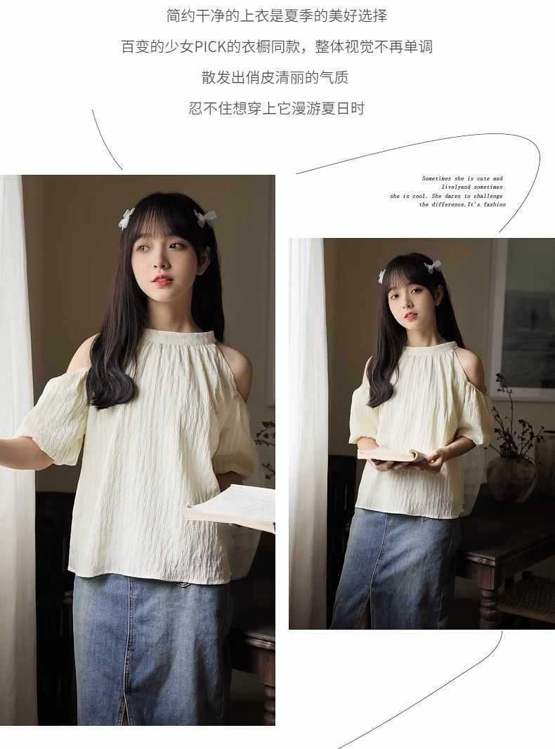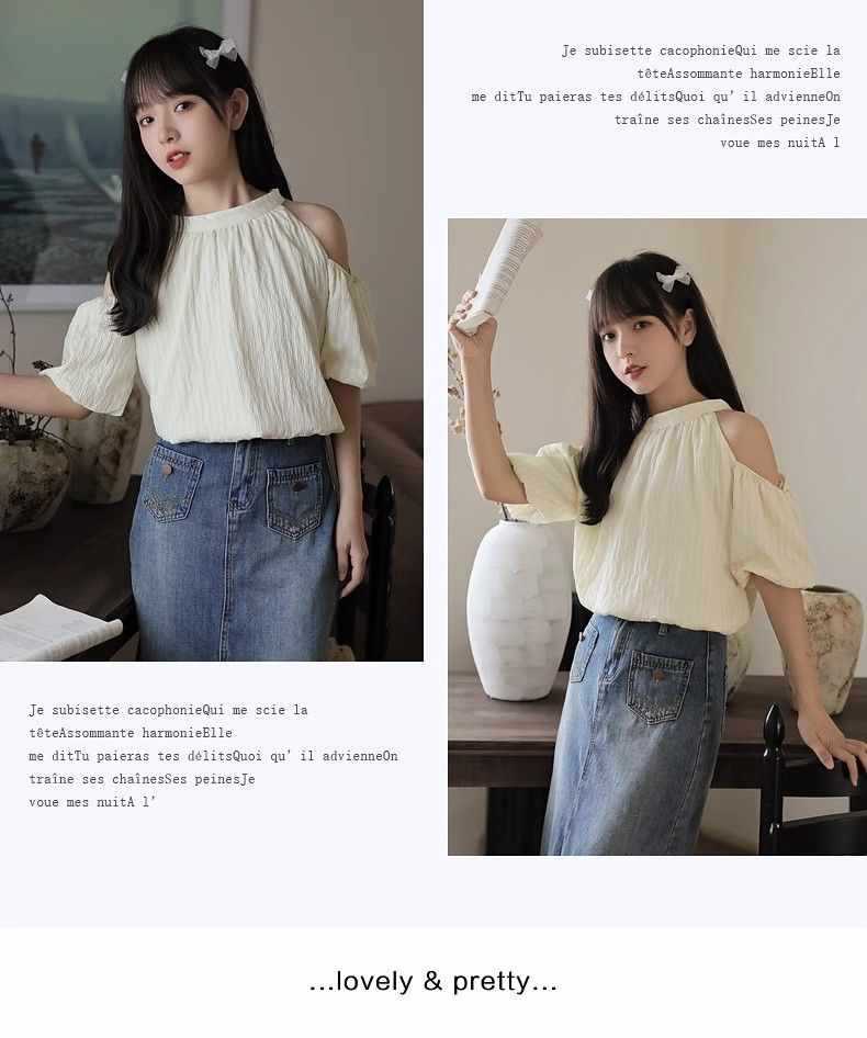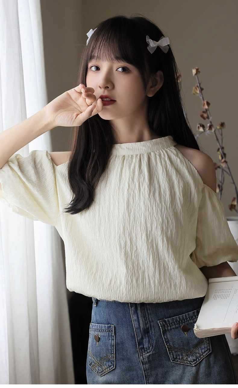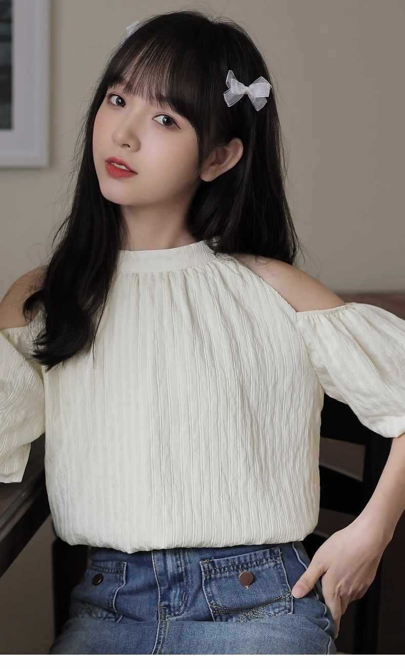 여름 여성을 위한 프렌치 스타일 리본 오프숄더 쉬폰 셔츠, 스위트 홀터넥 퍼프 슬리브 셔츠, 루즈 탑스토어 가기