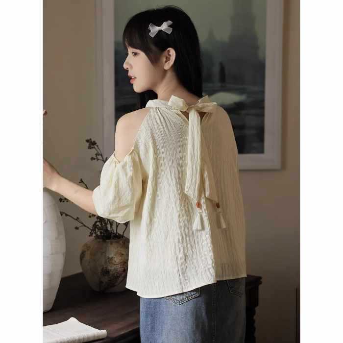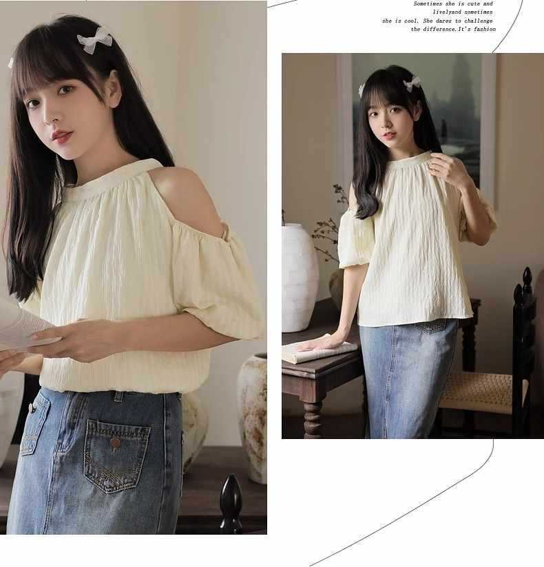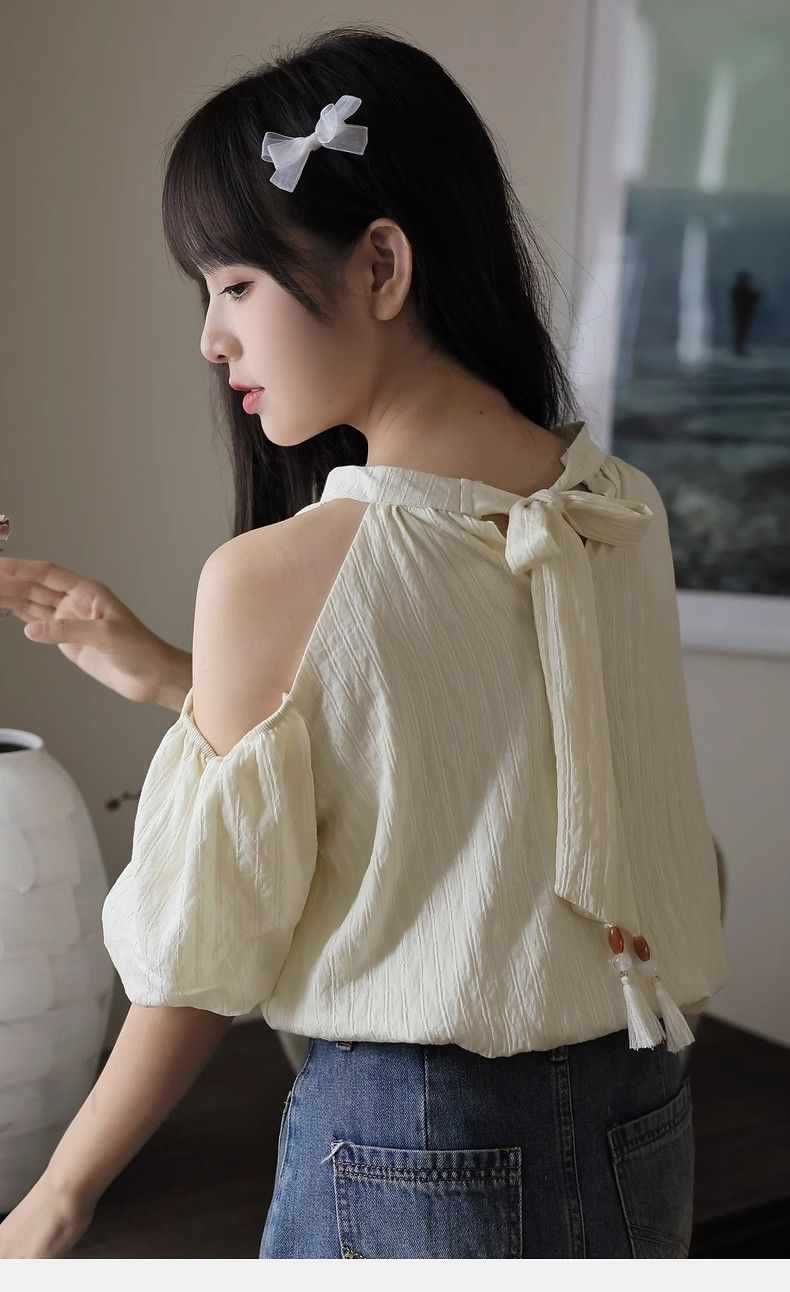 여름 여성을 위한 프렌치 스타일 리본 오프숄더 쉬폰 셔츠, 스위트 홀터넥 퍼프 슬리브 셔츠, 루즈 탑