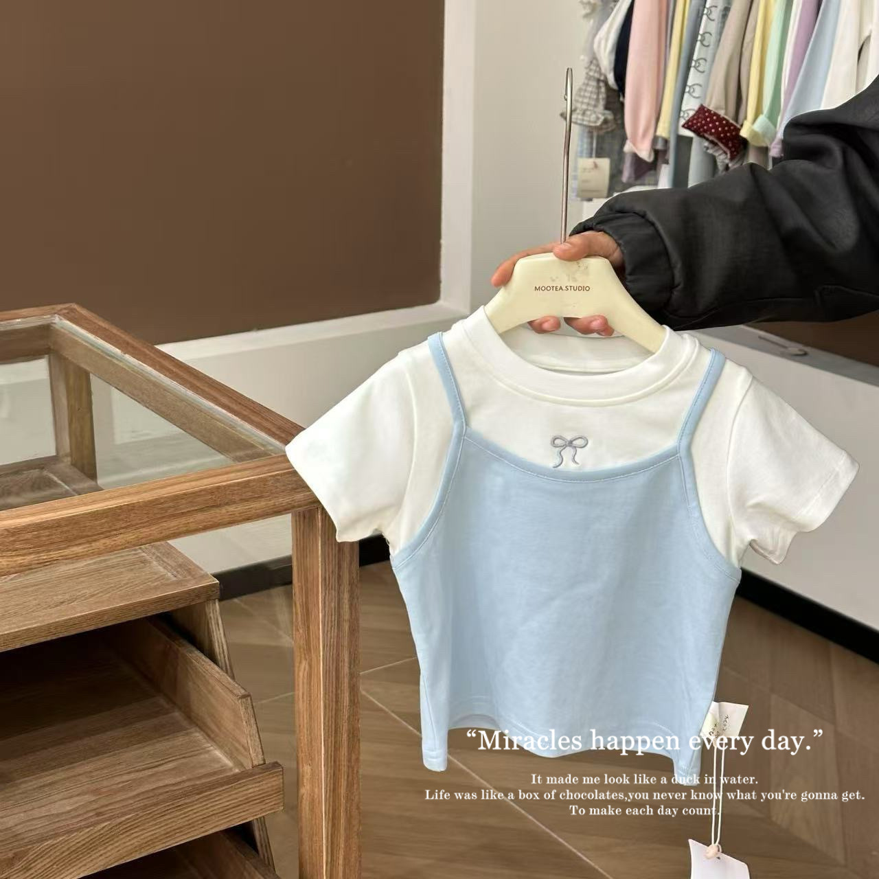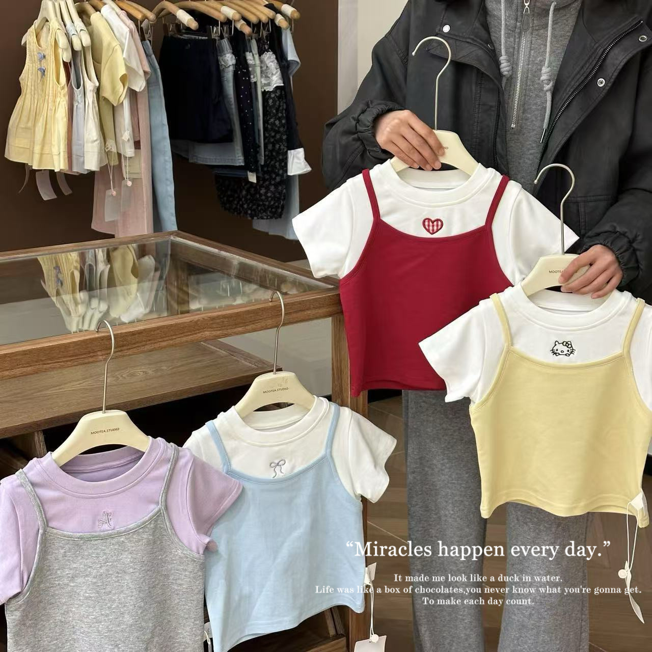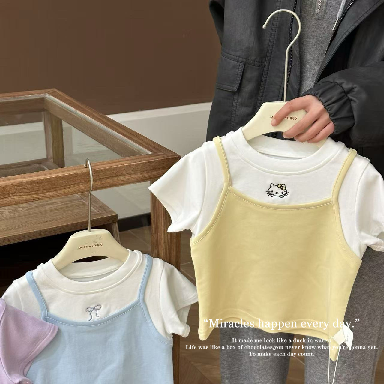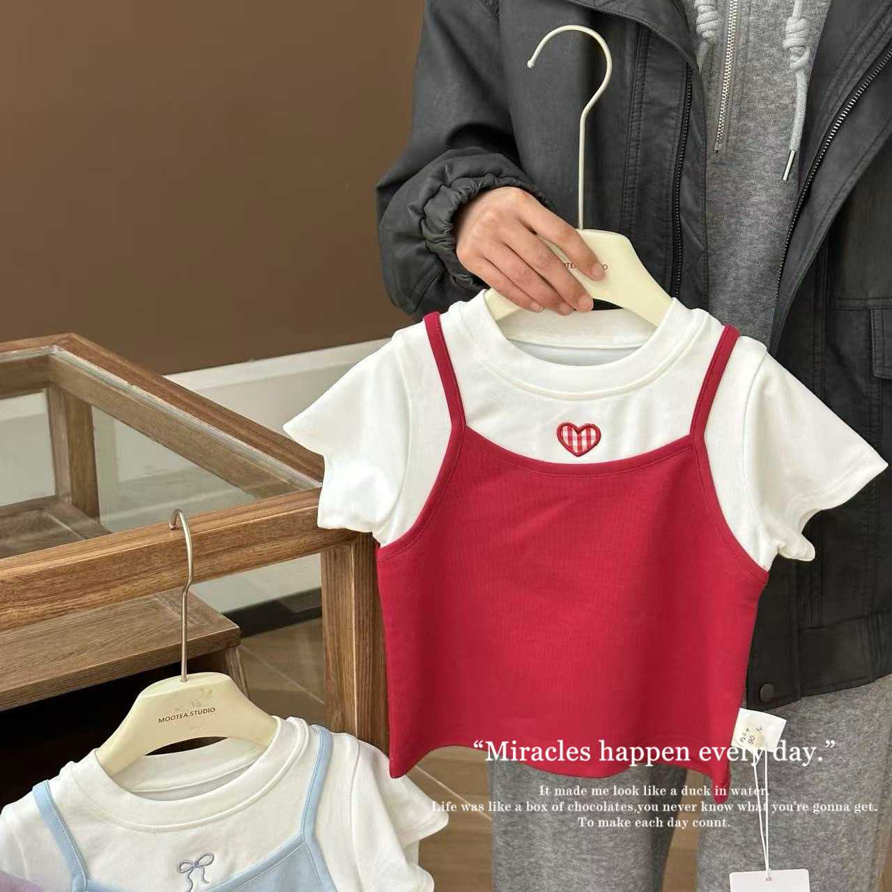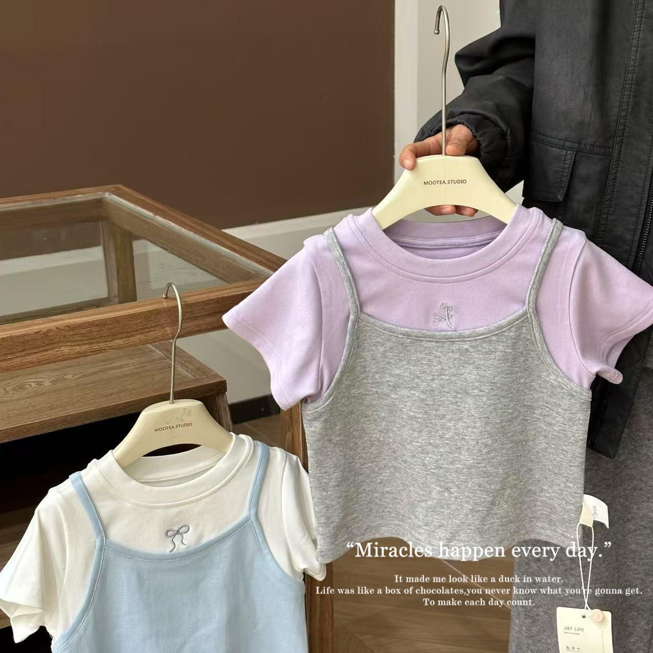 여자 2025 년 여름 새 한국 스타일 가짜 투피스 올매치 퓨어 코튼 티셔츠 서양식 여성 아기 소녀의 명암 반소매 탑스토어 가기