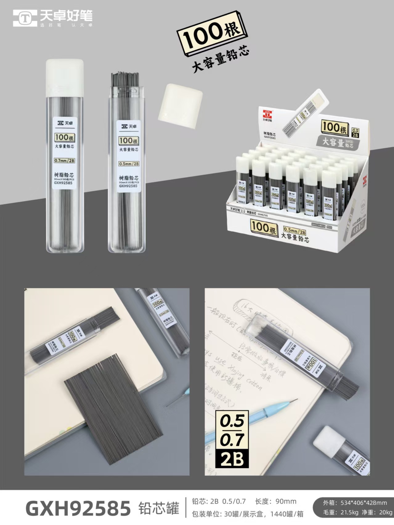 Tianzhuo 92585 수지 리필 2B 대용량 자동 연필 심 내구성 100 개의 이동식 심 연필 리필
