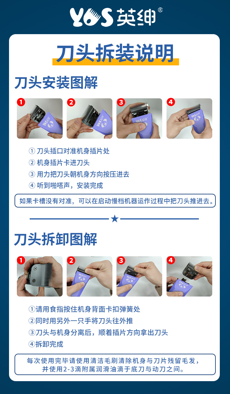 • Yingshen 940A 전기 이발기는 10-7-5-4가 기본으로 제공됩니다.