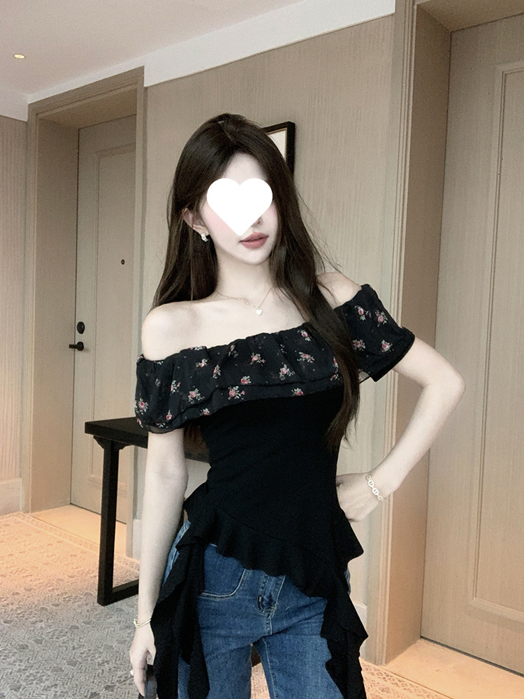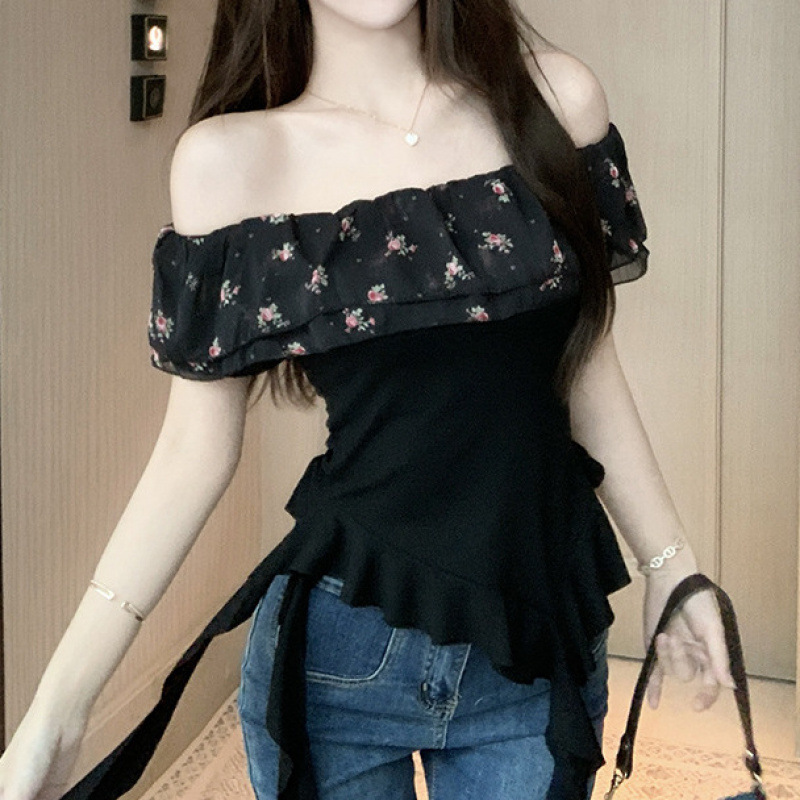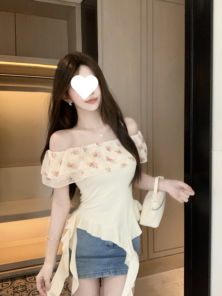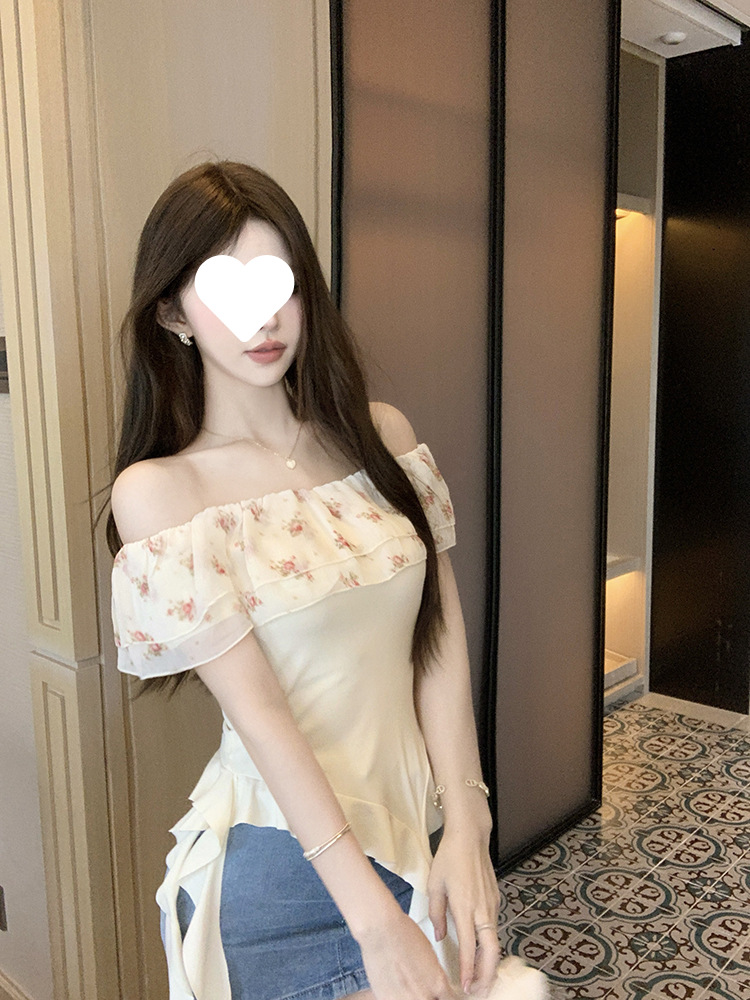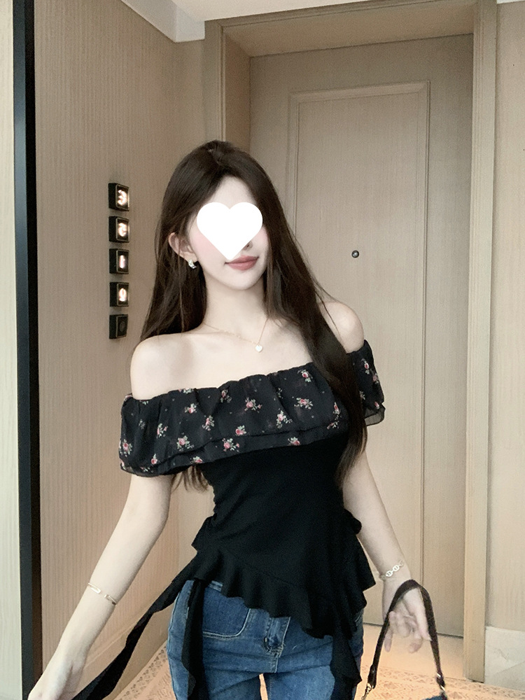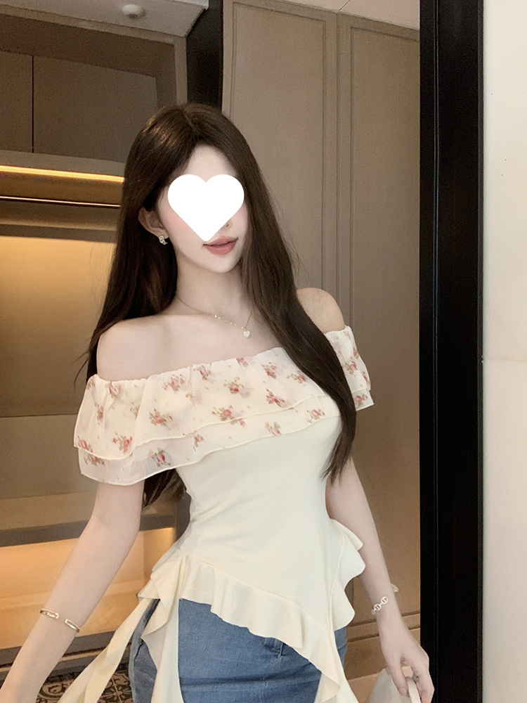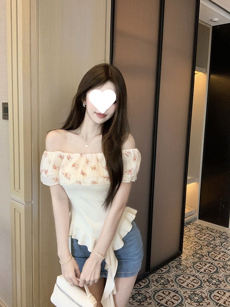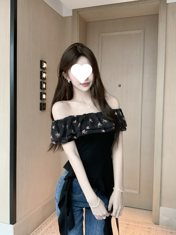 부드럽고 귀엽고 달콤한 원라인 칼라 오프숄더 탑, 목가적 스타일의 섹시한 휴가 불규칙한 리본 러플 꽃무늬 티셔츠