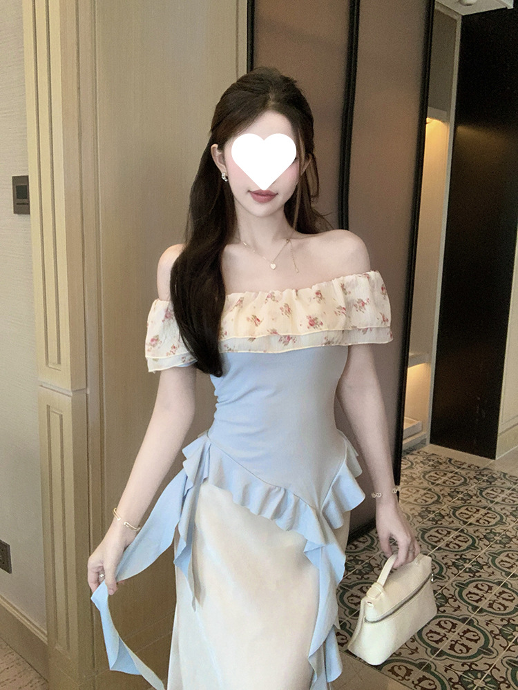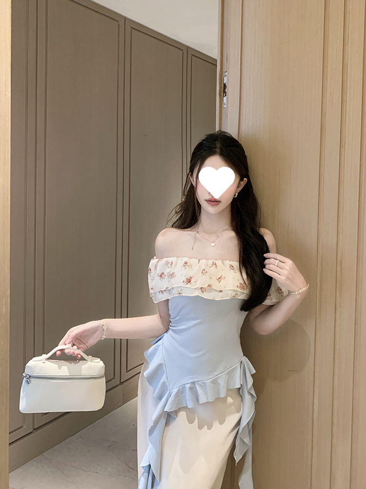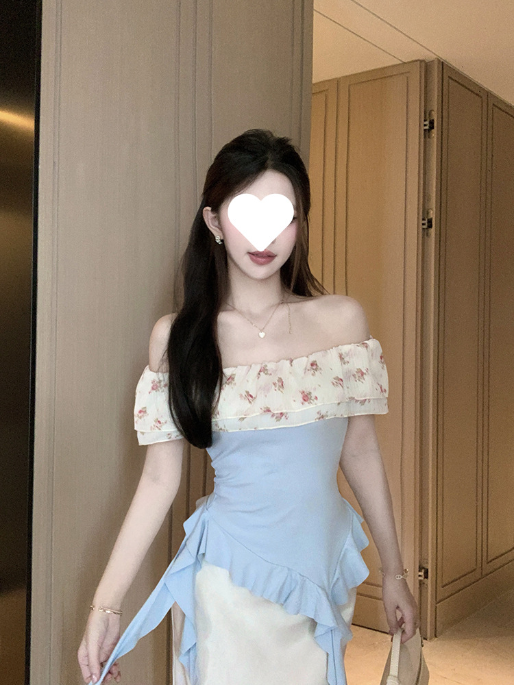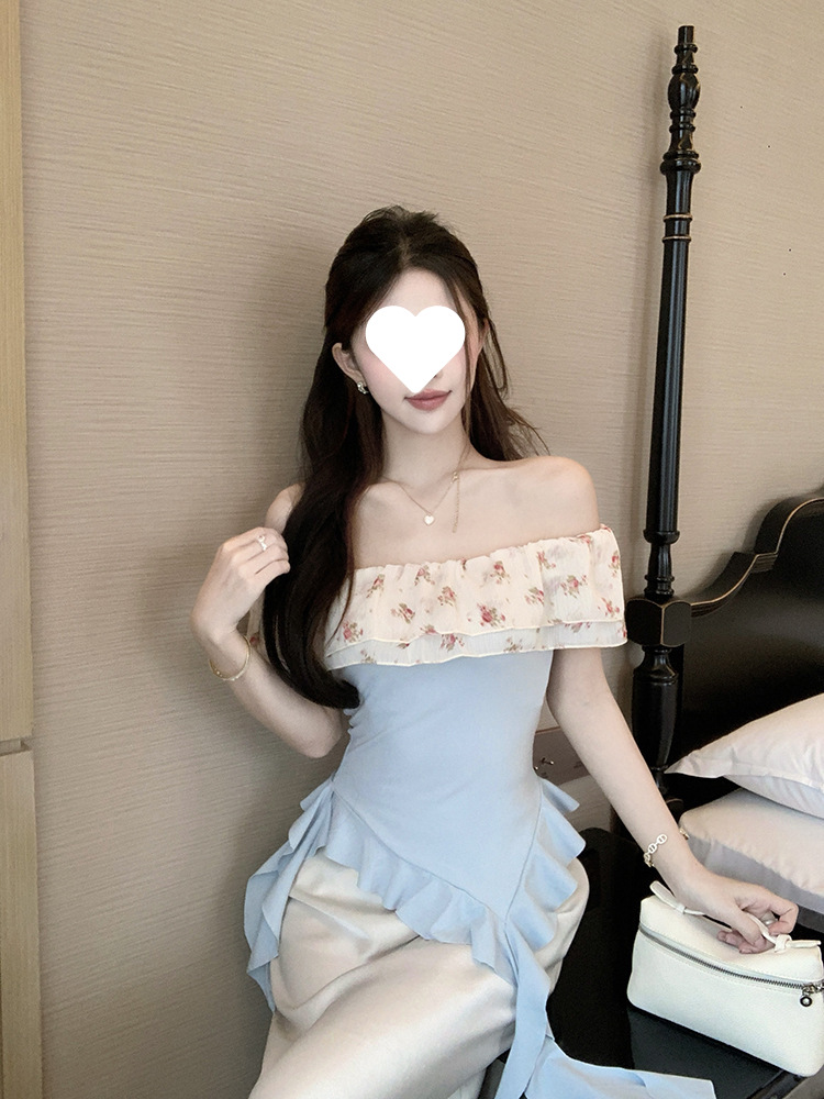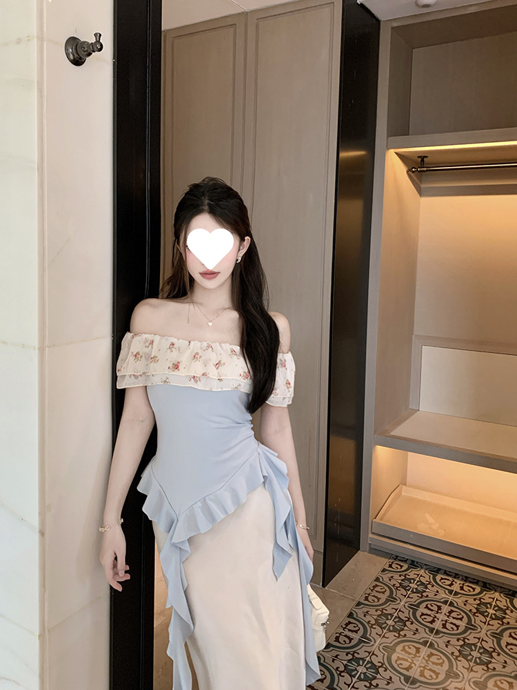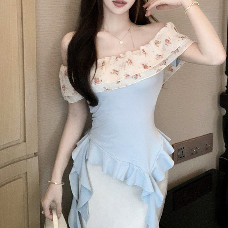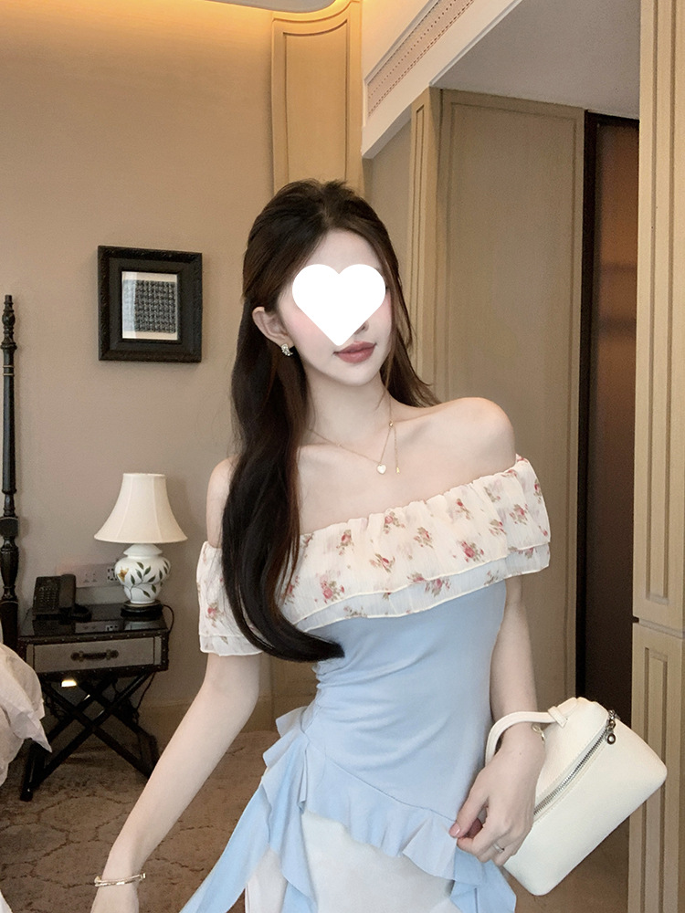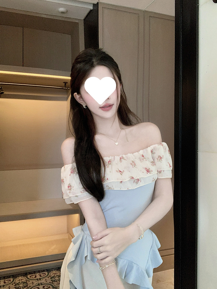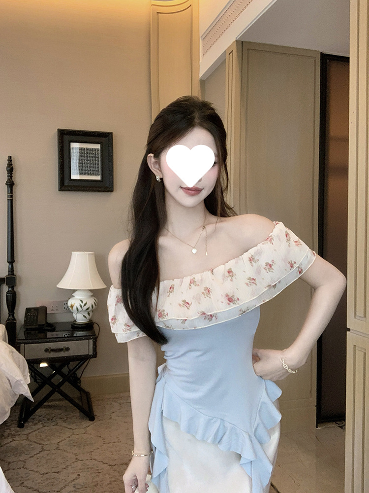 부드럽고 귀엽고 달콤한 원라인 칼라 오프숄더 탑, 목가적 스타일의 섹시한 휴가 불규칙한 리본 러플 꽃무늬 티셔츠