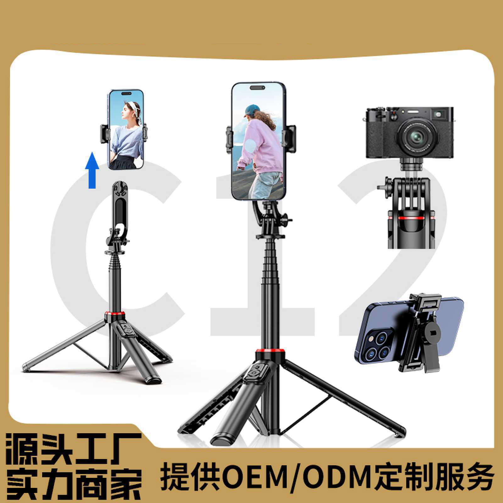 • [C12—검정색—1.3m ] 알루미늄 합금 텔레스코픽 폴 + 삼각대 + 리모콘 + 탈착식 클립 + 1/4 호환 커넥터
