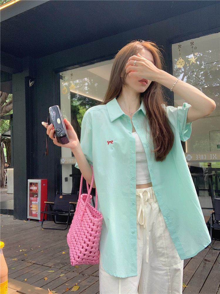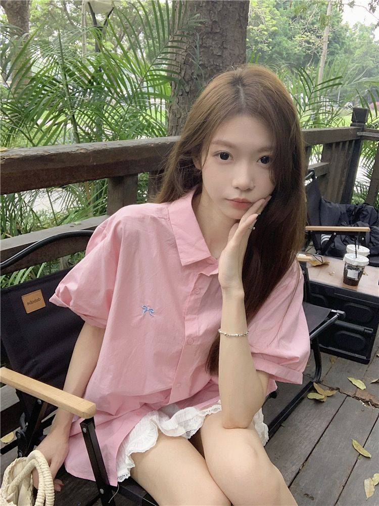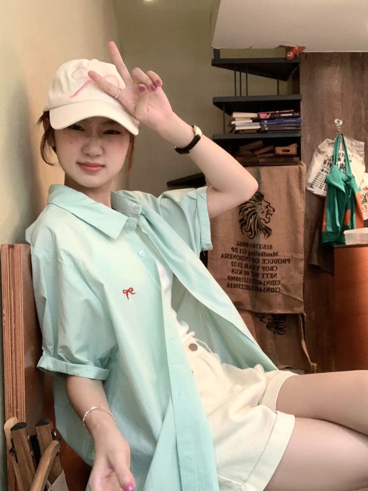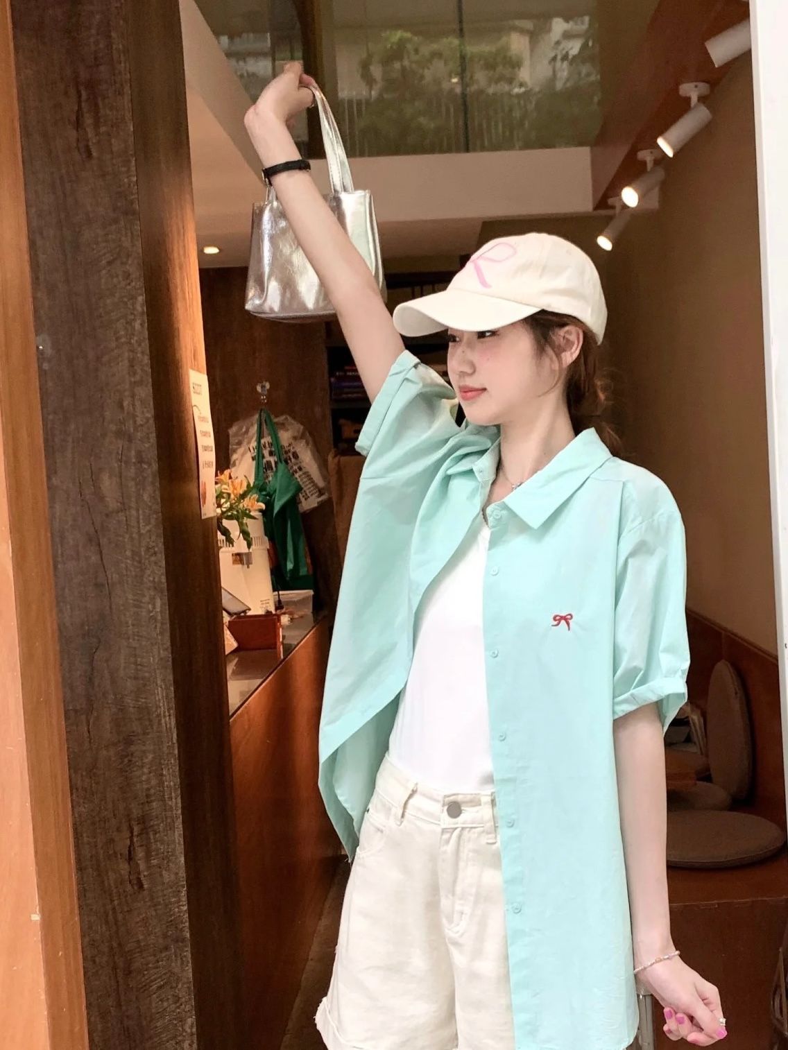 플러스 사이즈 반팔 셔츠 여성의 여름 느슨한 육체 커버 슬리밍 탑 통통한 여성 디자인 센스 도파민 선 스크린 셔츠스토어 가기