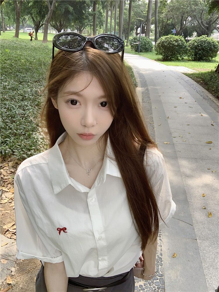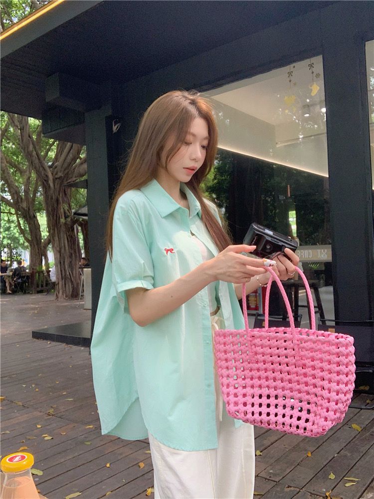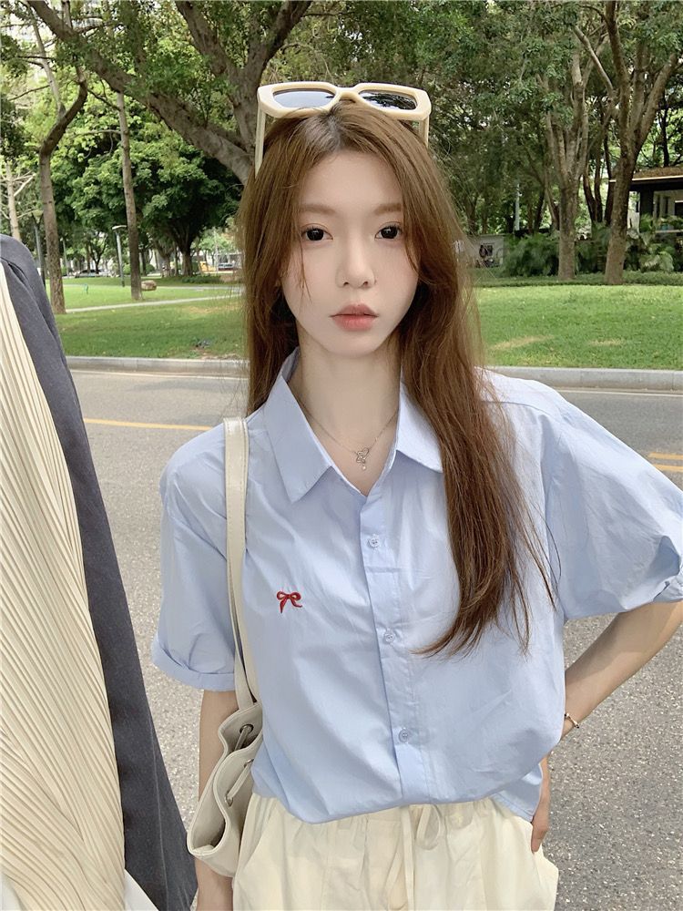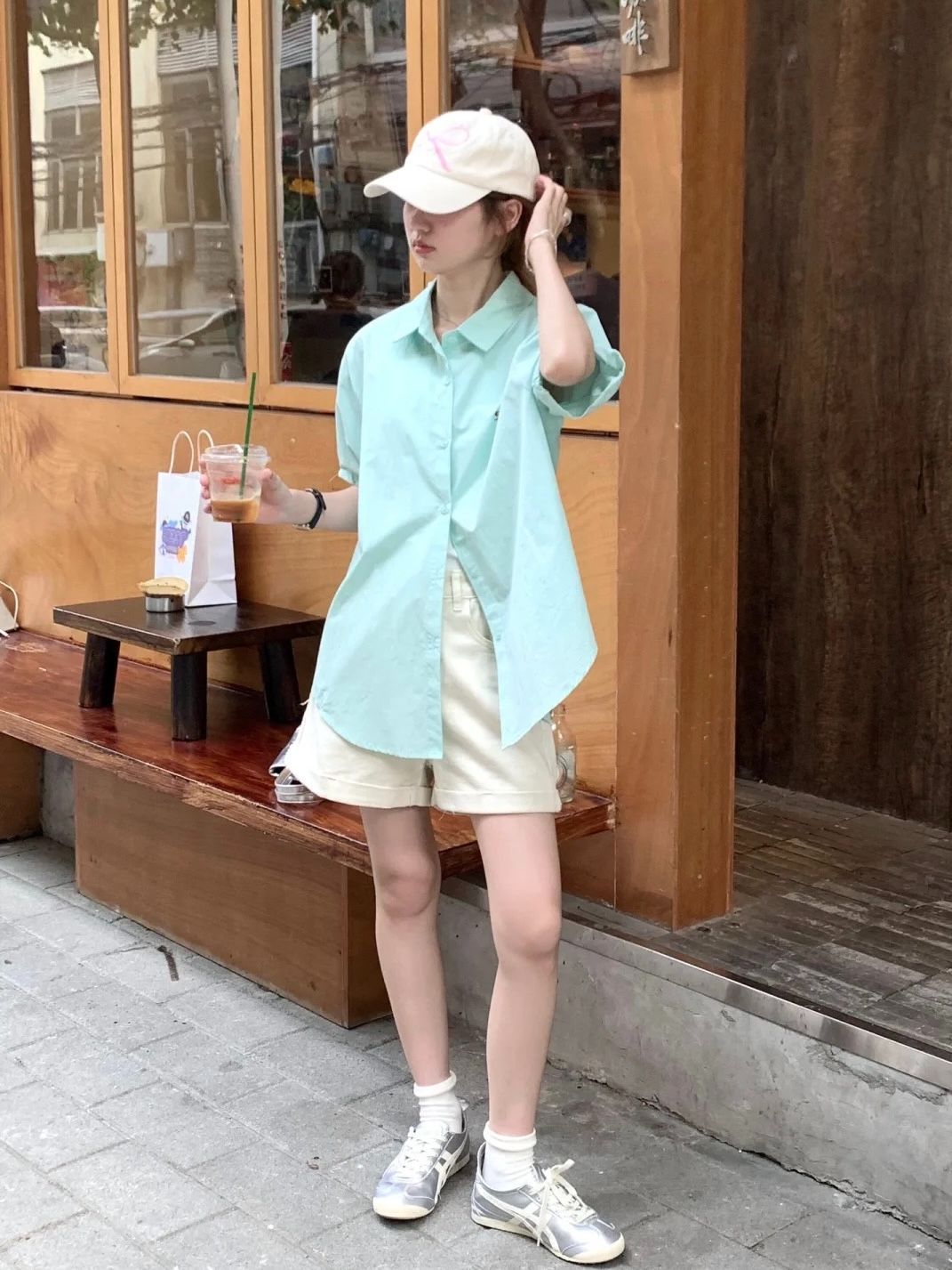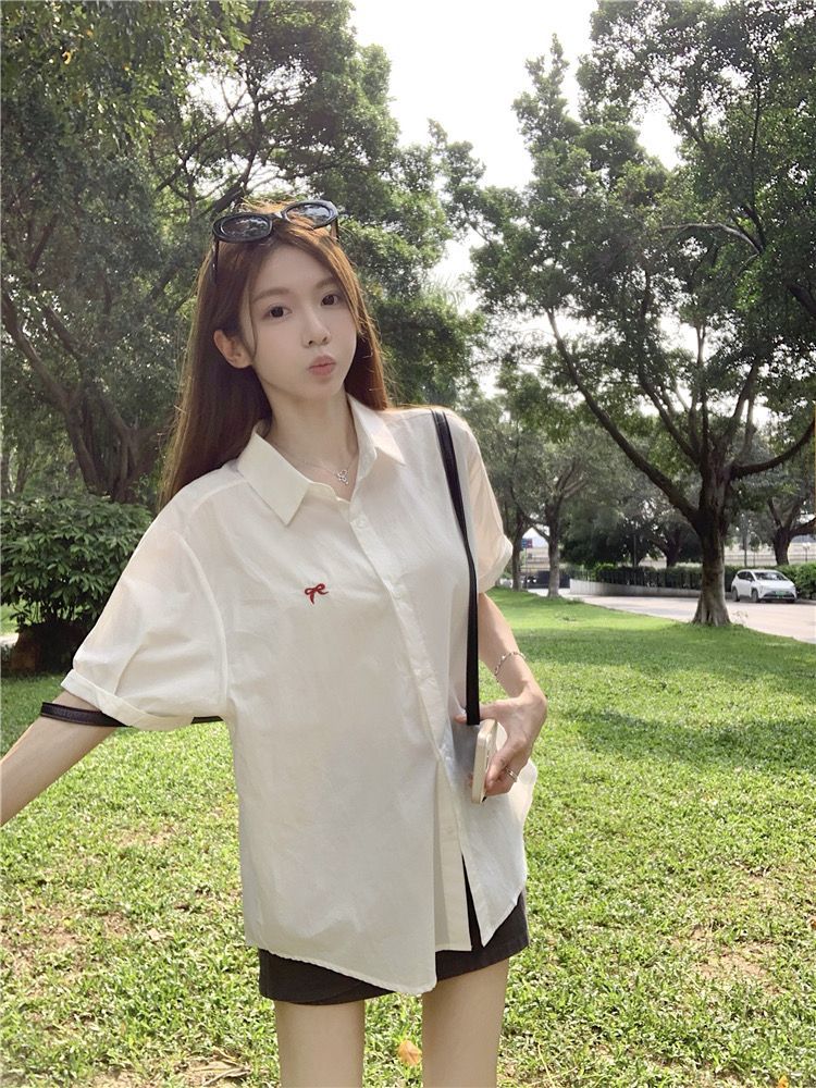 플러스 사이즈 반팔 셔츠 여성의 여름 느슨한 육체 커버 슬리밍 탑 통통한 여성 디자인 센스 도파민 선 스크린 셔츠스토어 가기
