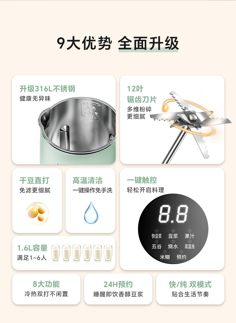 • 제품 장점: 업그레이드된 316L 내부 탱크, 1.6L 대용량, 304 내부 강철 상부 커버, 대형 스크린 디스플레이, 12블레이드 커터 헤드