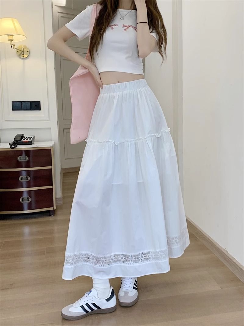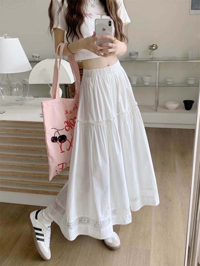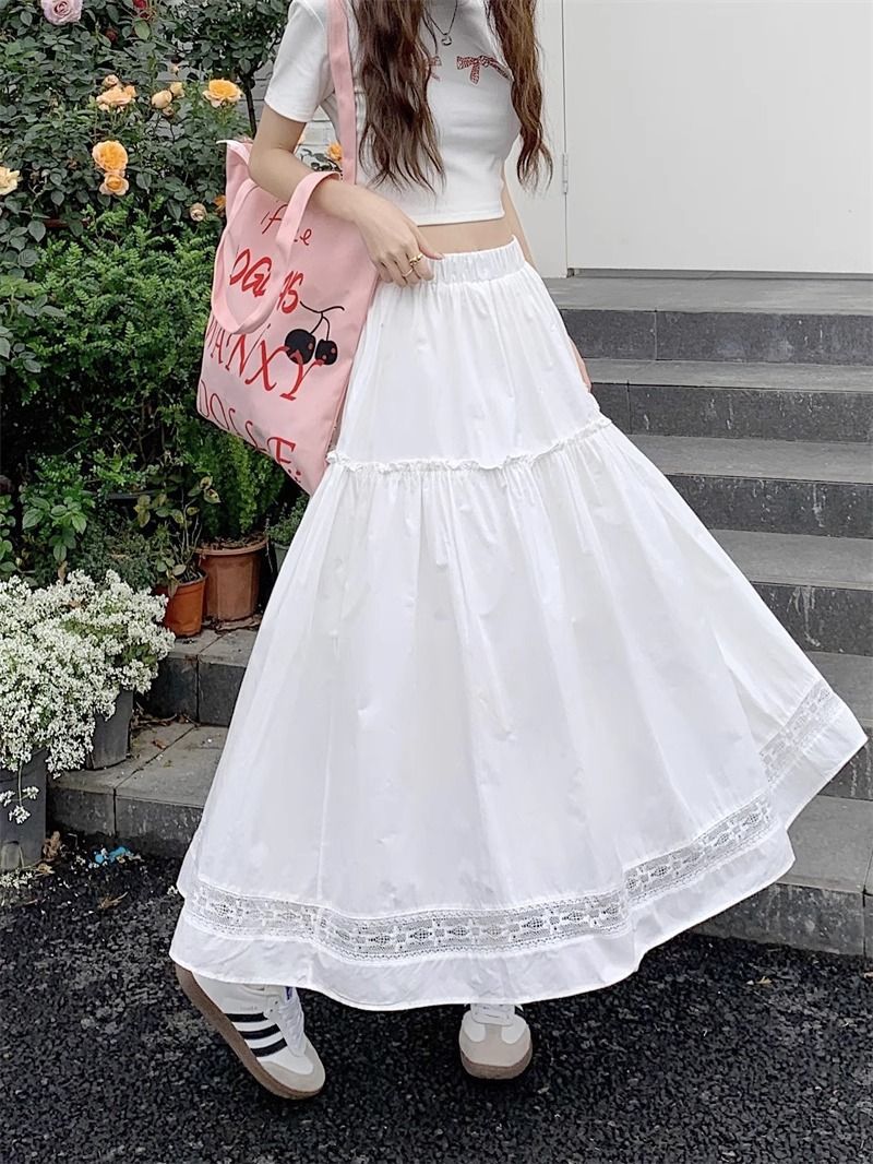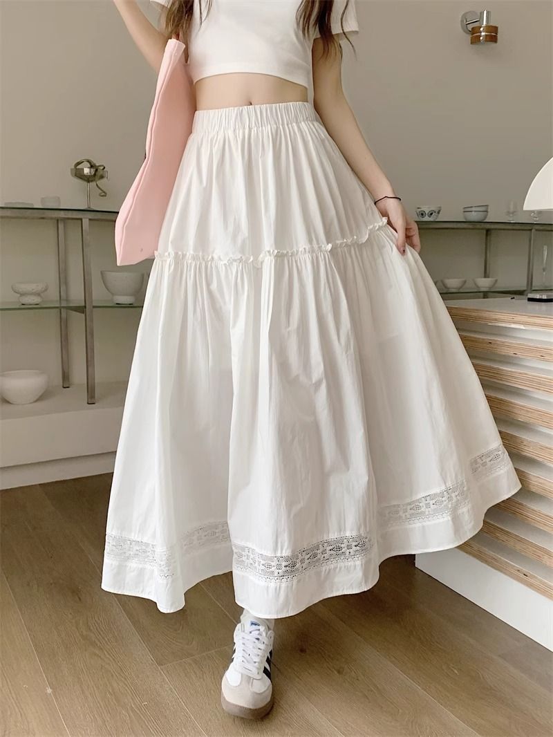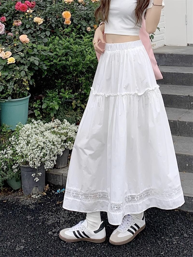 2026 신상 화이트 레이스 패치워크 스커트 여성용 하이웨이스트 A라인 롱 스커트 케이크 스커트스토어 가기