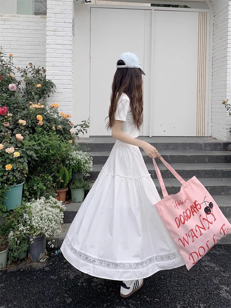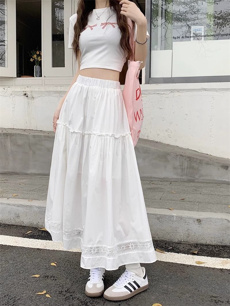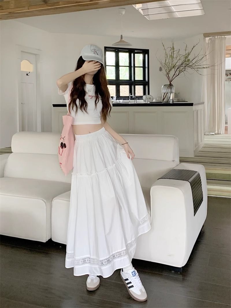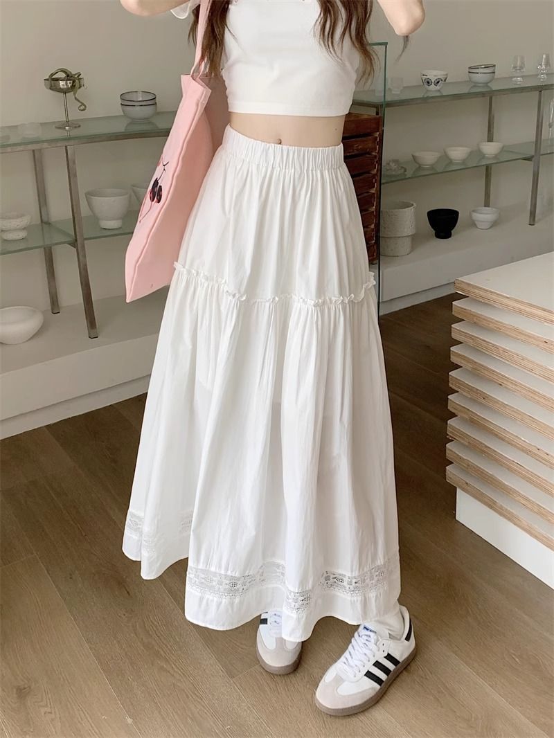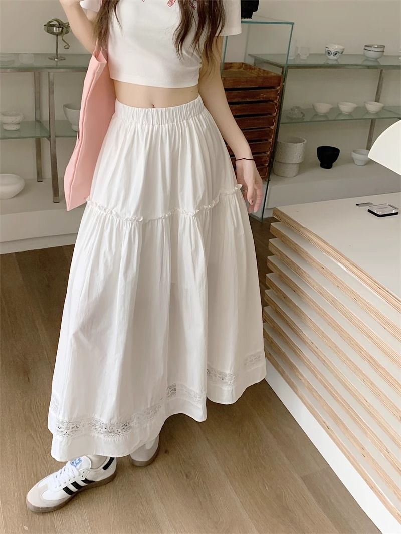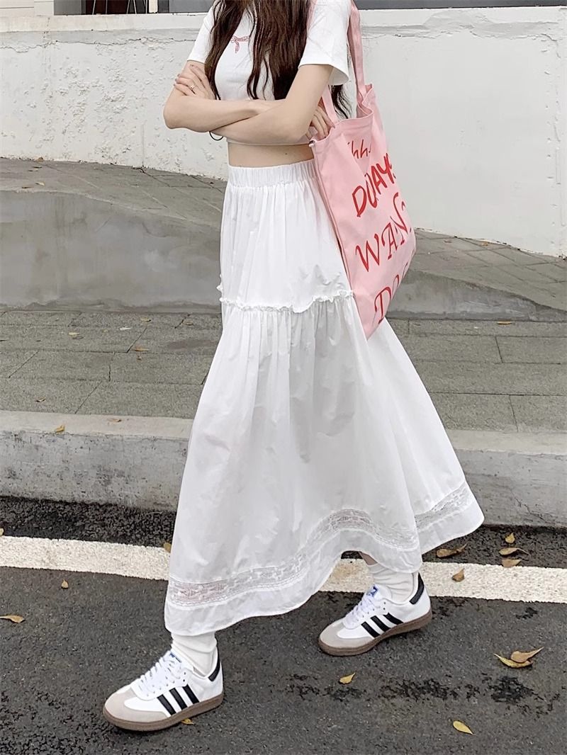 2026 신상 화이트 레이스 패치워크 스커트 여성용 하이웨이스트 A라인 롱 스커트 케이크 스커트스토어 가기