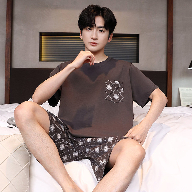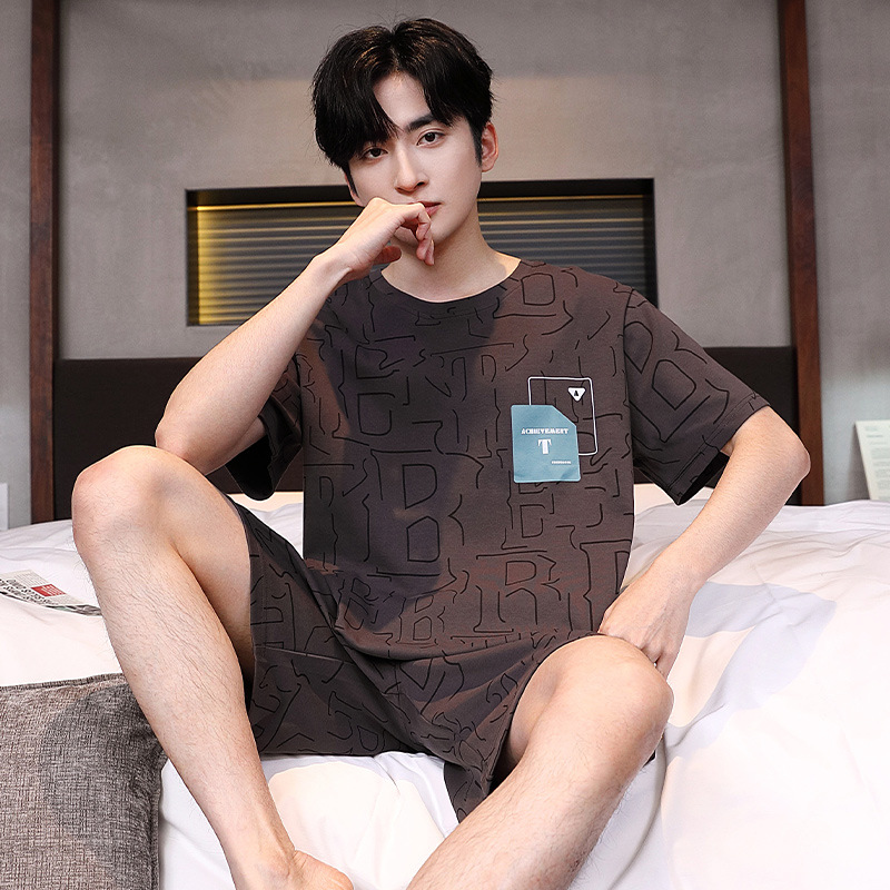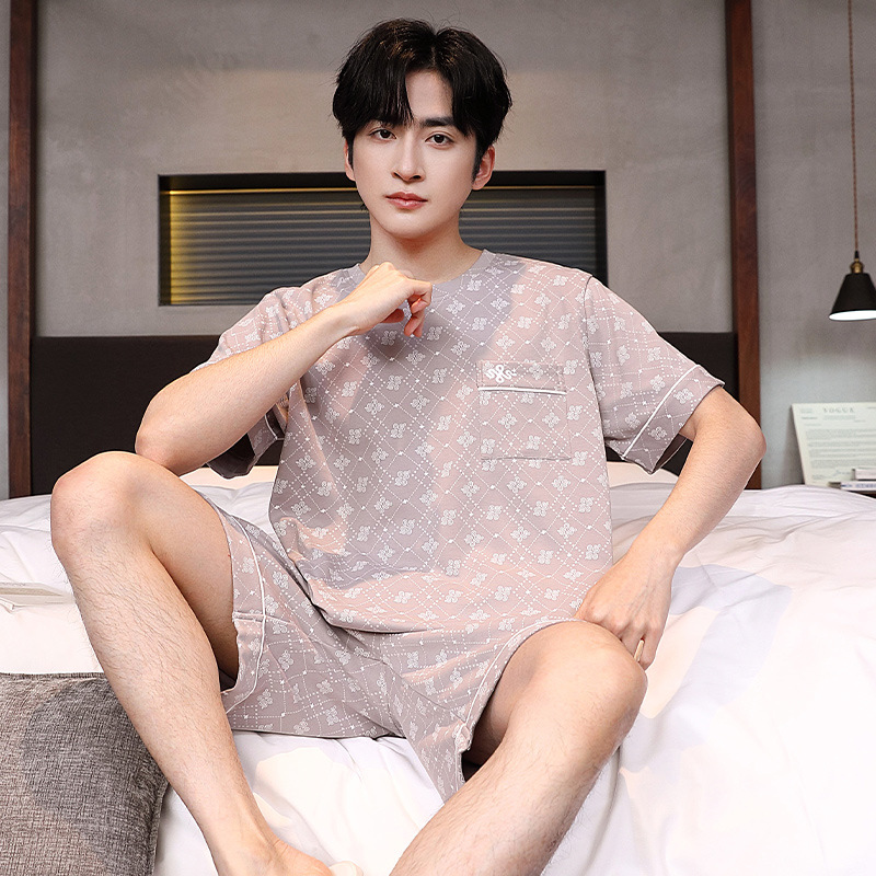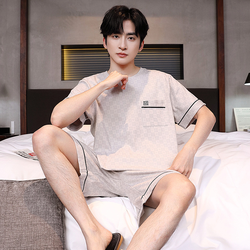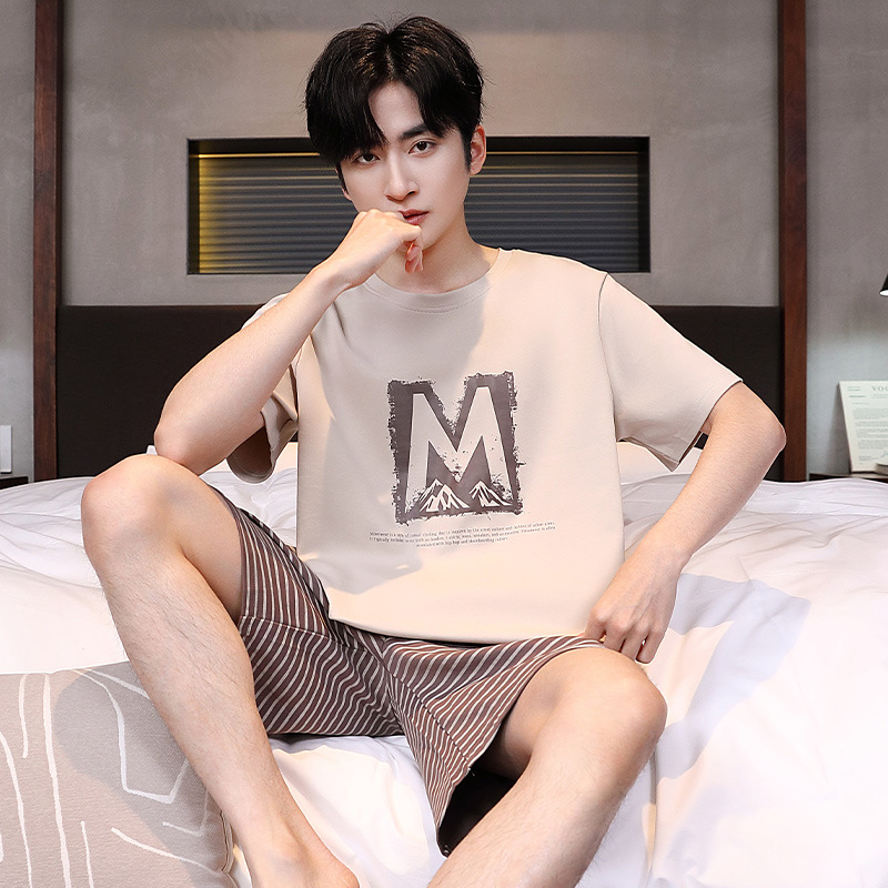공장 직접 판매 여름 신제품 남성 잠옷 간단하고 편안한 느슨한 반팔 바지 라운드 넥 홈웨어 세트