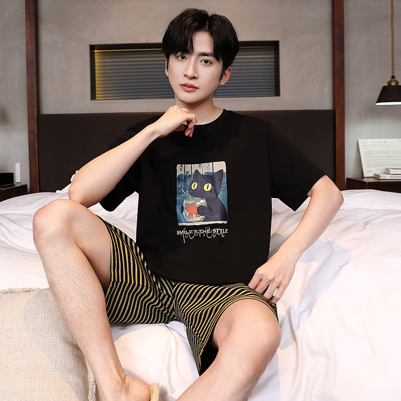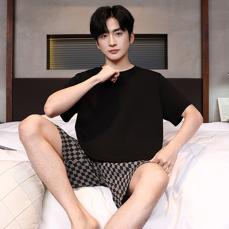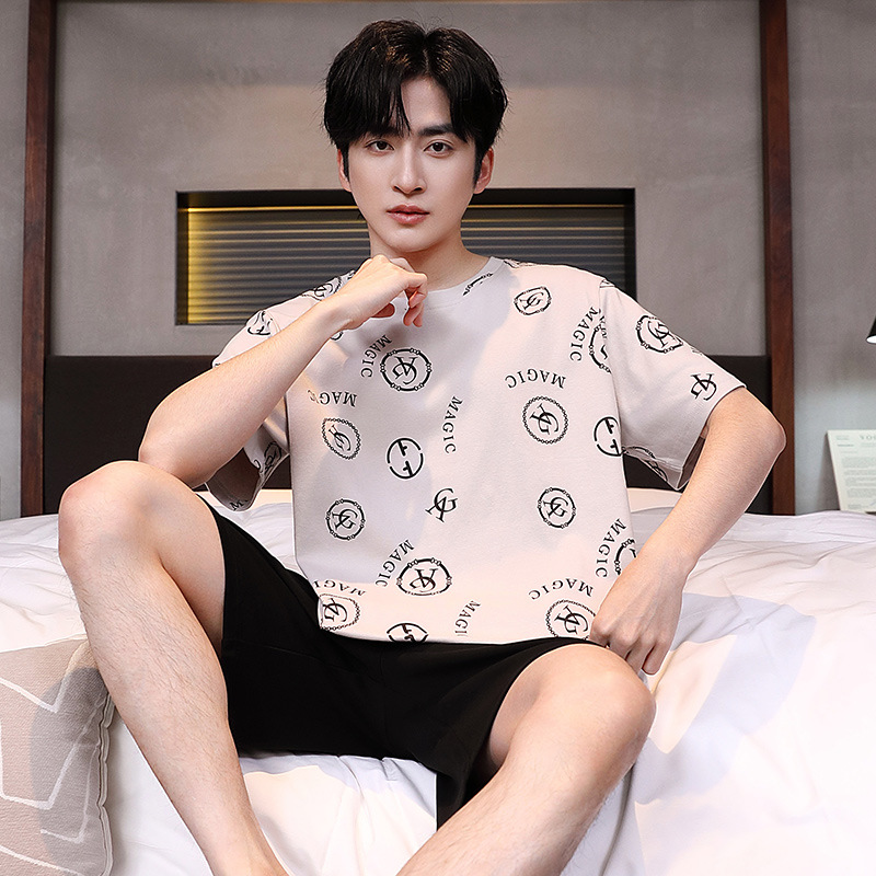 공장 직접 판매 여름 신제품 남성 잠옷 간단하고 편안한 느슨한 반팔 바지 라운드 넥 홈웨어 세트스토어 가기