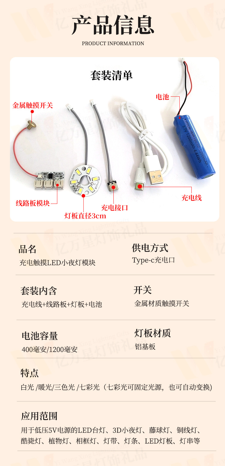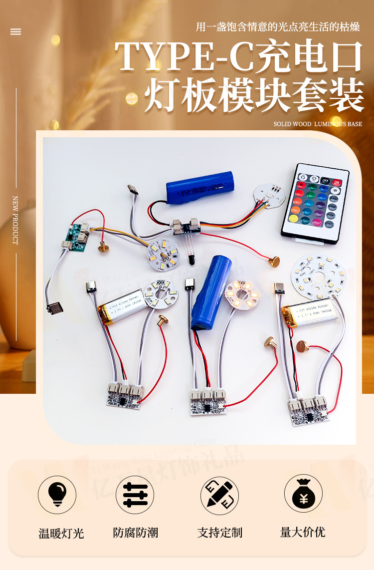 • 따뜻한 빛 3W(리튬 배터리 + 회로 기판 + USB 충전 케이블) - Typec