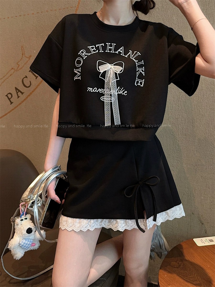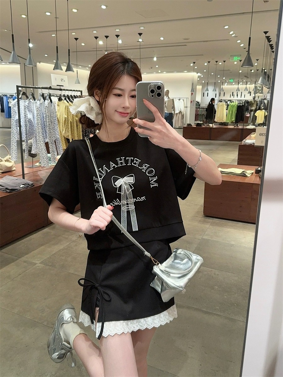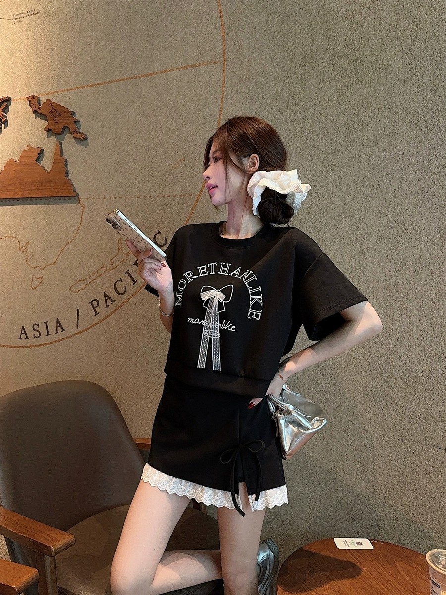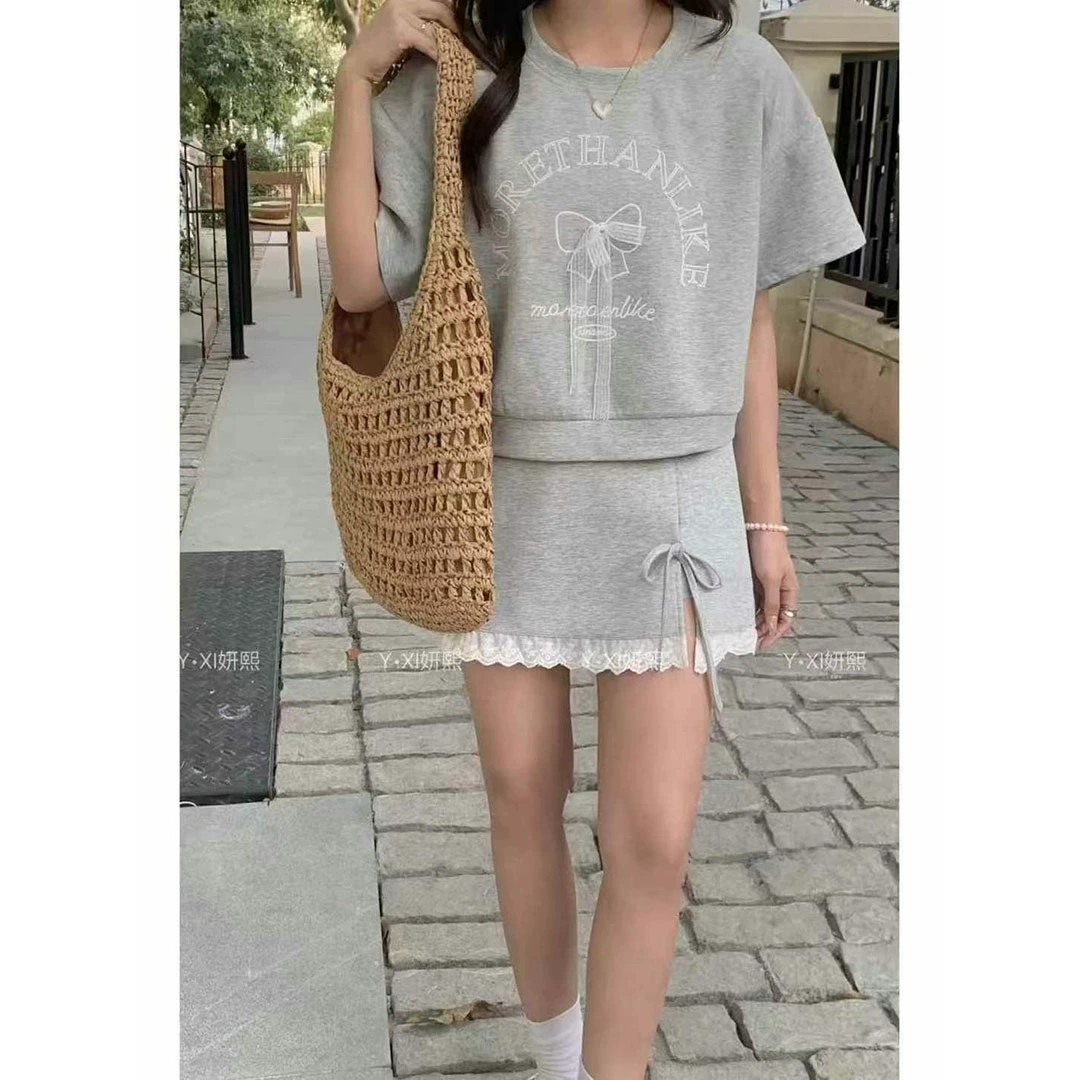 대학 스타일 활 편지 인쇄 반팔 티셔츠 레이스 바느질 치마 여성의 2025 여름 새 세트