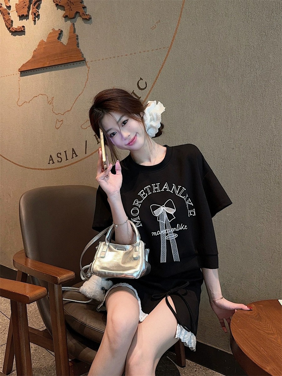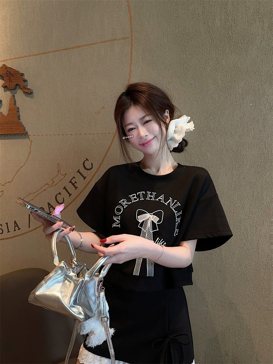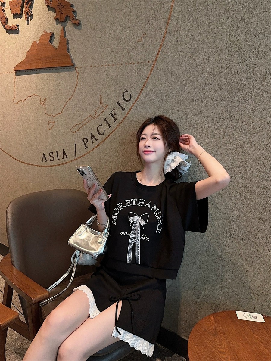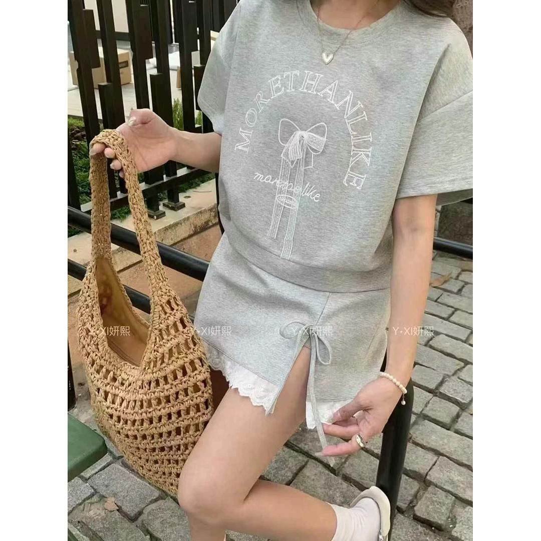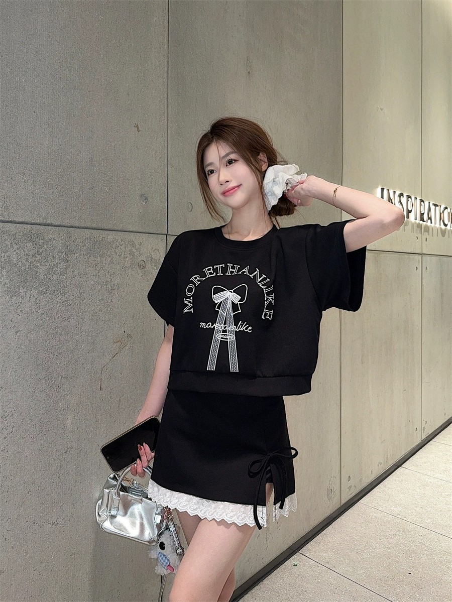 대학 스타일 활 편지 인쇄 반팔 티셔츠 레이스 바느질 치마 여성의 2025 여름 새 세트