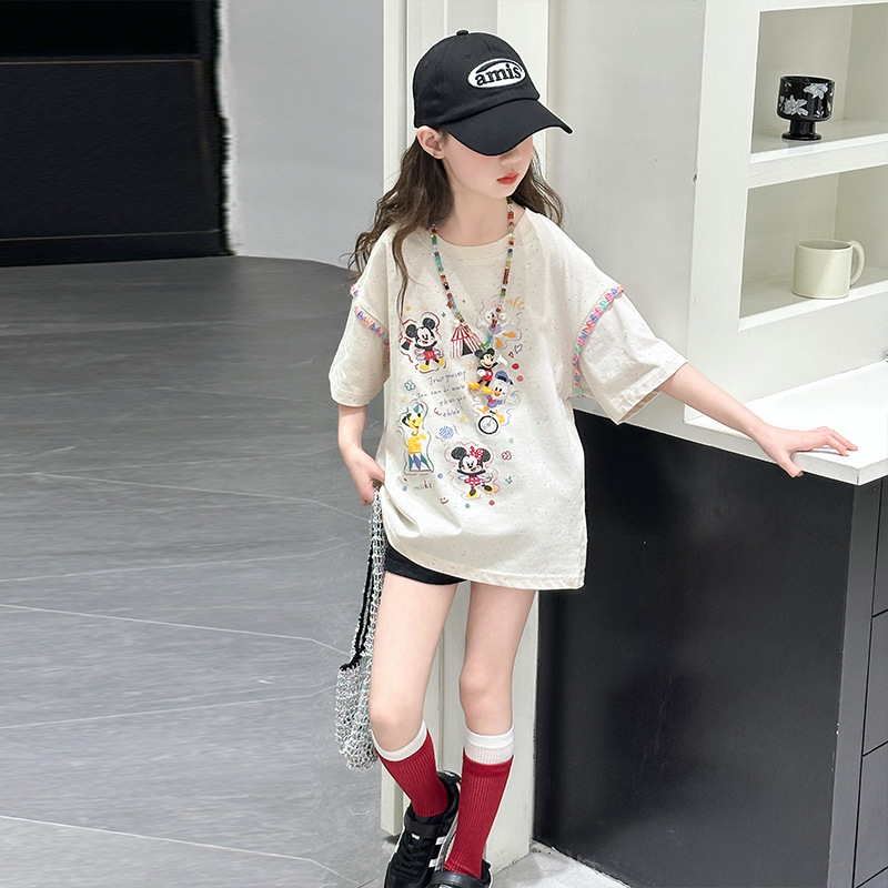 여자 여름 얇은 티셔츠 한국 만화 반팔 2025 새로운 여름 새로운 부드럽고 세련된 느슨한 아동 의류스토어 가기