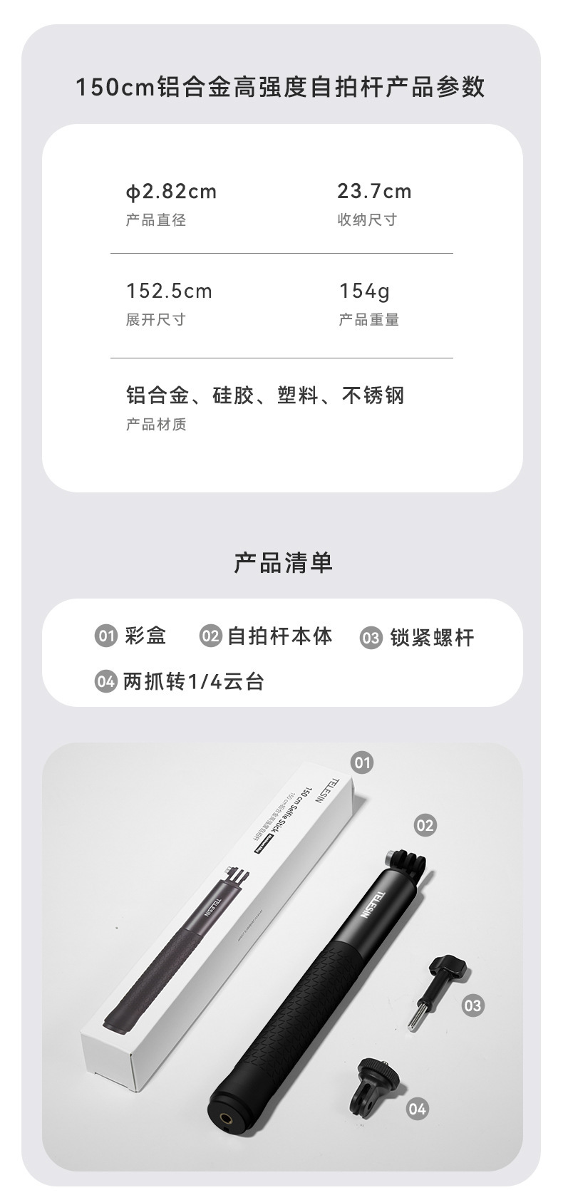 TELESIN 촬영 셀카 스틱 브래킷 0.9m1.2m1.5m 라이브 사진 비디오 휴대 전화 유니버설 셀카 스틱