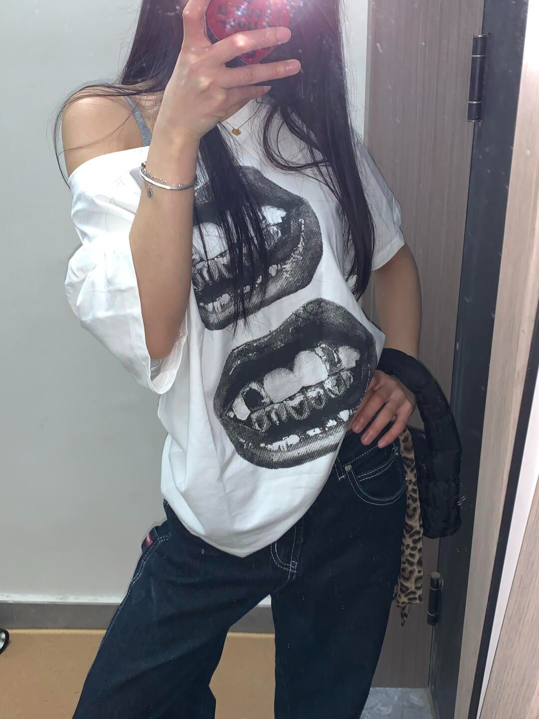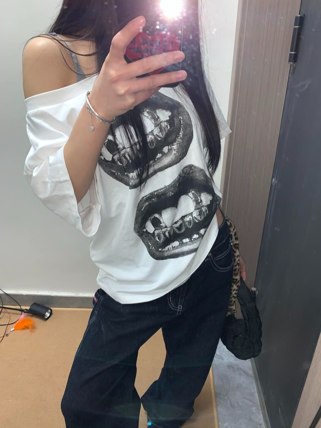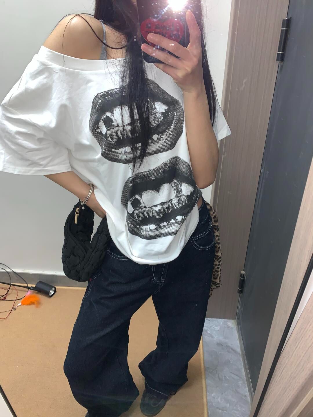 여름 여성을 위한 아메리칸 레트로 슬랜트 숄더 티셔츠 새로운 스타일의 더블 립 프린트 오프 숄더 반팔 루즈 슬리밍 핫 걸 탑 트렌디스토어 가기