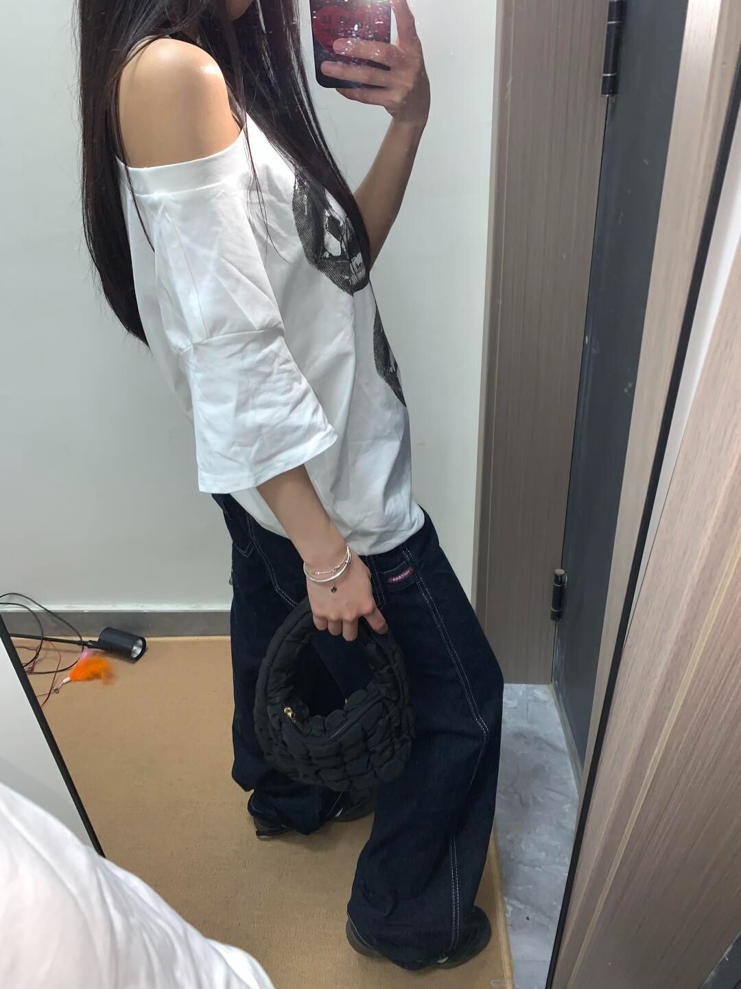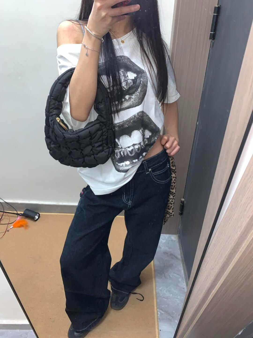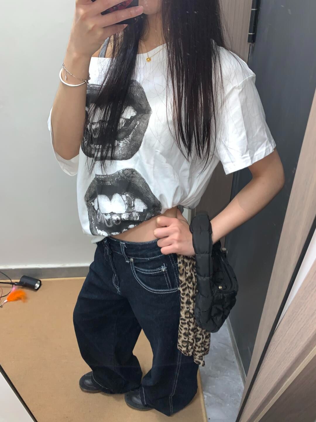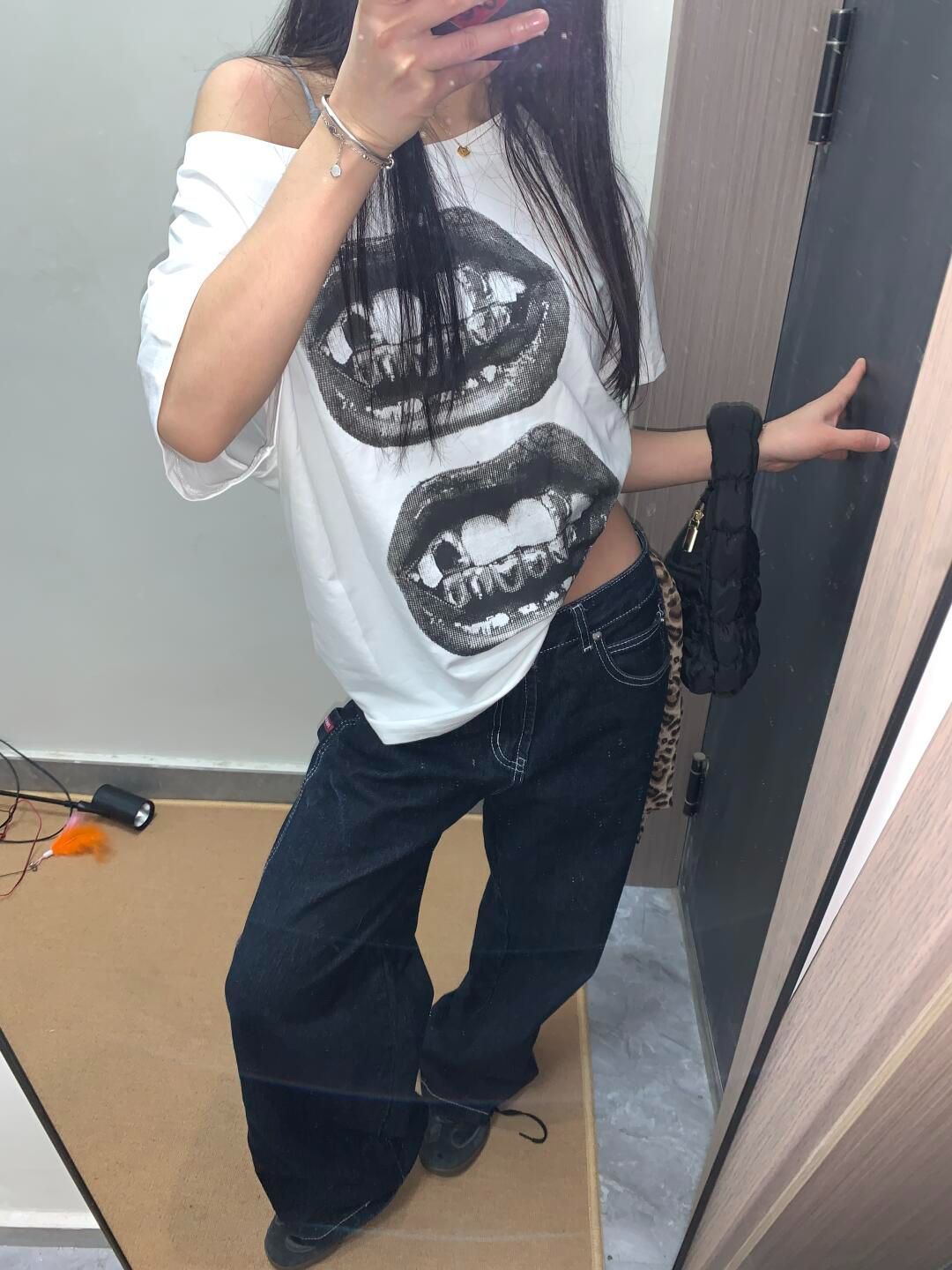 여름 여성을 위한 아메리칸 레트로 슬랜트 숄더 티셔츠 새로운 스타일의 더블 립 프린트 오프 숄더 반팔 루즈 슬리밍 핫 걸 탑 트렌디스토어 가기