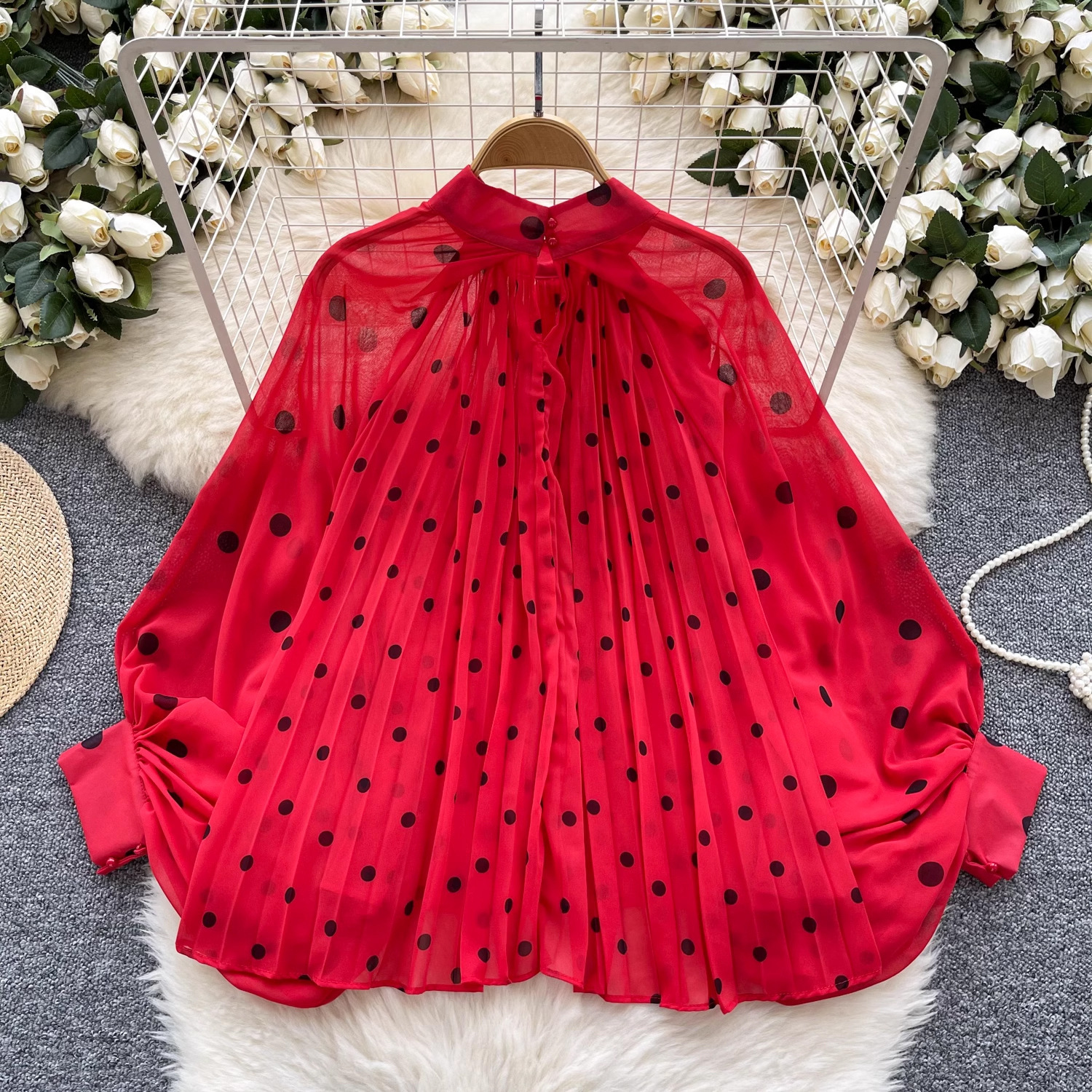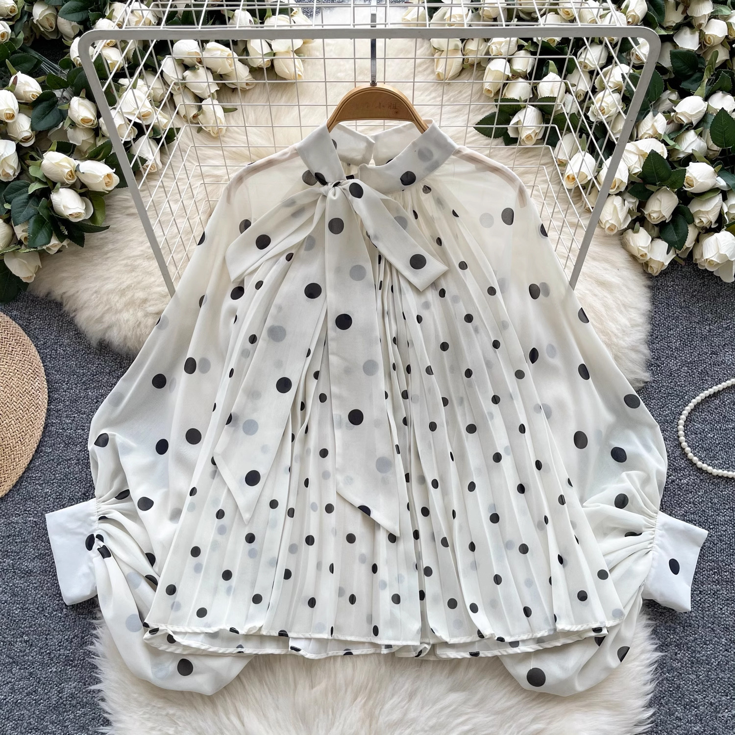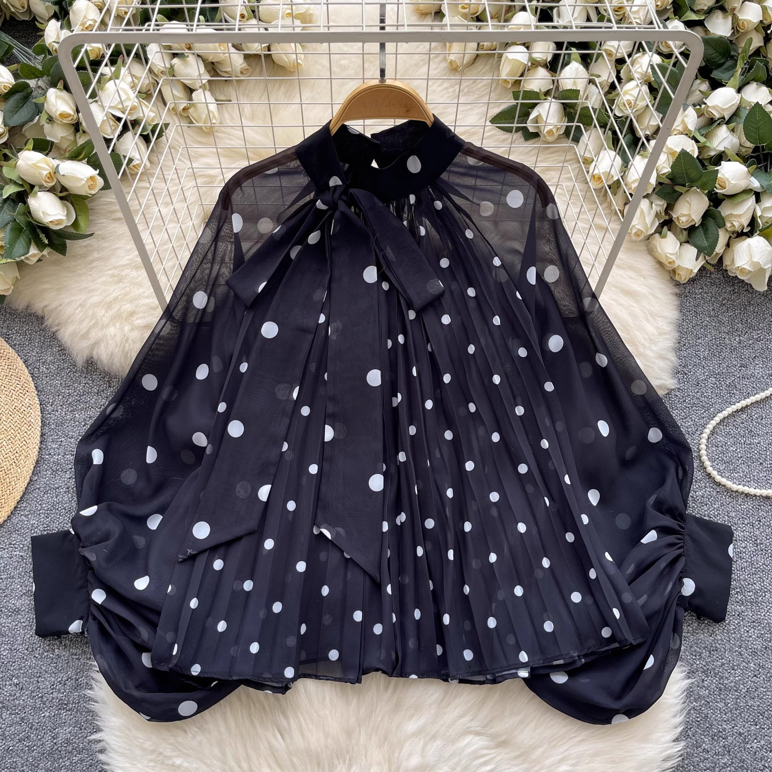 유럽과 미국 스타일 최고의 여자 가을 올 매치 쉬폰 셔츠 유행 활 스트랩 랜턴 슬리브 폴라 도트 셔츠 여성