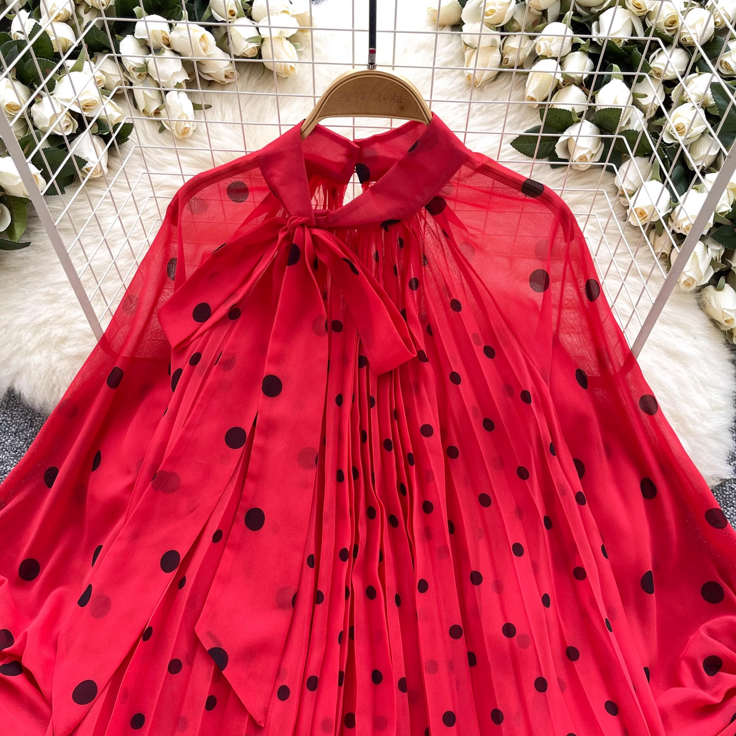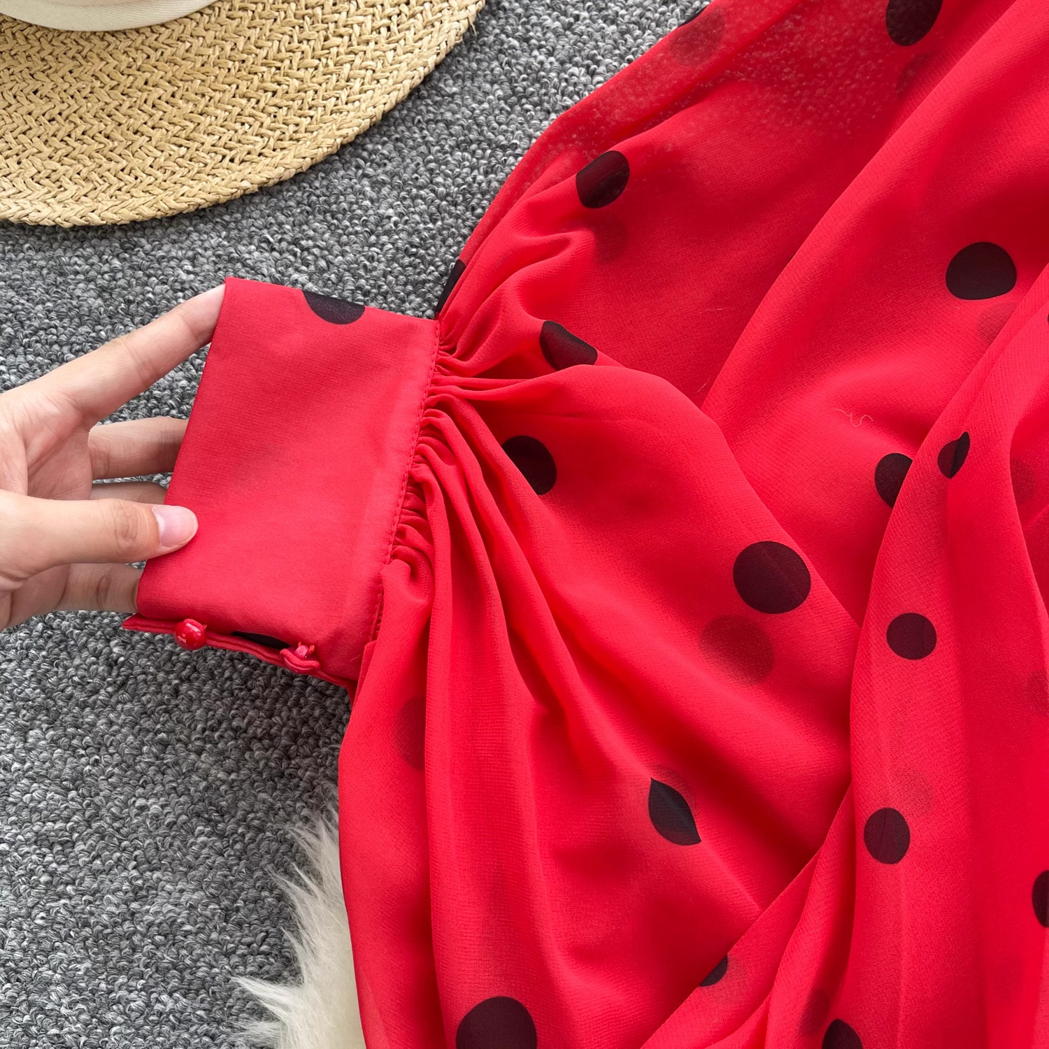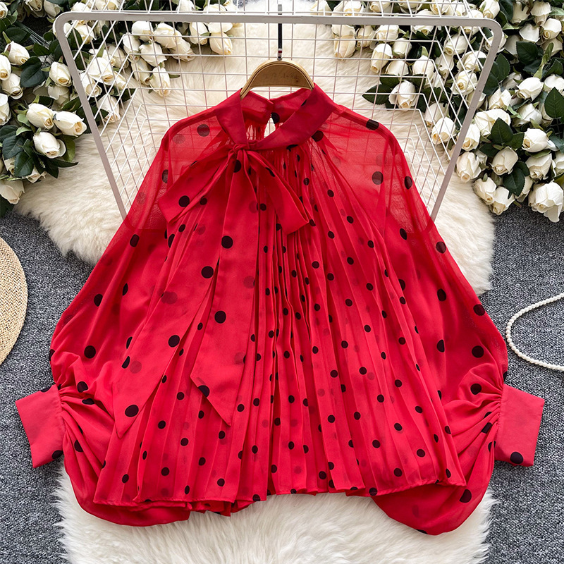 유럽과 미국 스타일 최고의 여자 가을 올 매치 쉬폰 셔츠 유행 활 스트랩 랜턴 슬리브 폴라 도트 셔츠 여성스토어 가기