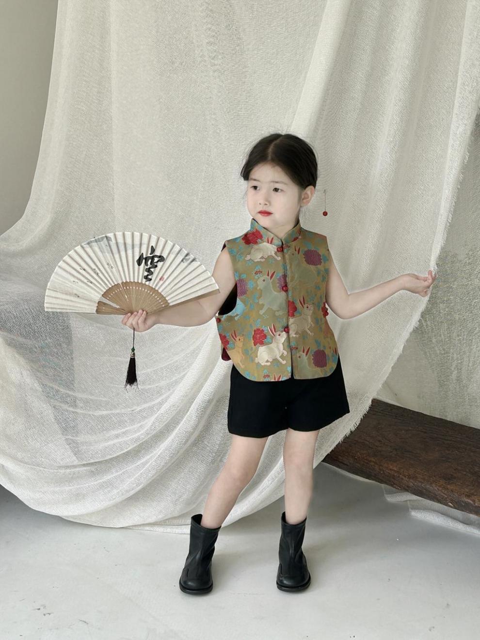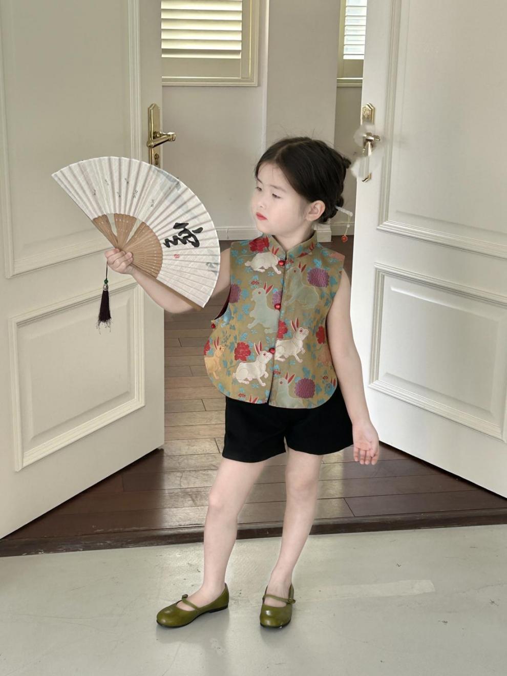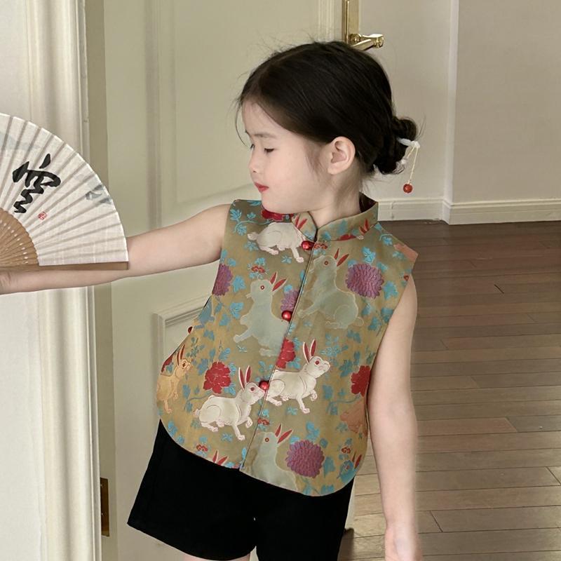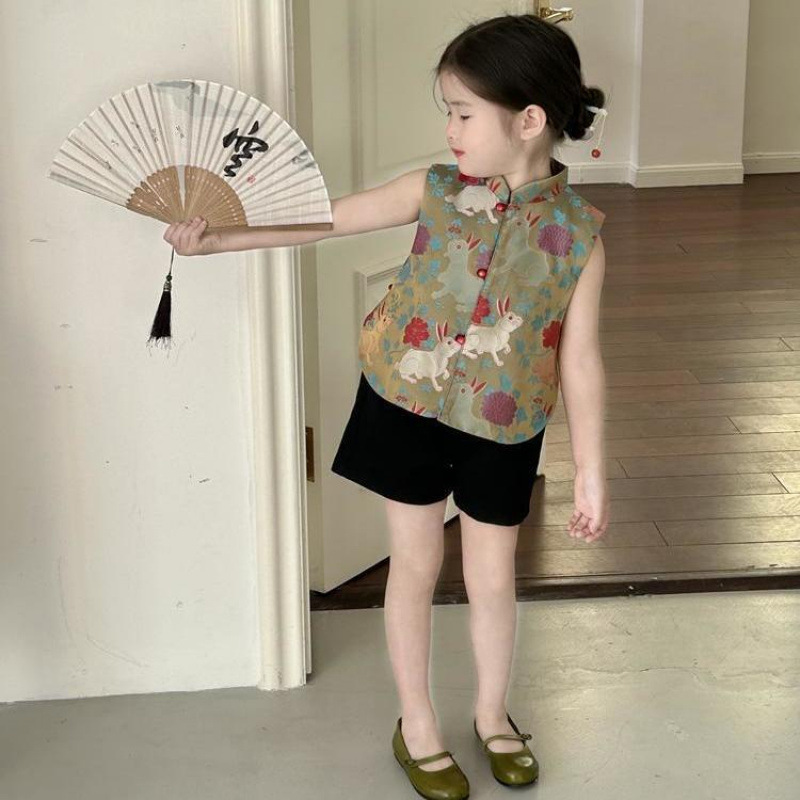 여자 새로운 중국 스타일 옥 토끼 조끼 여름 옷 2025 새로운 어린이 국가 스타일 버클 조끼 정장 여름 아기 소녀스토어 가기