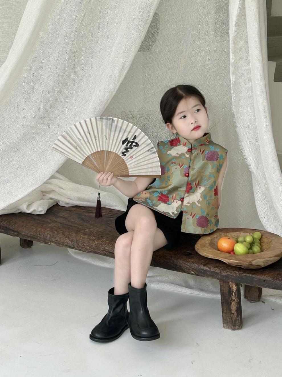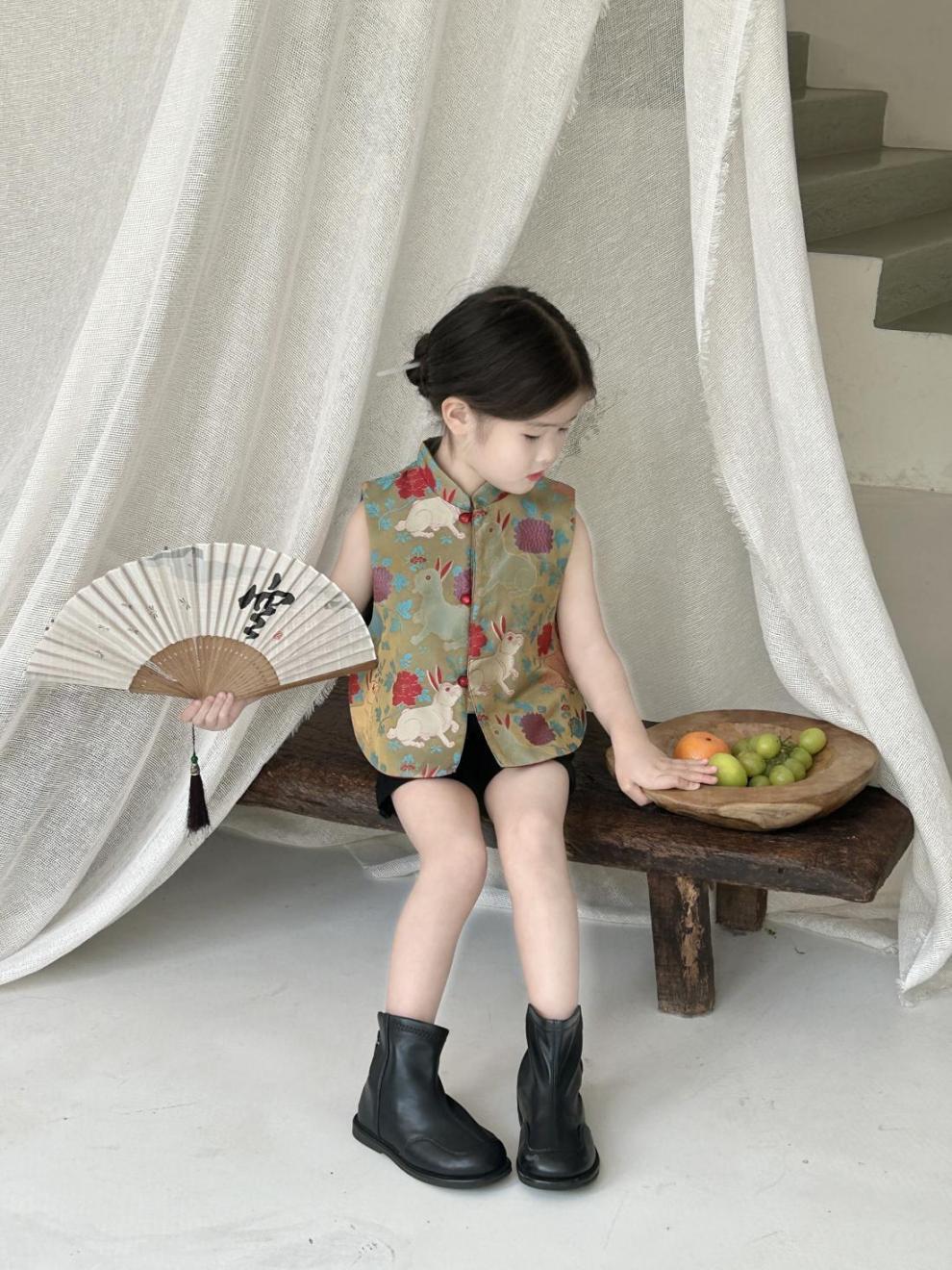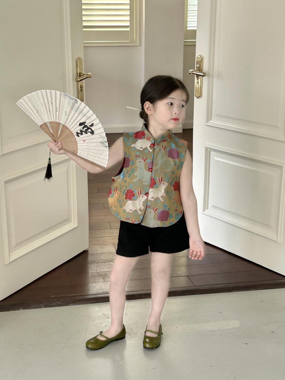 여자 새로운 중국 스타일 옥 토끼 조끼 여름 옷 2025 새로운 어린이 국가 스타일 버클 조끼 정장 여름 아기 소녀스토어 가기