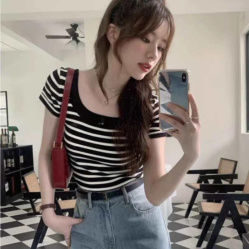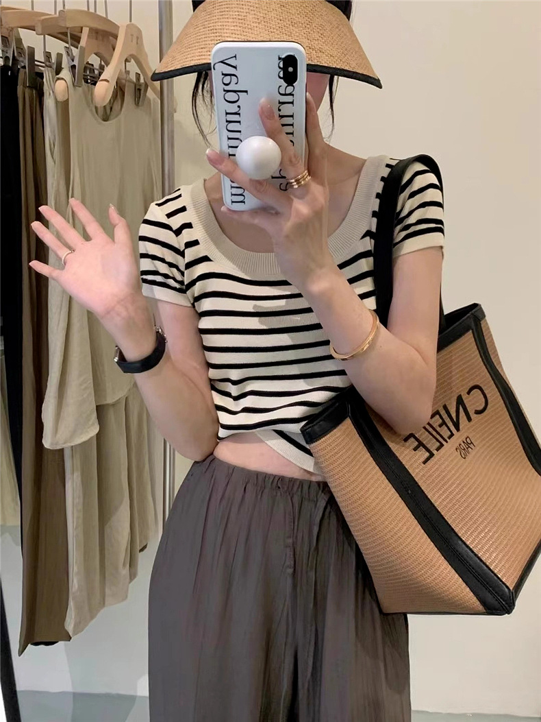 여름용 여성용 유럽 흑백 줄무늬 얼음 실크 니트 반팔 티셔츠 얇은 프렌치 하이 엔드 슬림 피트 오버 숄더 탑스토어 가기
