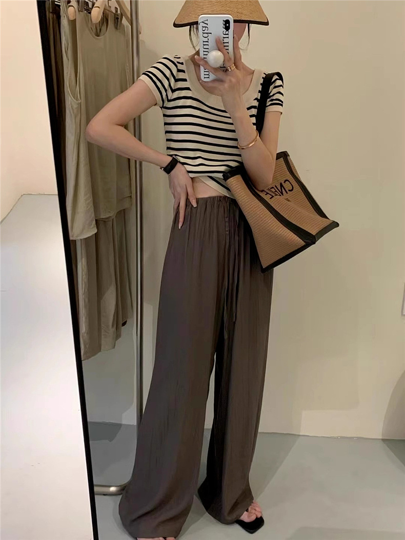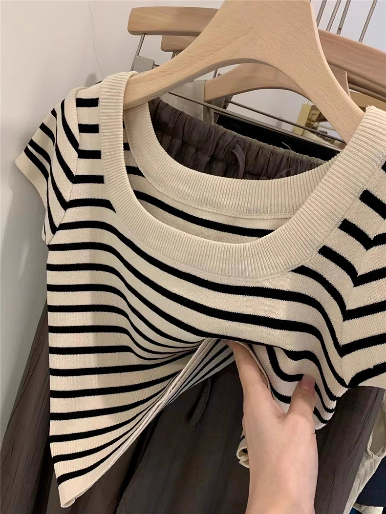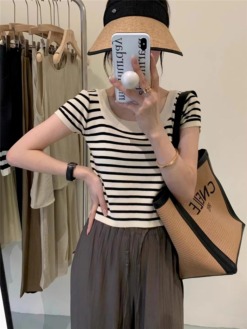 여름용 여성용 유럽 흑백 줄무늬 얼음 실크 니트 반팔 티셔츠 얇은 프렌치 하이 엔드 슬림 피트 오버 숄더 탑