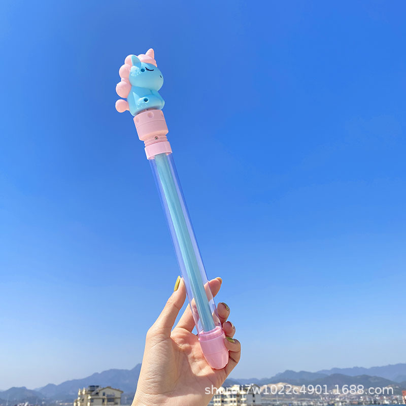가로등 아래에서 불꽃 놀이 물총 애호가와 함께 소리를 흔들어 물 불꽃 놀이 분위기 낭만적 인 소품 어린이 레저 장난감 사진을 찍습니다.
