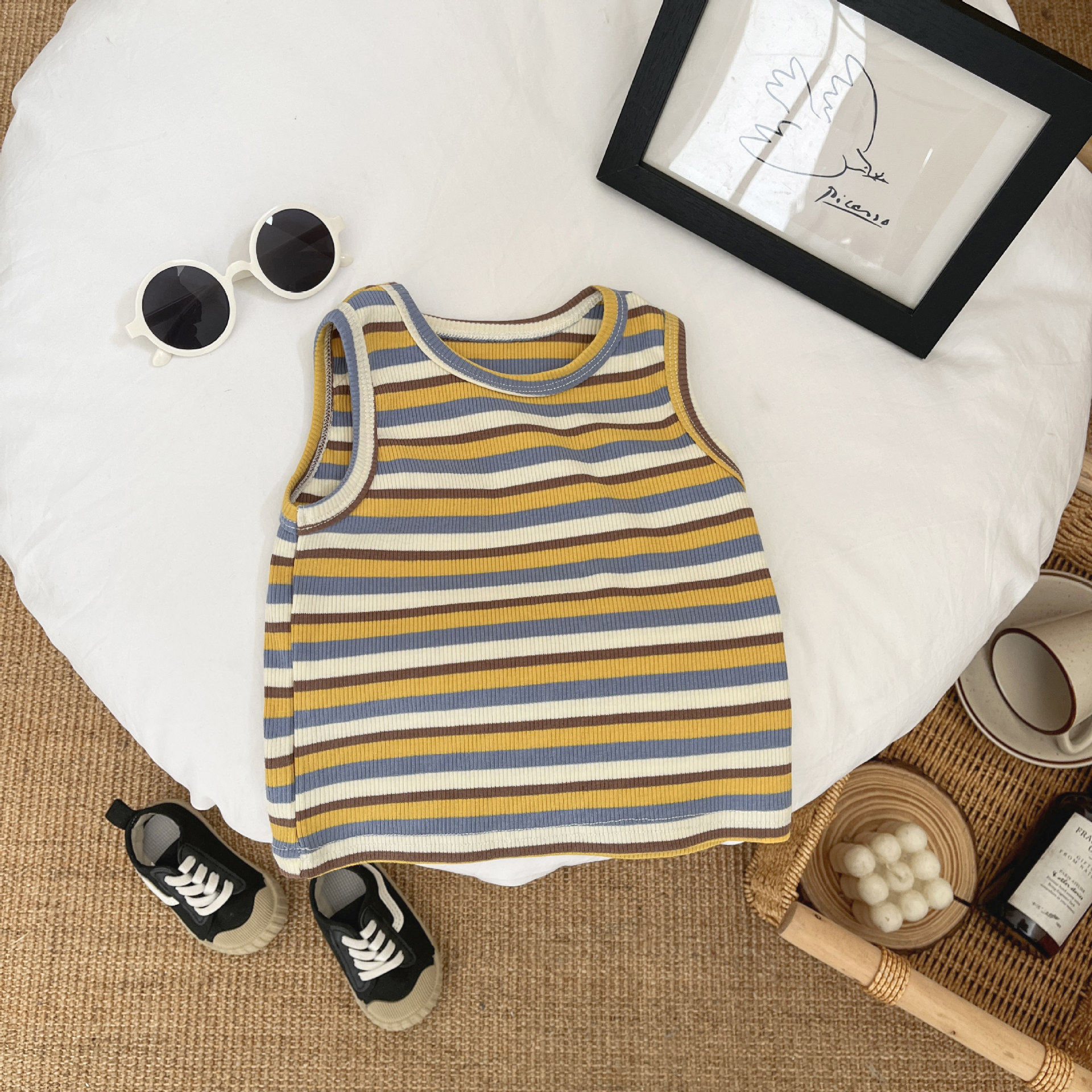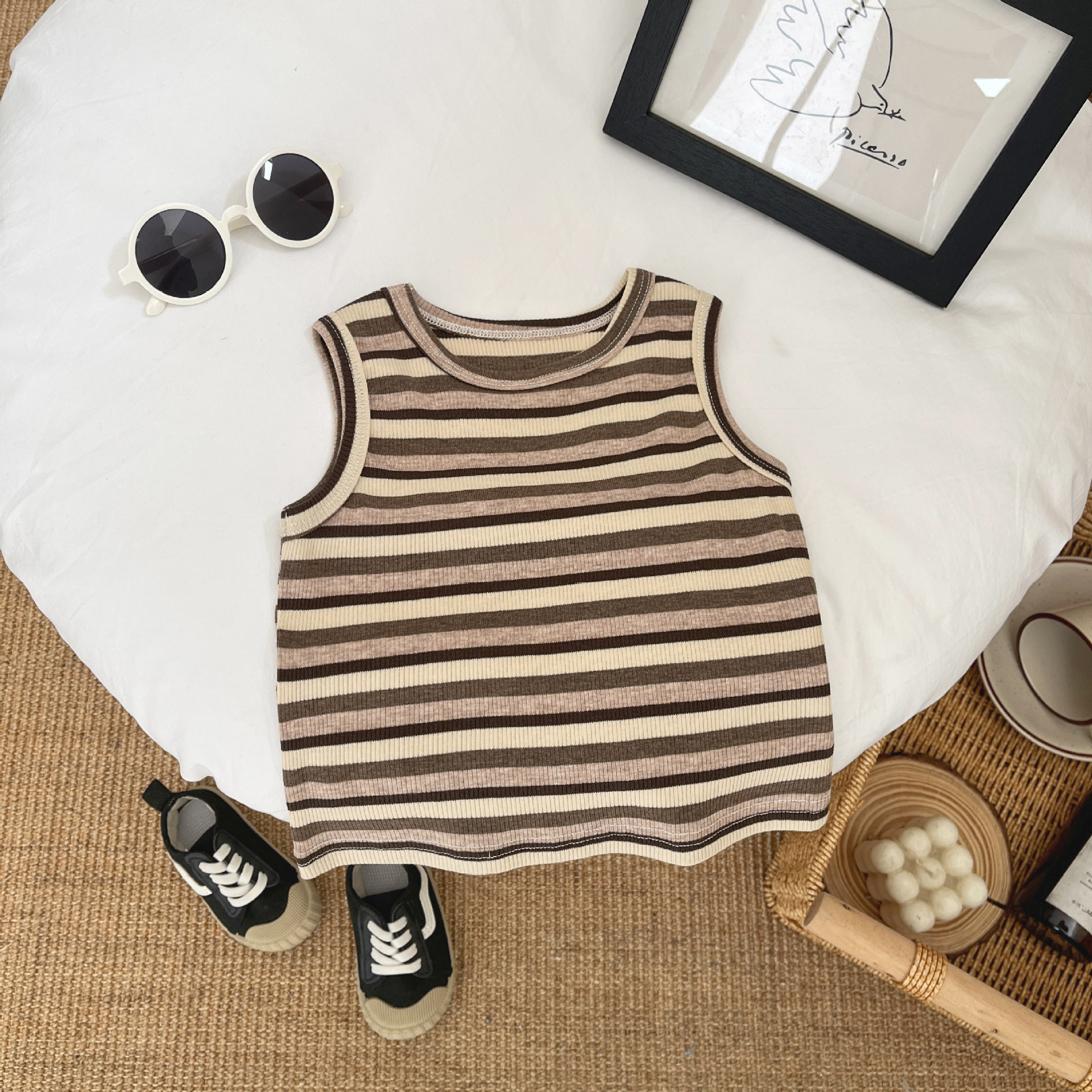 여름 남자들의 얇은 멋진 조끼 아기 스타일리쉬 스타일리쉬 스트라이프 민소매 탑 아기의 트렌디 한 외부 착용 작은 슬링스토어 가기