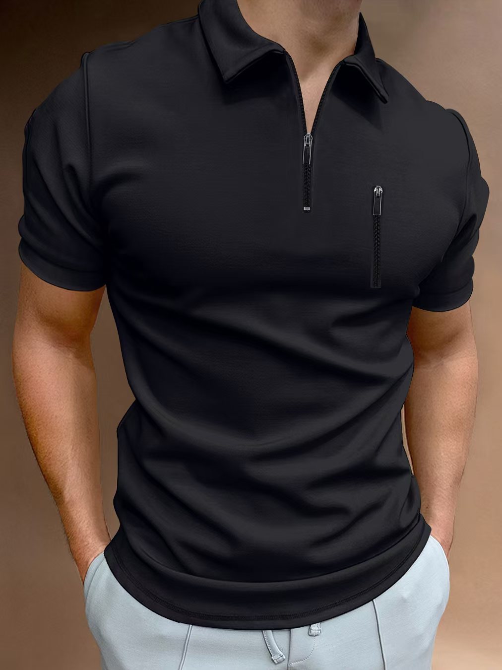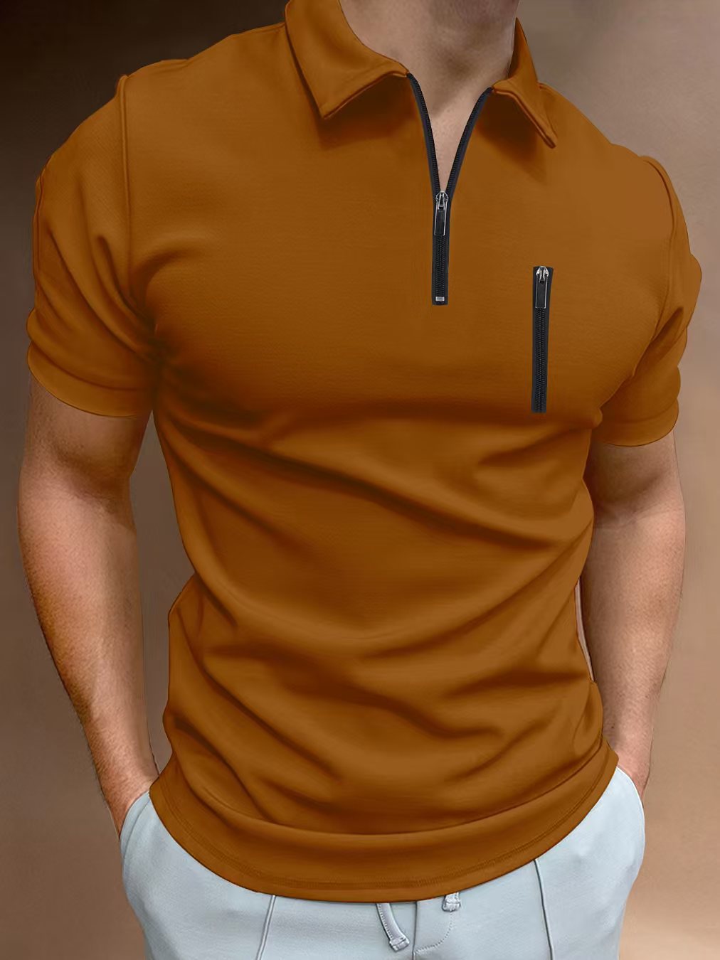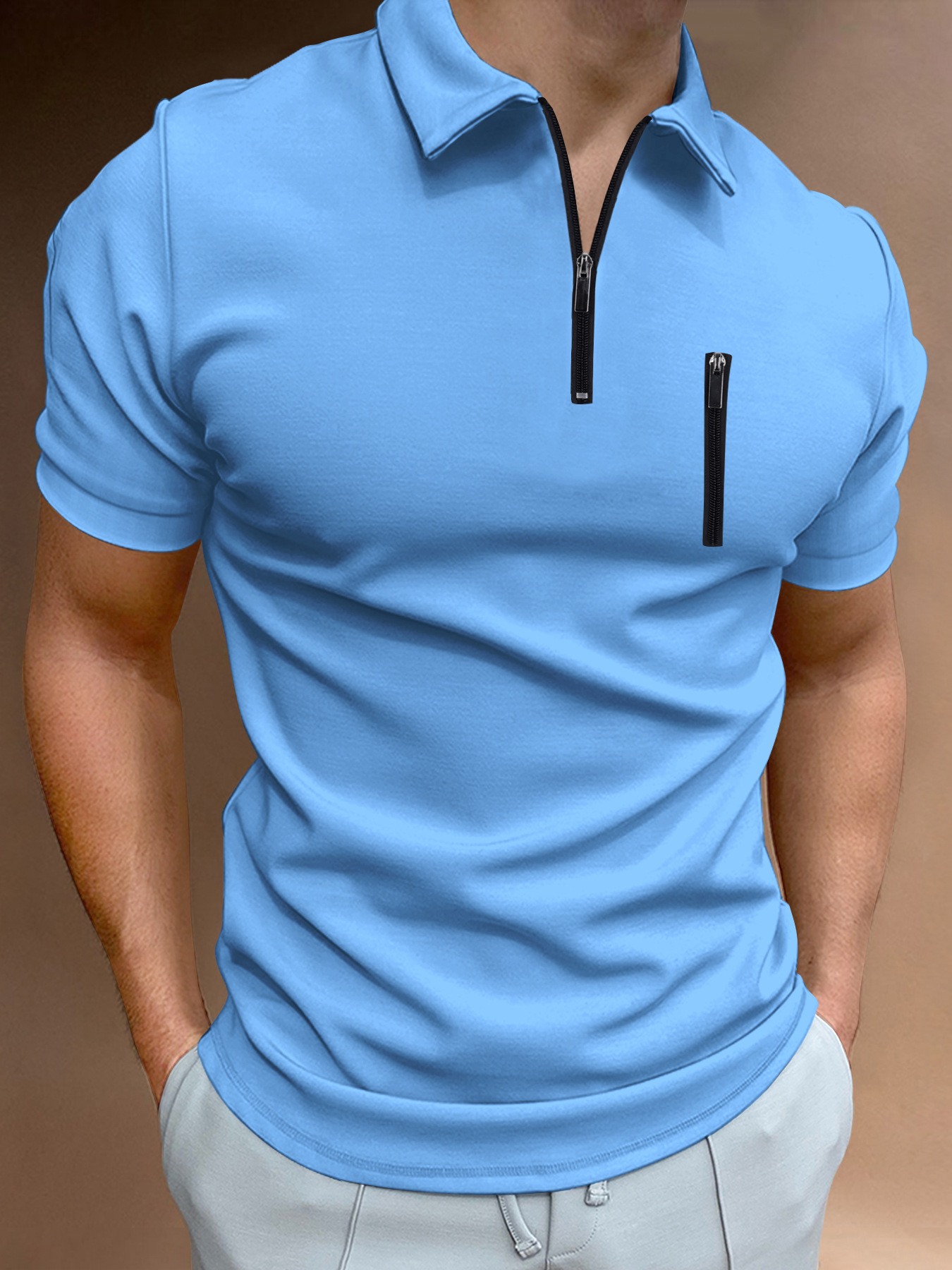유럽과 미국의 국경 2025 여름 빠른 판매 아마존 폴로 셔츠 남자의 단색 지퍼 헨리 칼라 스포츠
