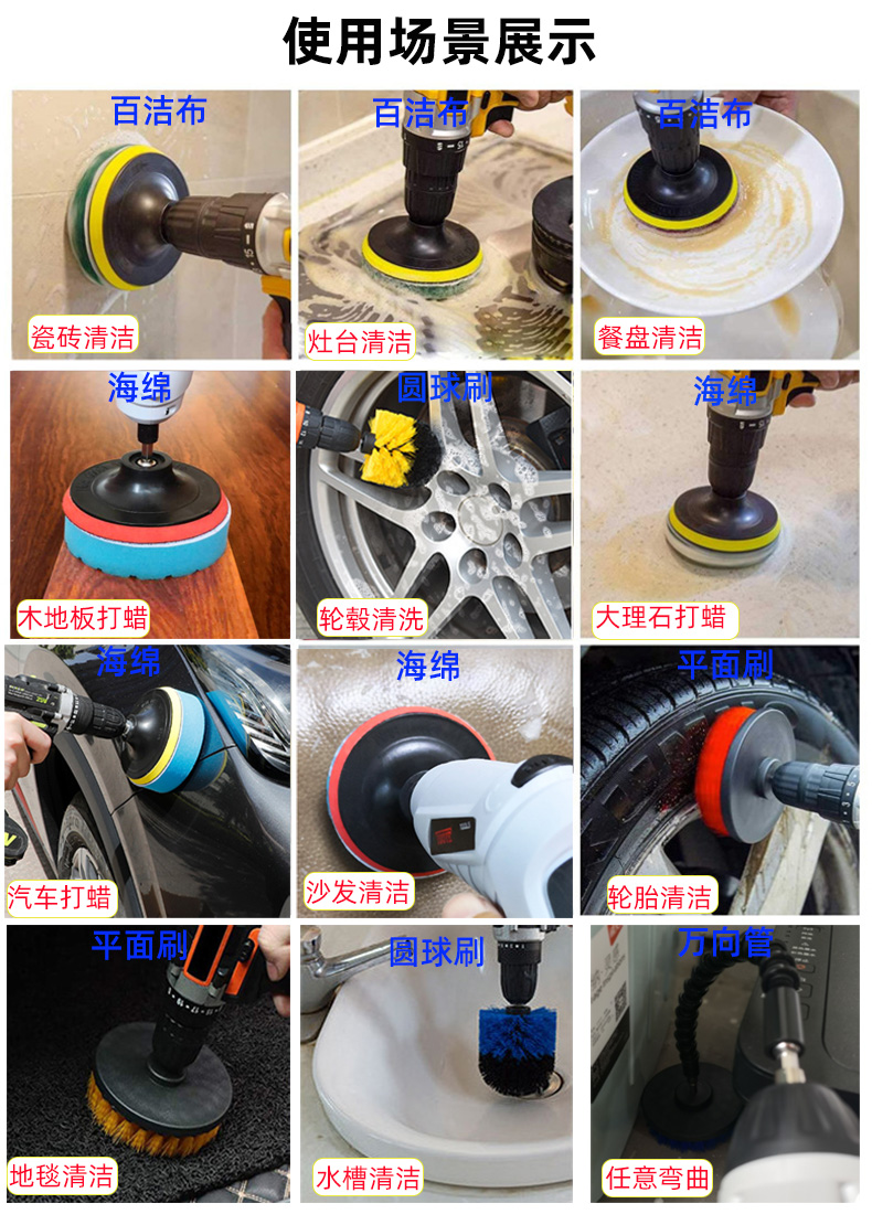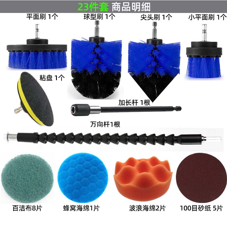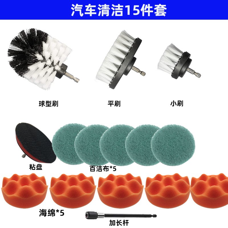 • 자동차 15종 세트 플랫 브러시 1개 + 볼 브러시 1개 + 소형 브러시 1개 + 흡입 컵 1개 + 수세미 5개 + 스펀지 5개 + 연장 막대 1개
