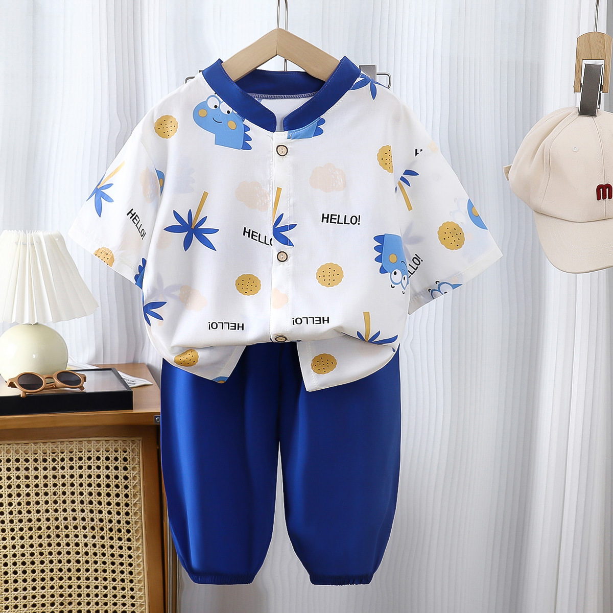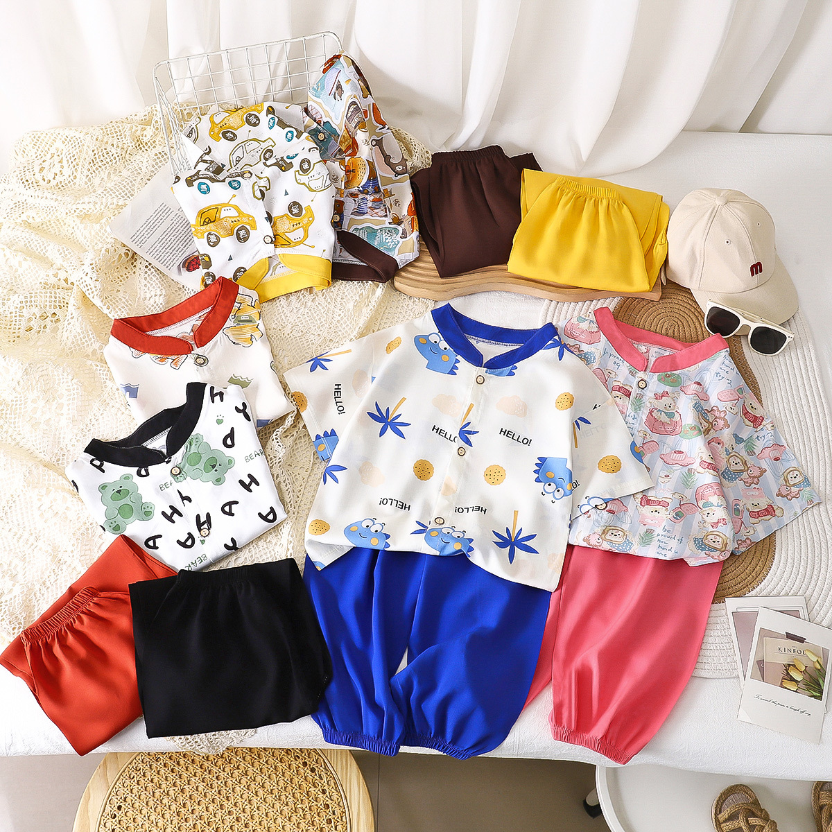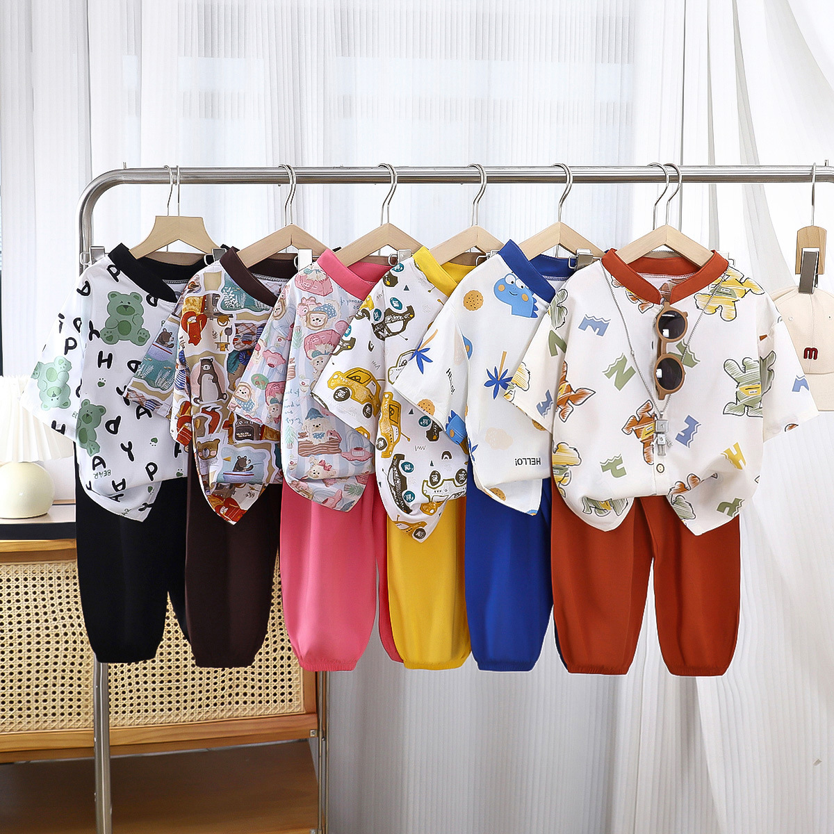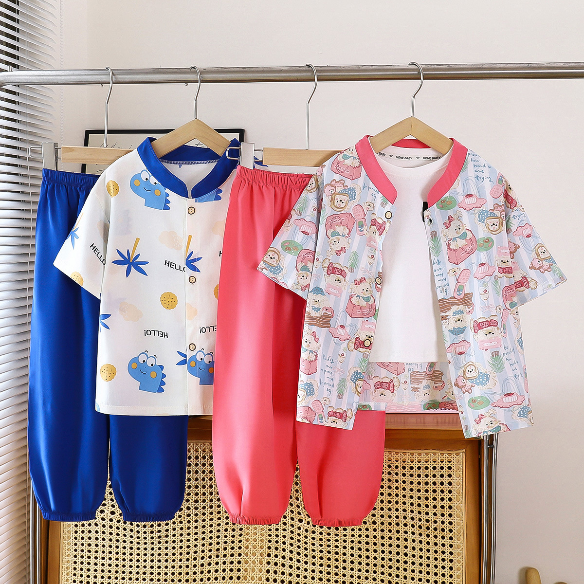 어린이 반팔 세트 셔츠 티셔츠 소년 여름 레즈비언 홈 옷 소녀 실크 파자마 투피스 세트