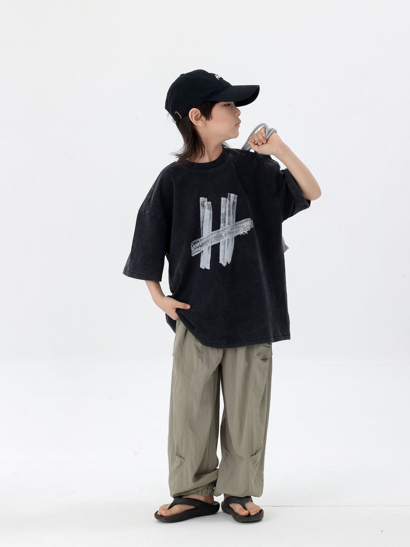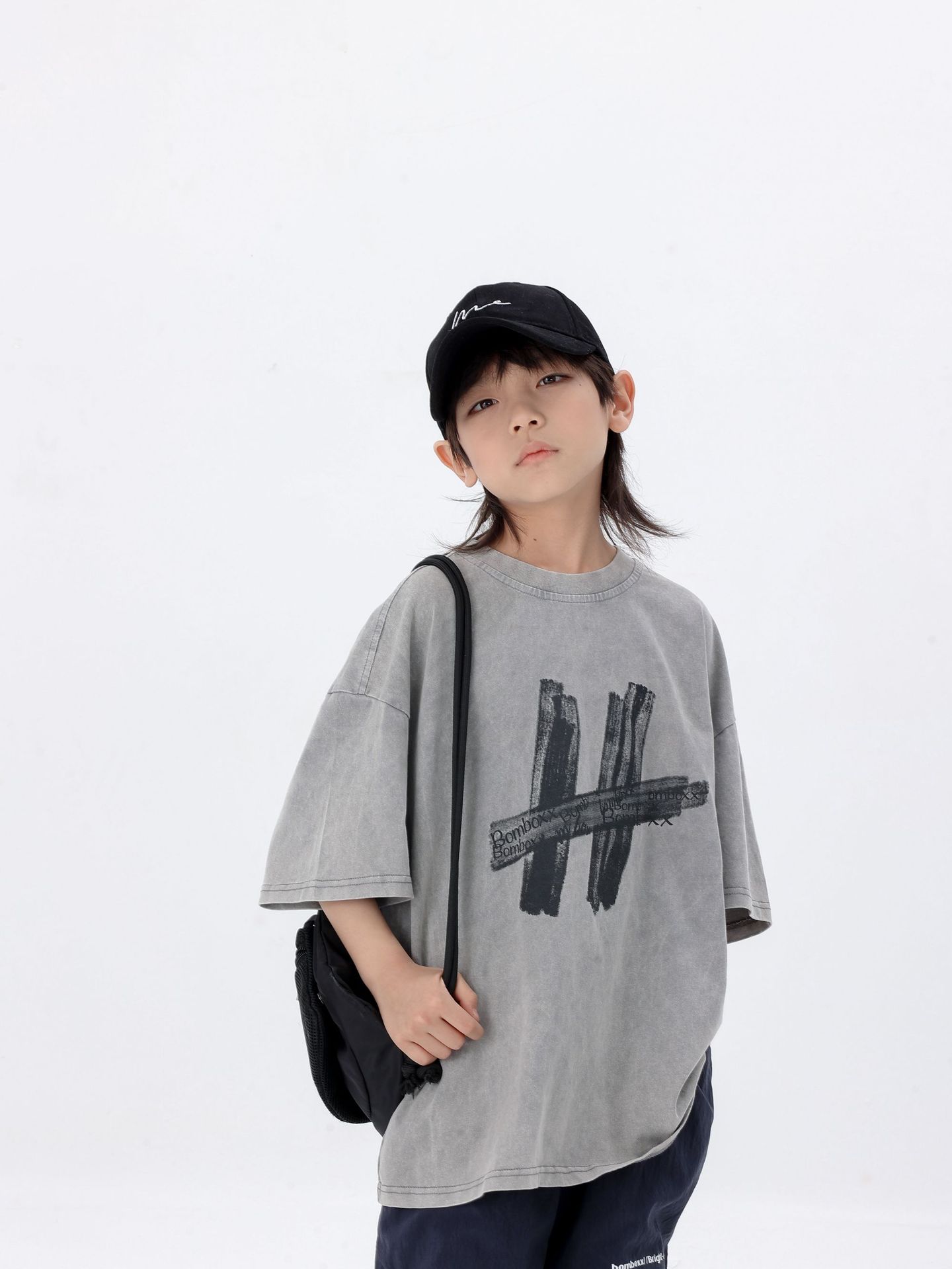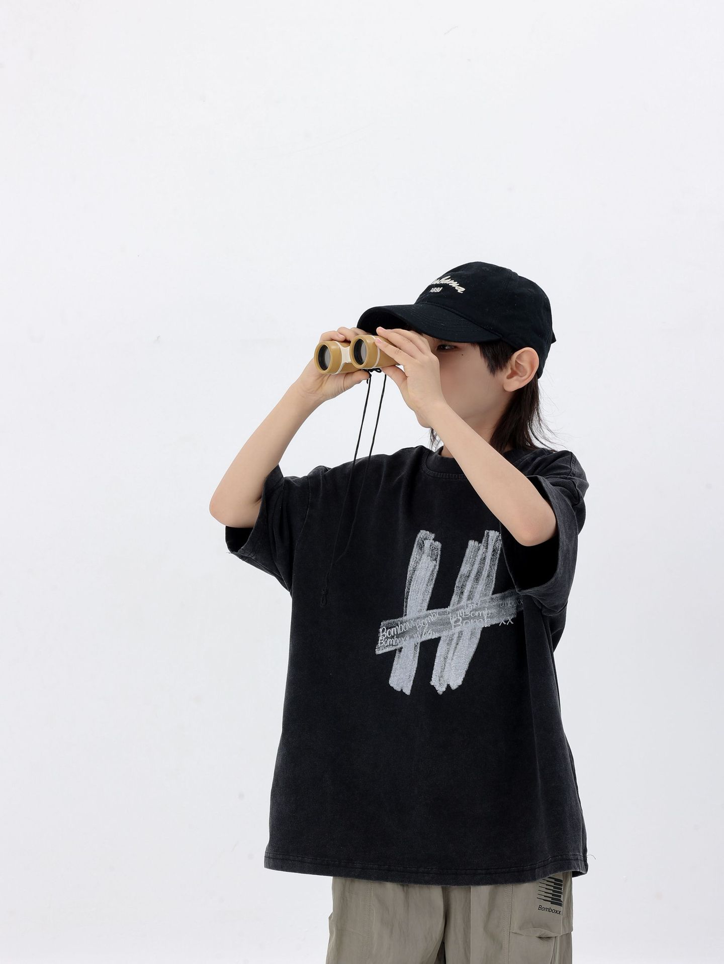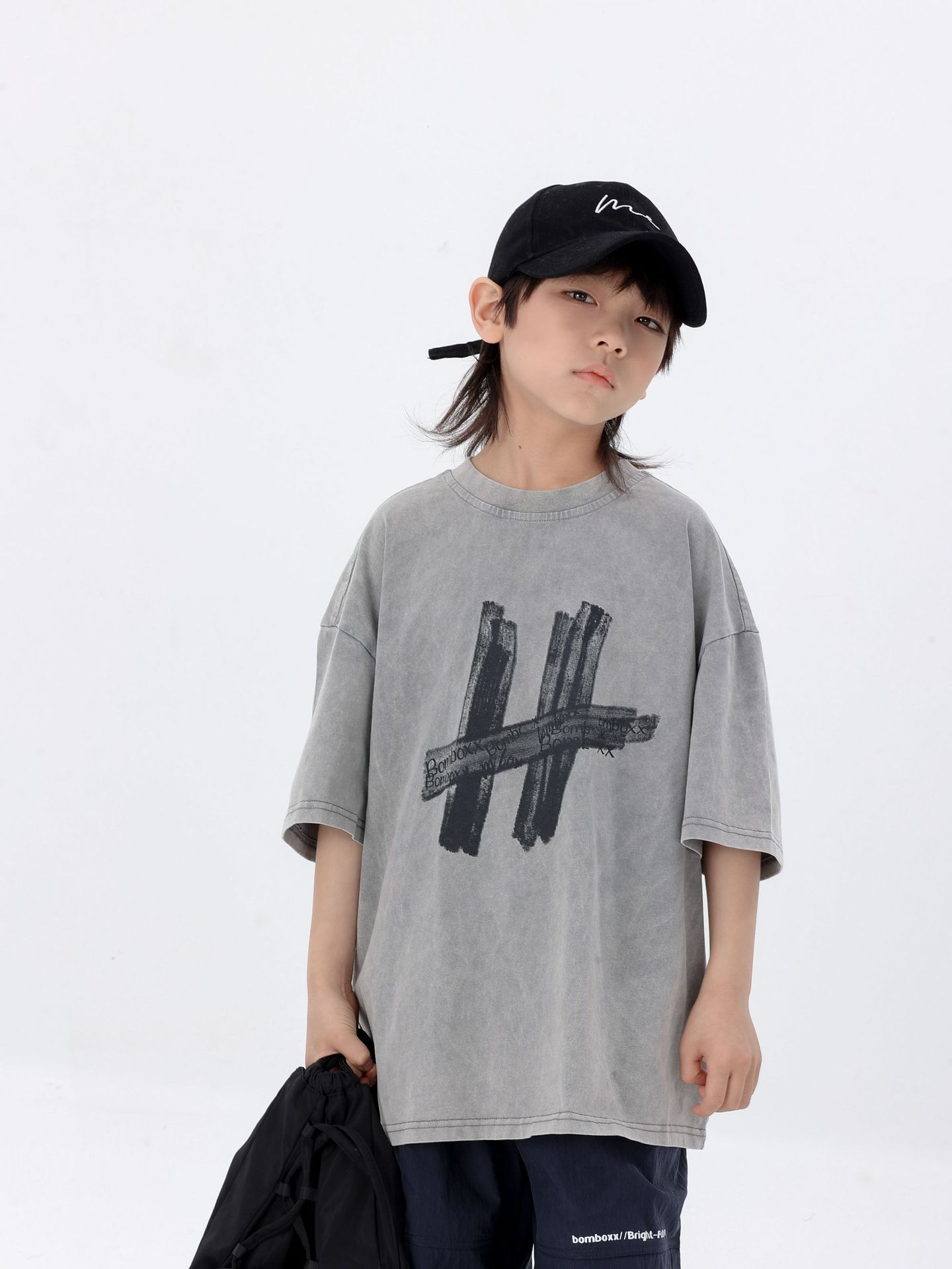 반품, 교환 불가 25 여름 신상품 샌드워싱 코튼 H 프린트 트렌디하고 멋진 아동 티셔츠, 멋스러운 빈티지 스타일 아동 반팔 티셔츠