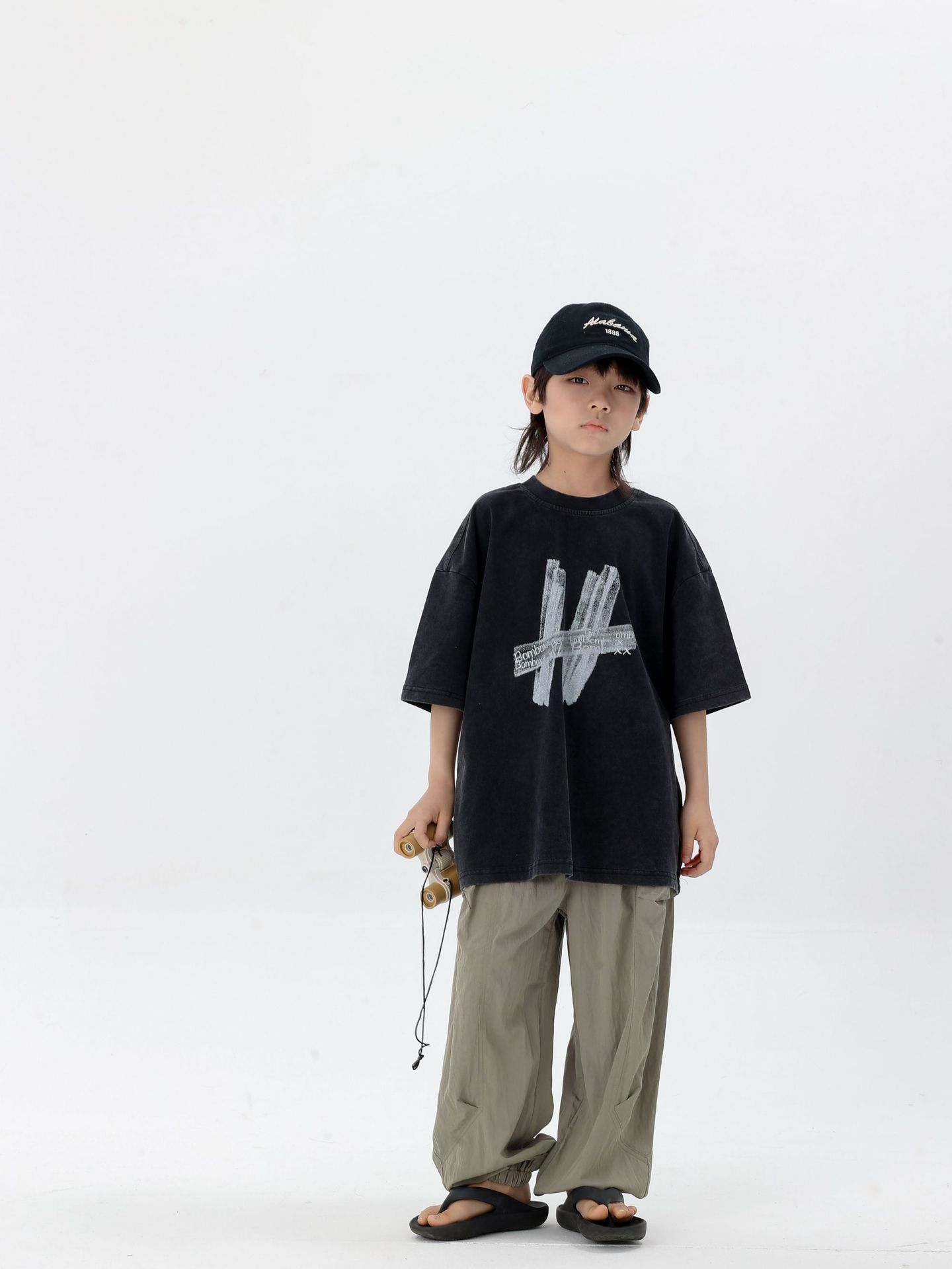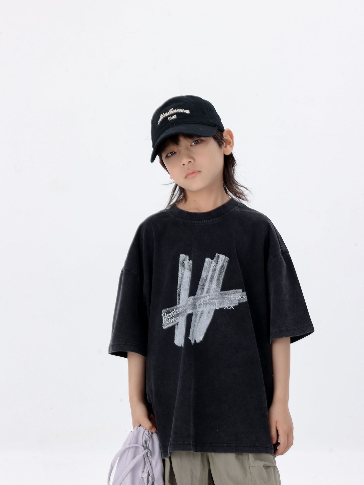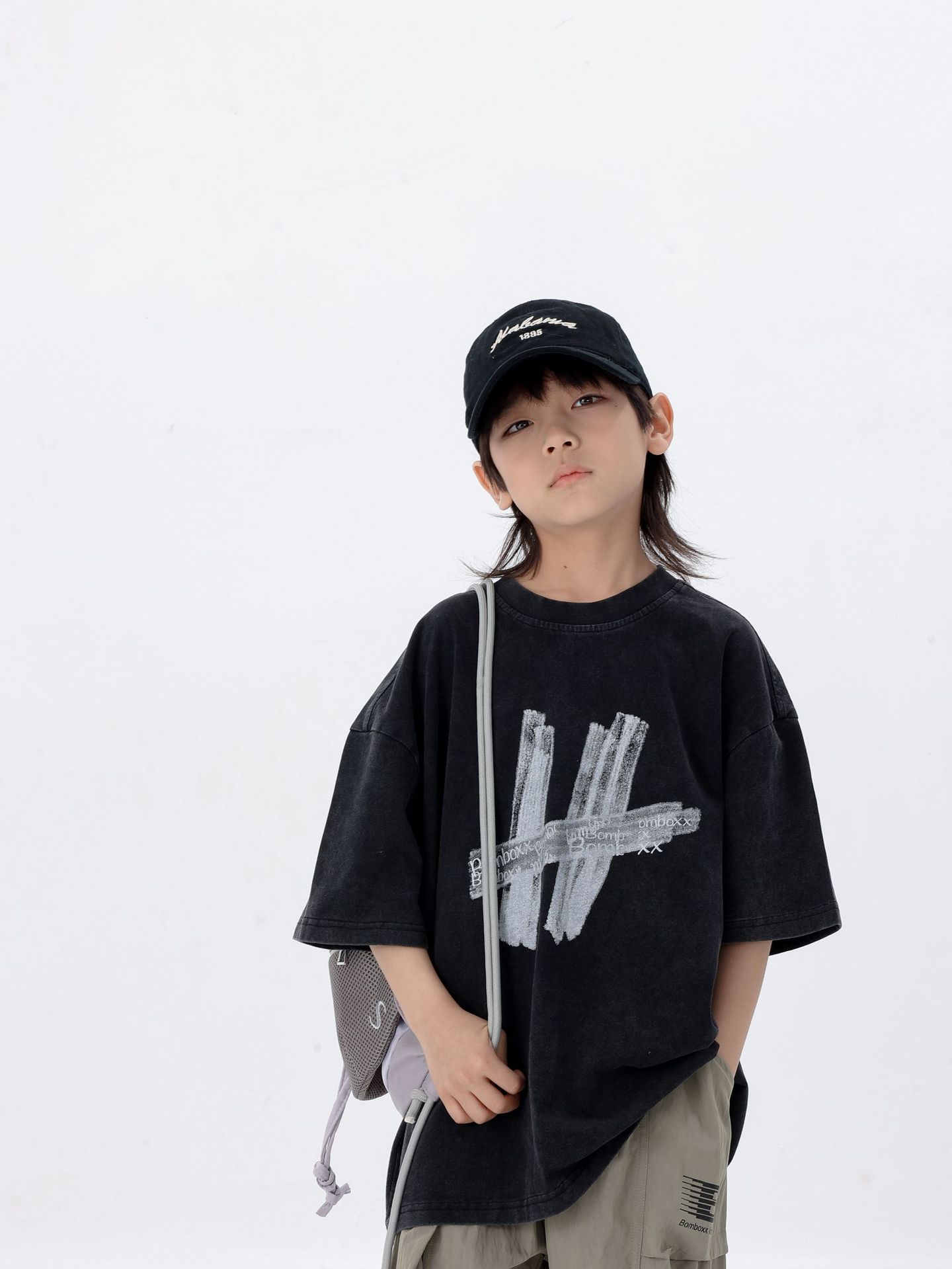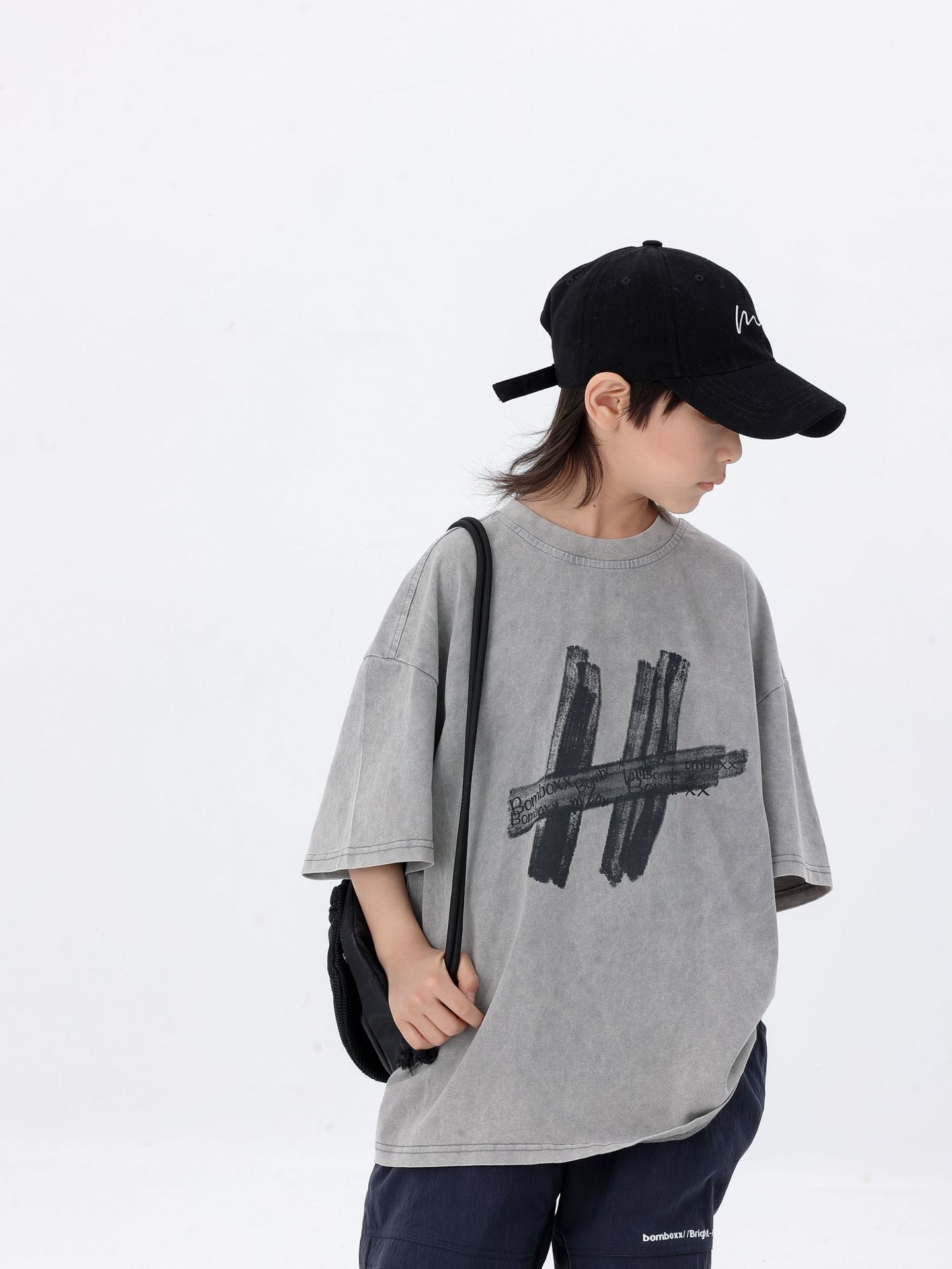 반품, 교환 불가 25 여름 신상품 샌드워싱 코튼 H 프린트 트렌디하고 멋진 아동 티셔츠, 멋스러운 빈티지 스타일 아동 반팔 티셔츠