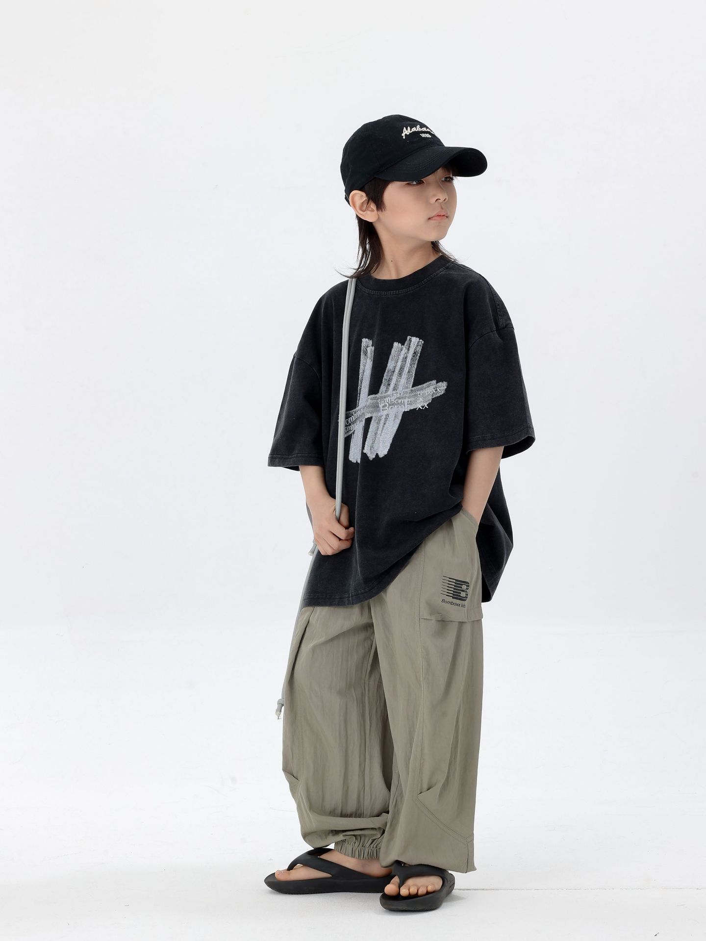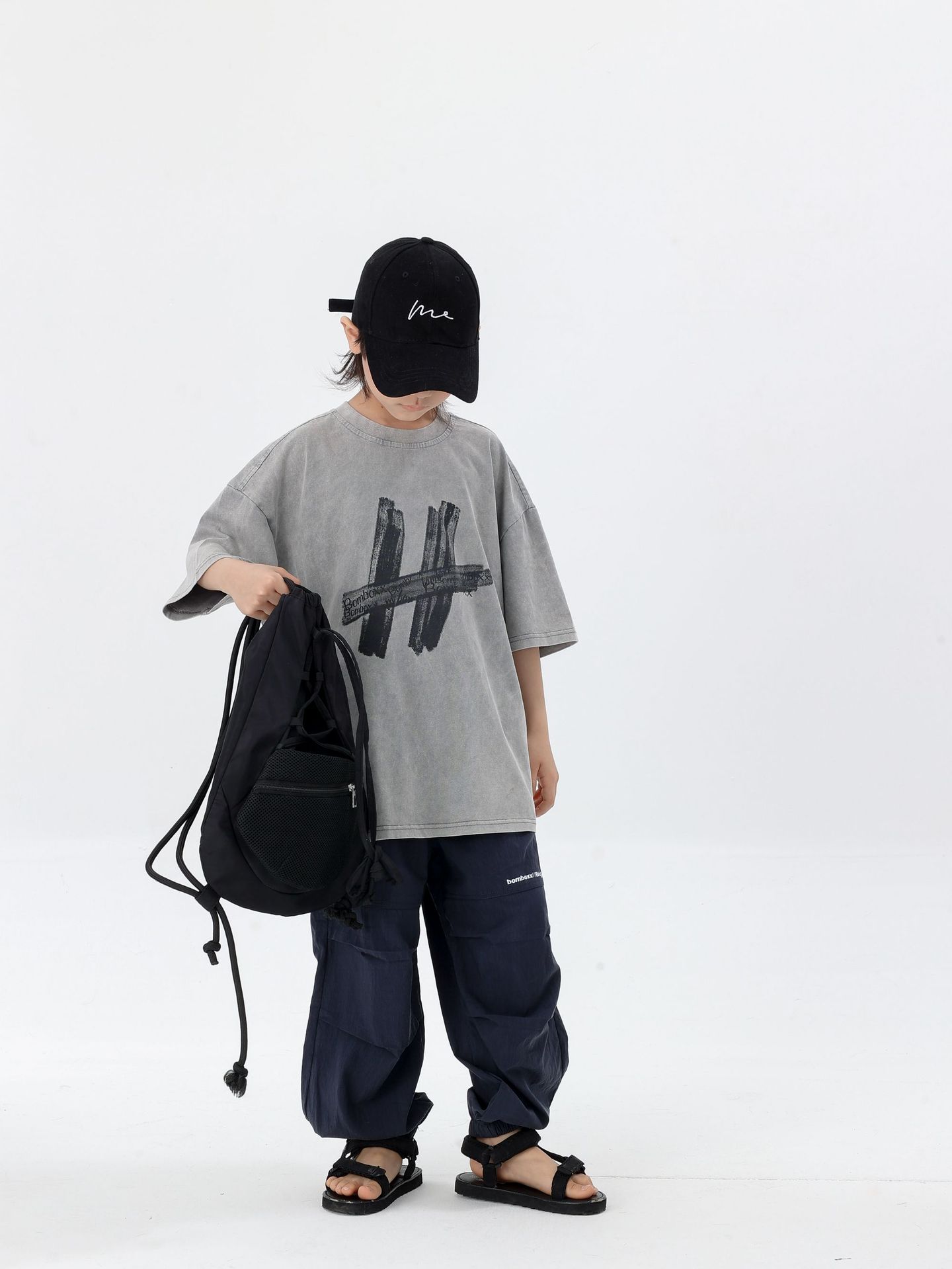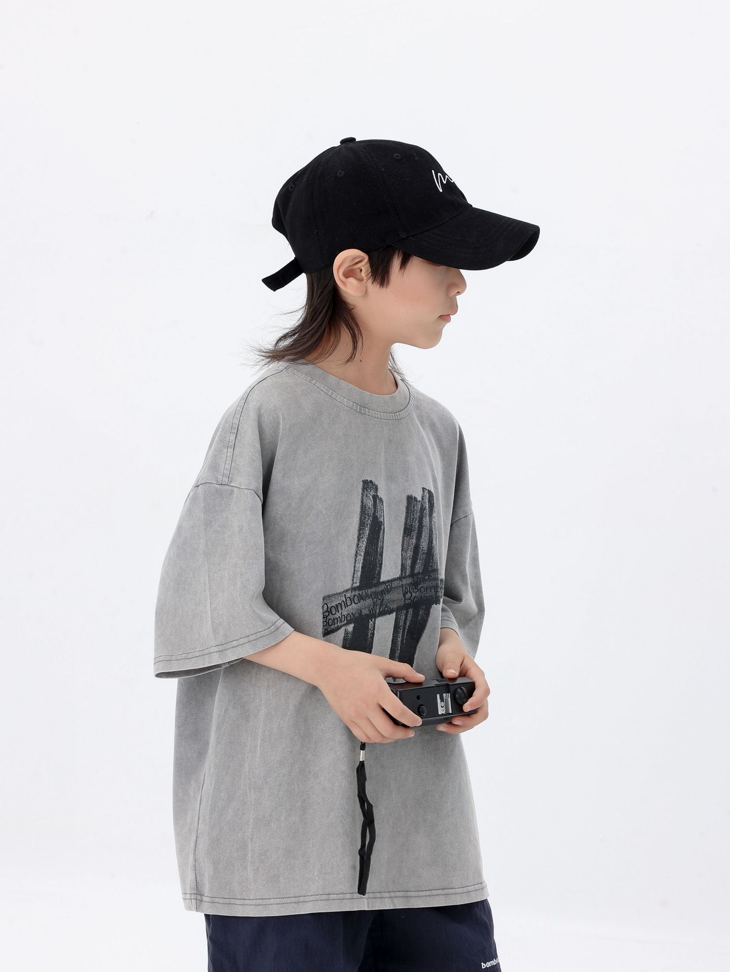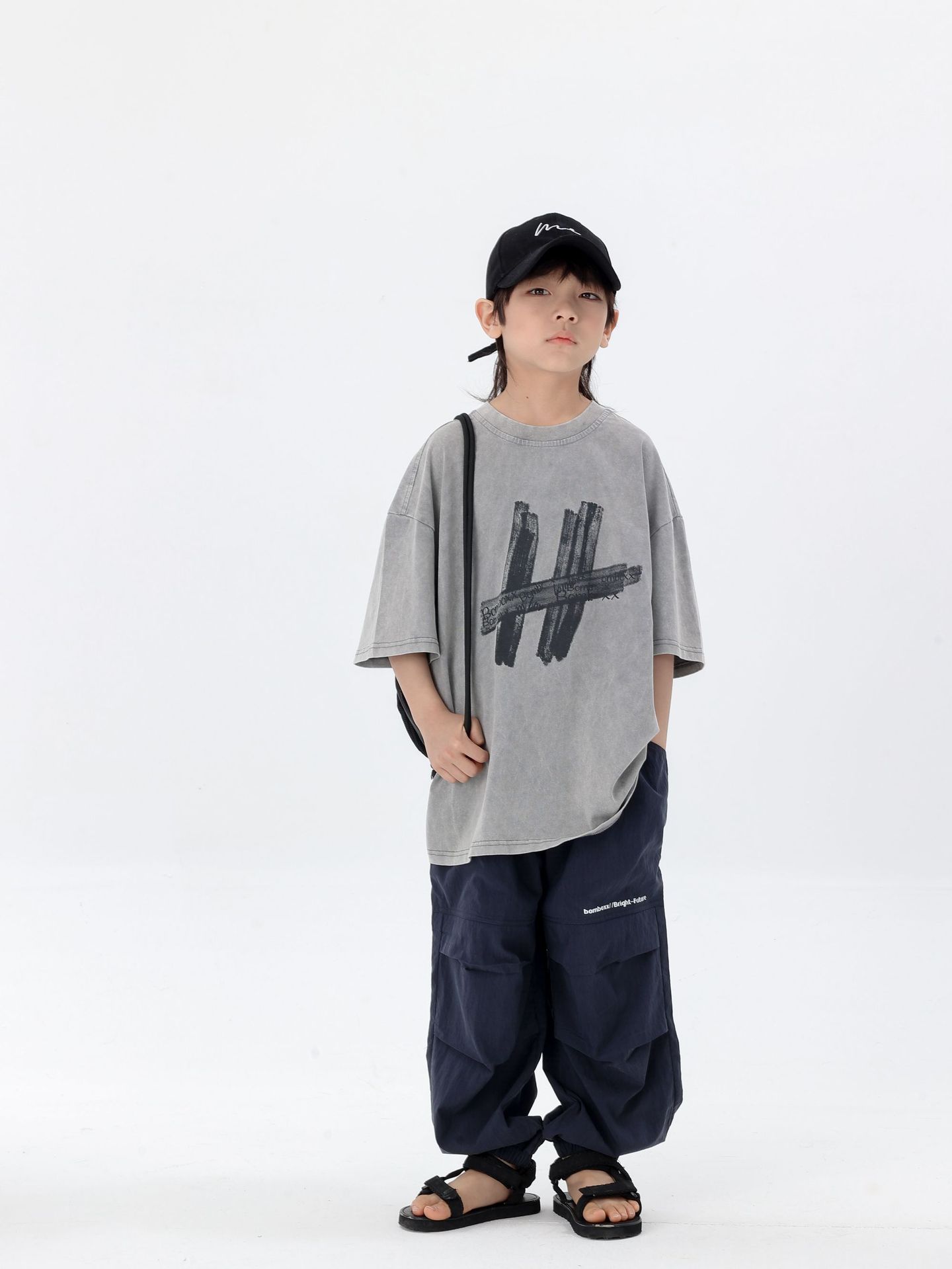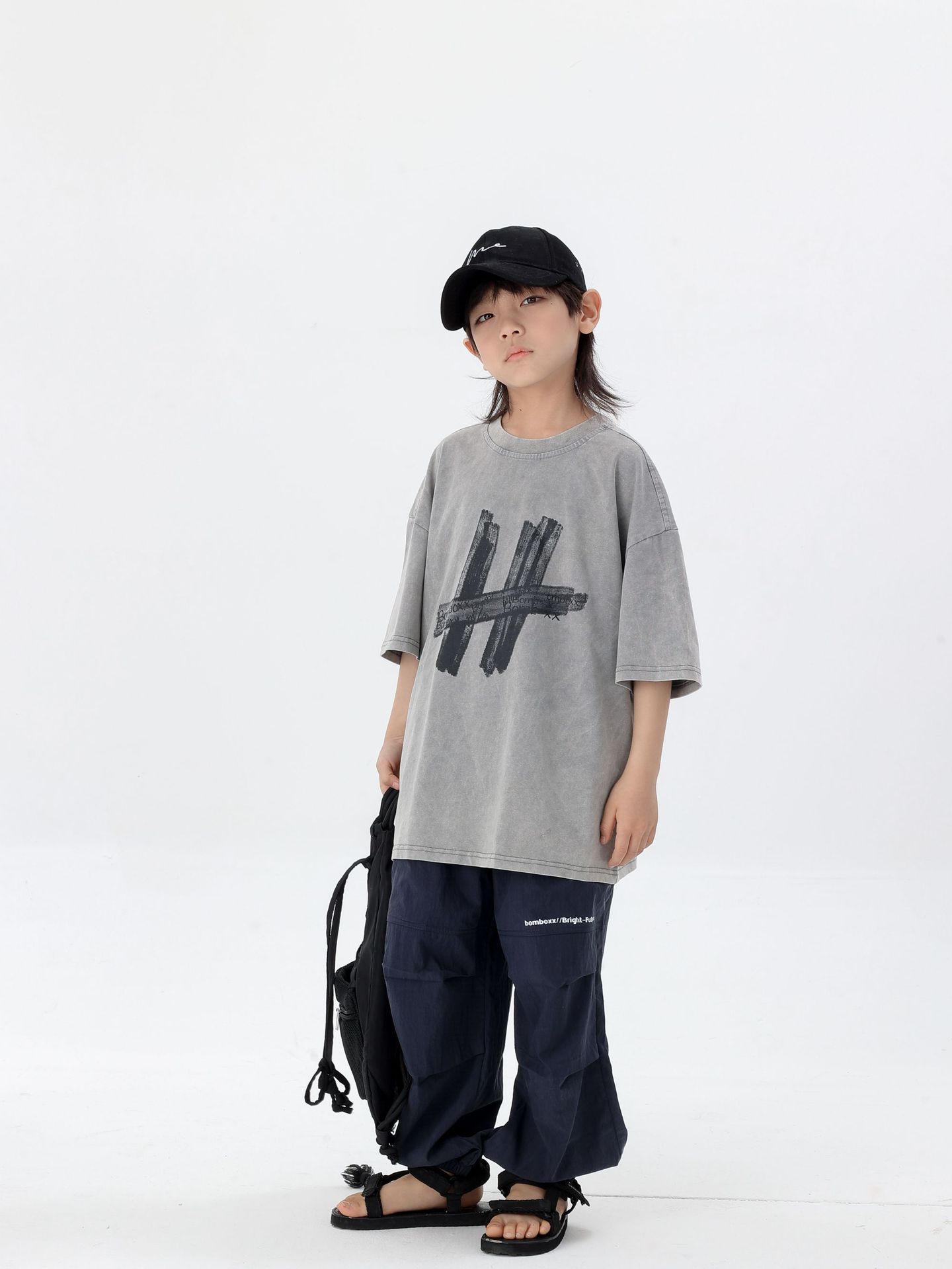 반품, 교환 불가 25 여름 신상품 샌드워싱 코튼 H 프린트 트렌디하고 멋진 아동 티셔츠, 멋스러운 빈티지 스타일 아동 반팔 티셔츠