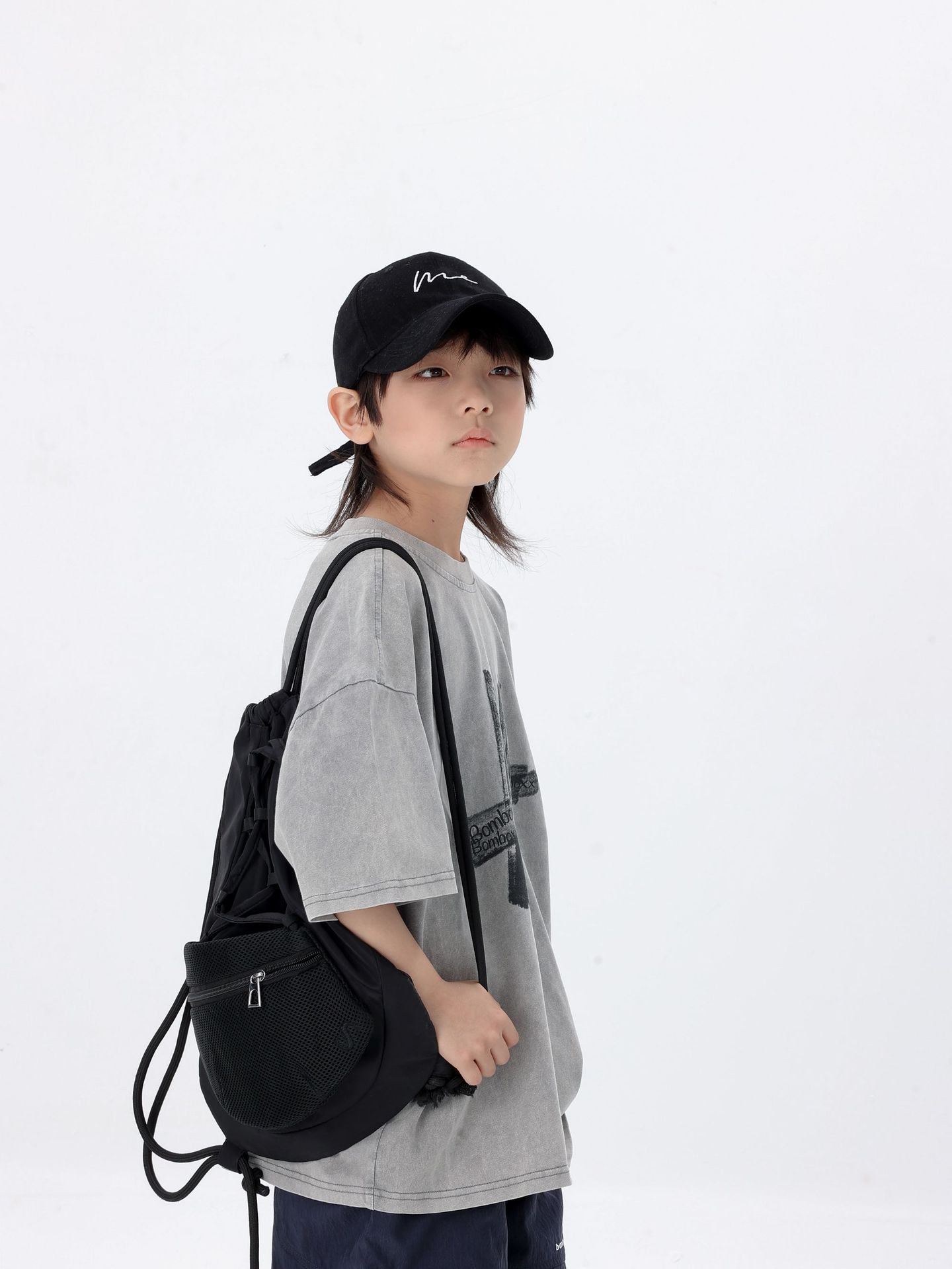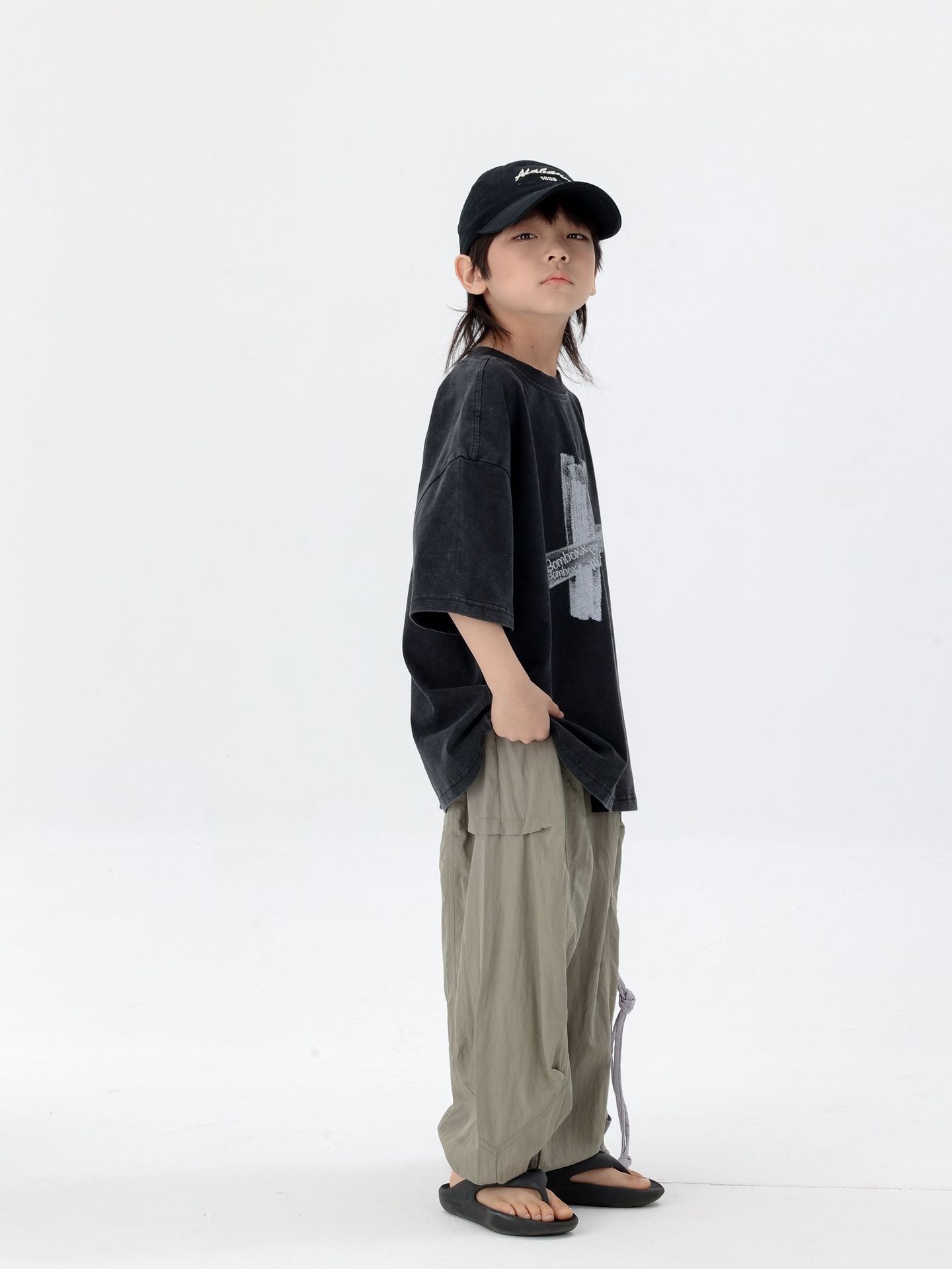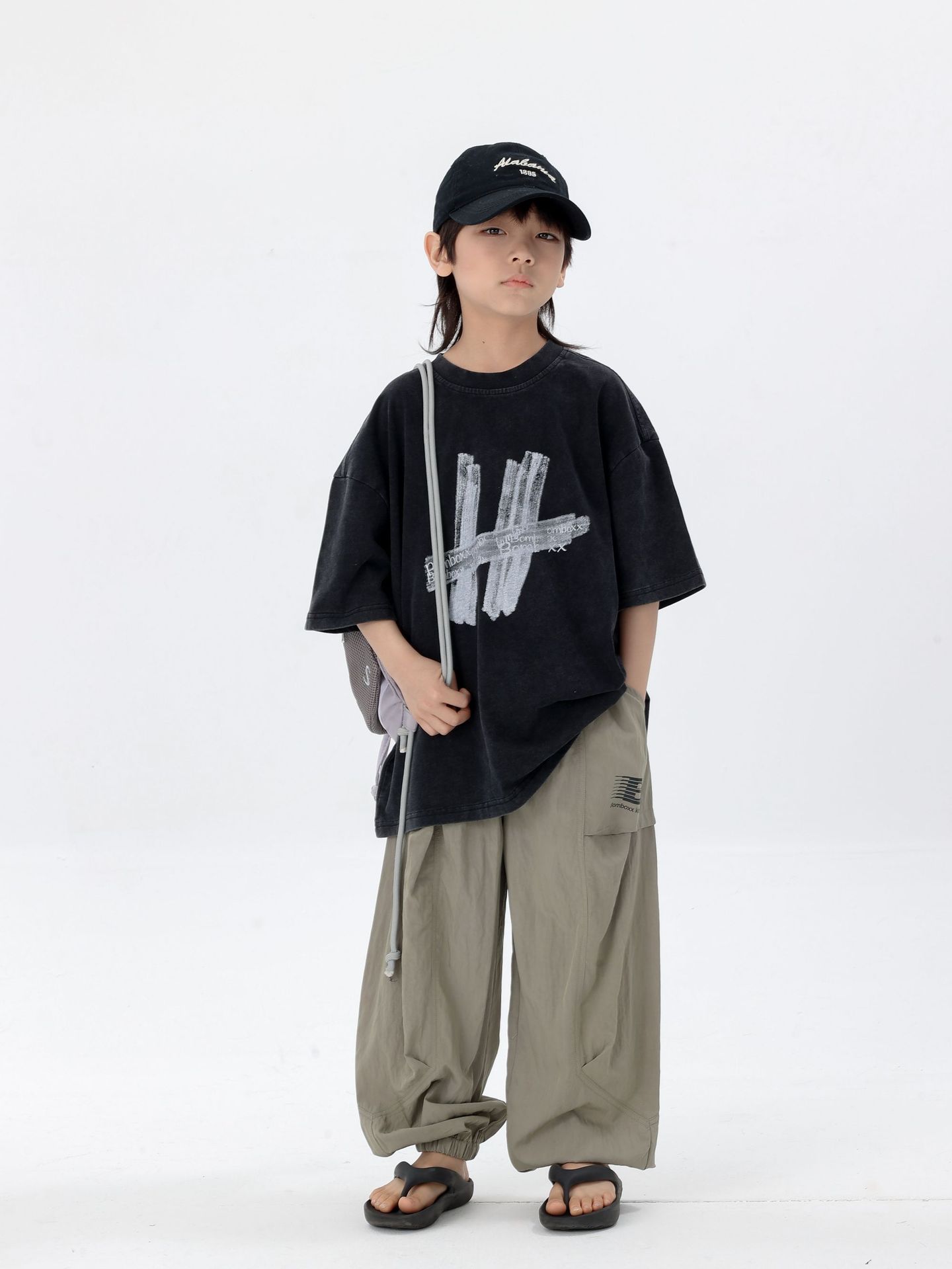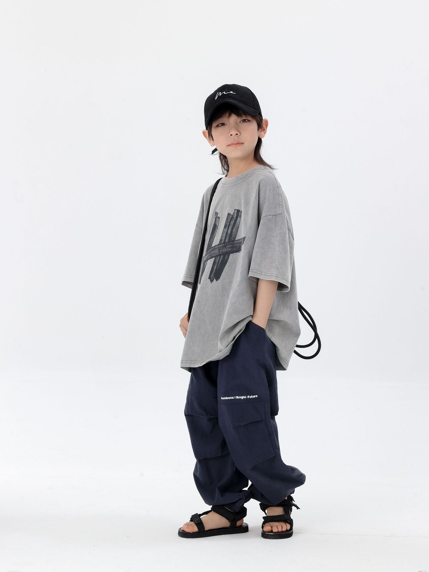 반품, 교환 불가 25 여름 신상품 샌드워싱 코튼 H 프린트 트렌디하고 멋진 아동 티셔츠, 멋스러운 빈티지 스타일 아동 반팔 티셔츠