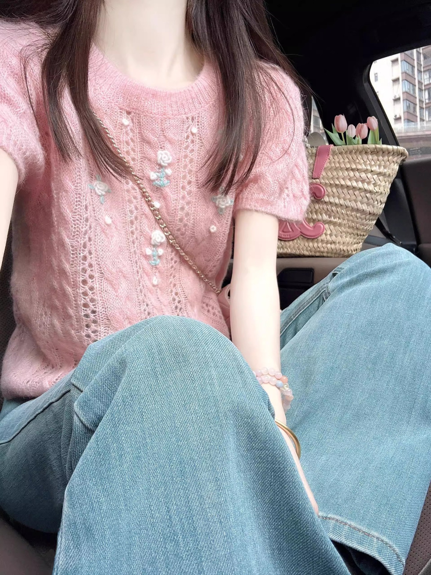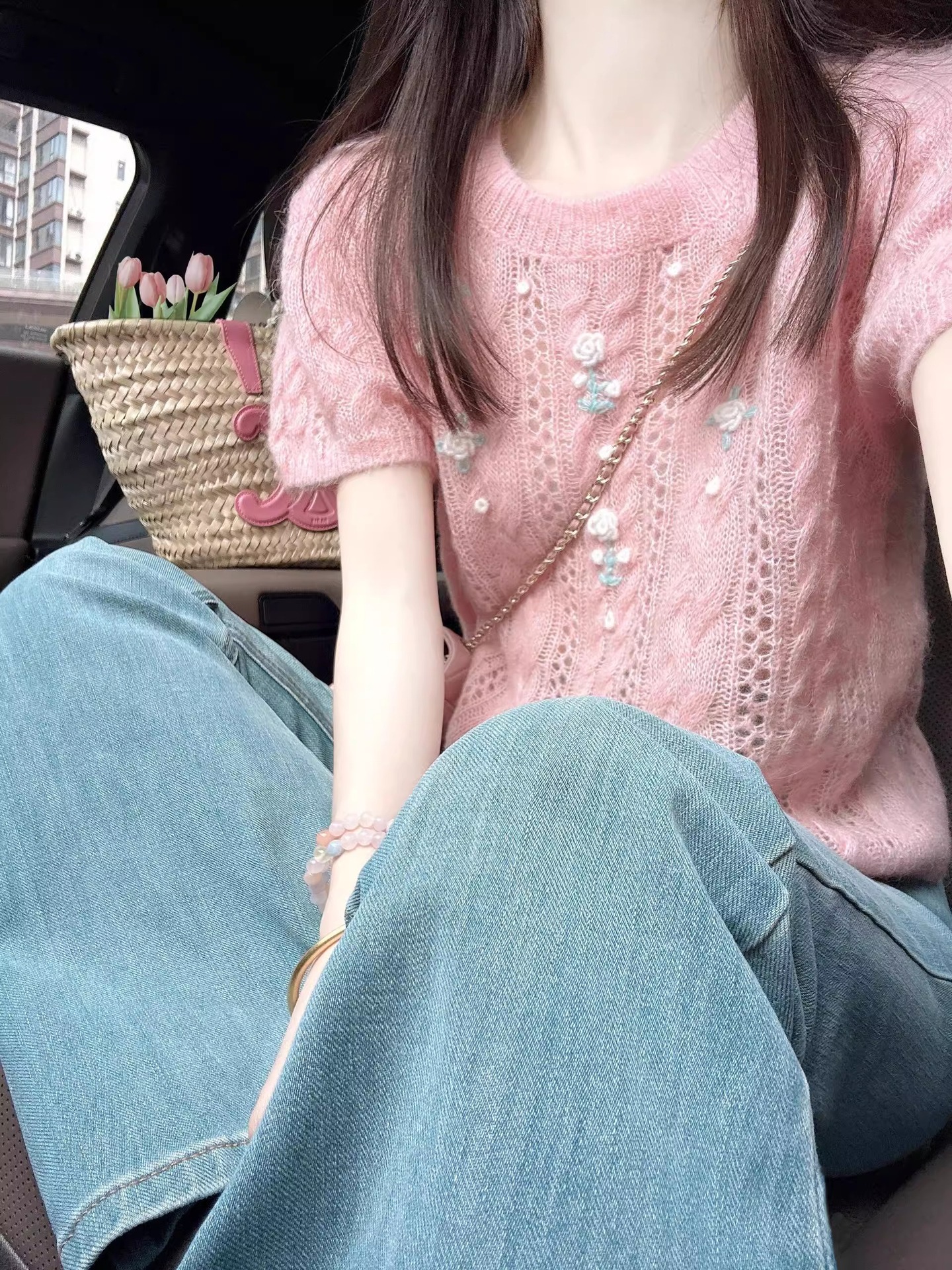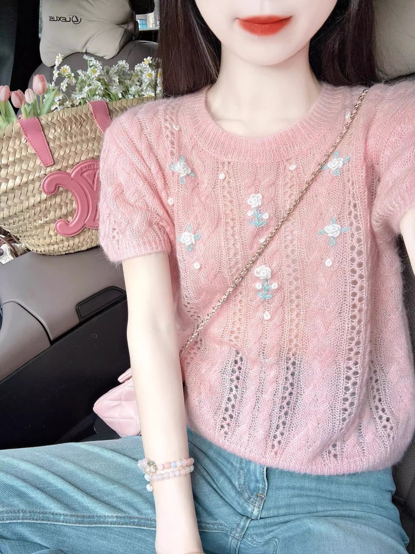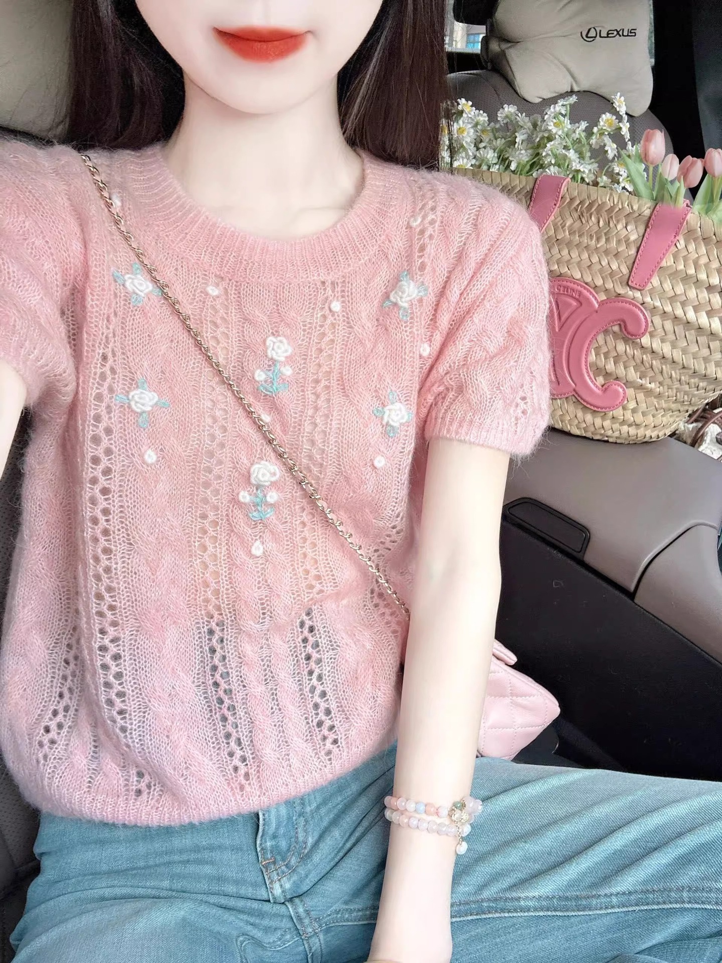 한국 스타일 디자인 센스 할로우 크로 셰 뜨개질 반팔 스웨터 여성 여름 새로운 느슨한 부드러운 스타일 핑크 연령 감소 탑