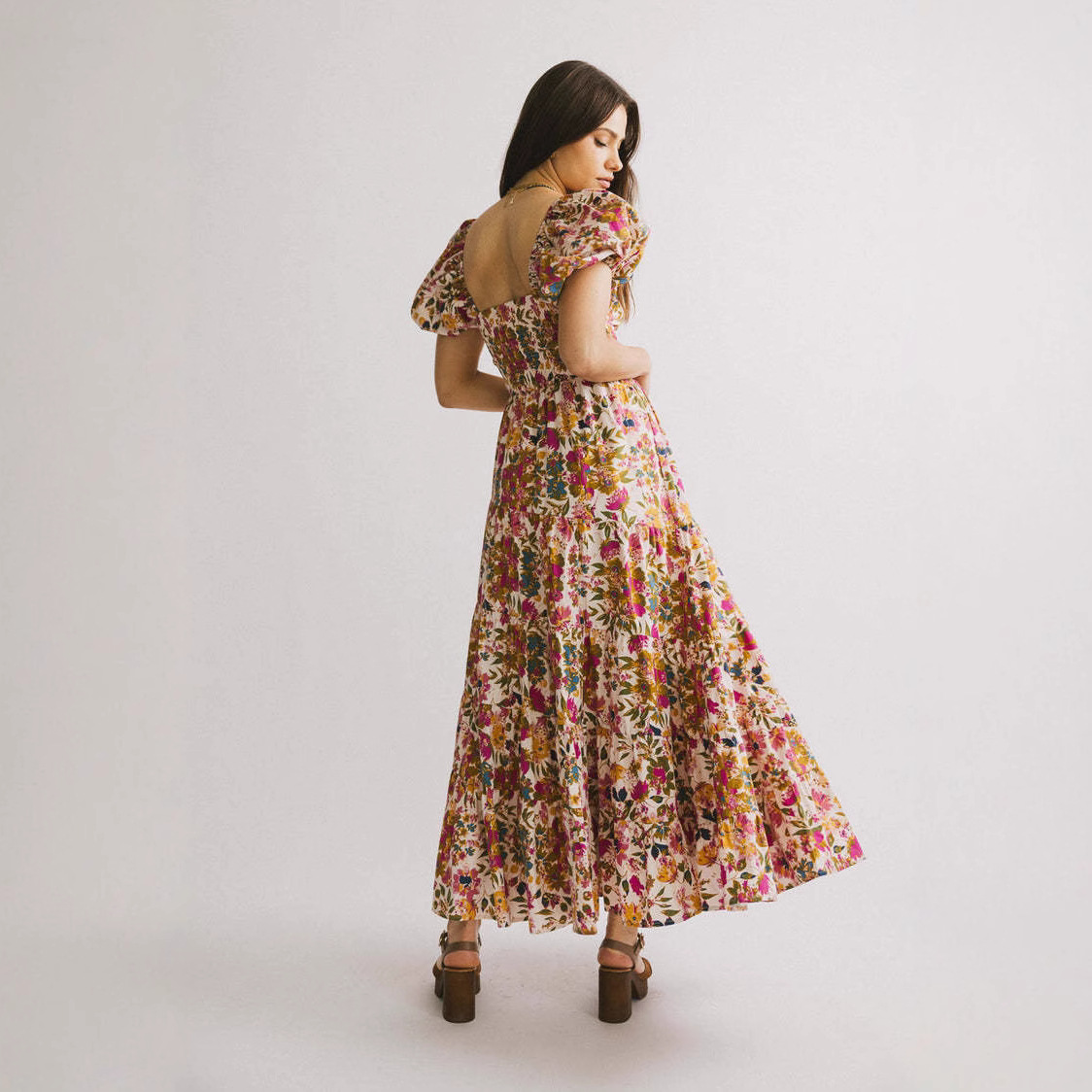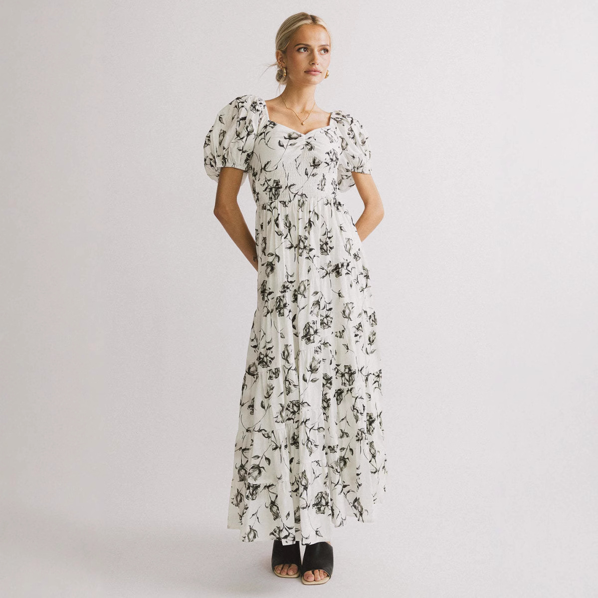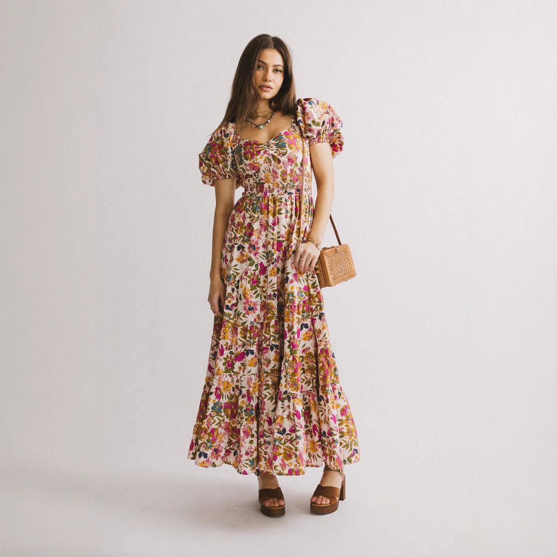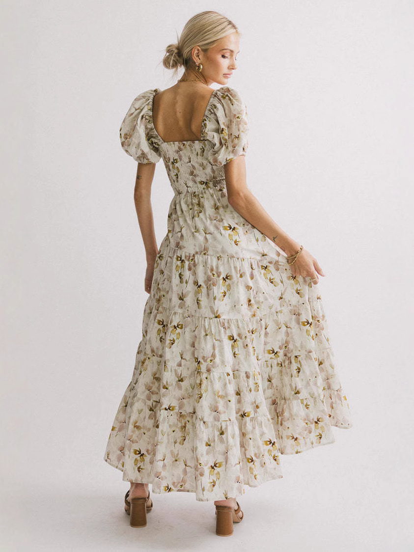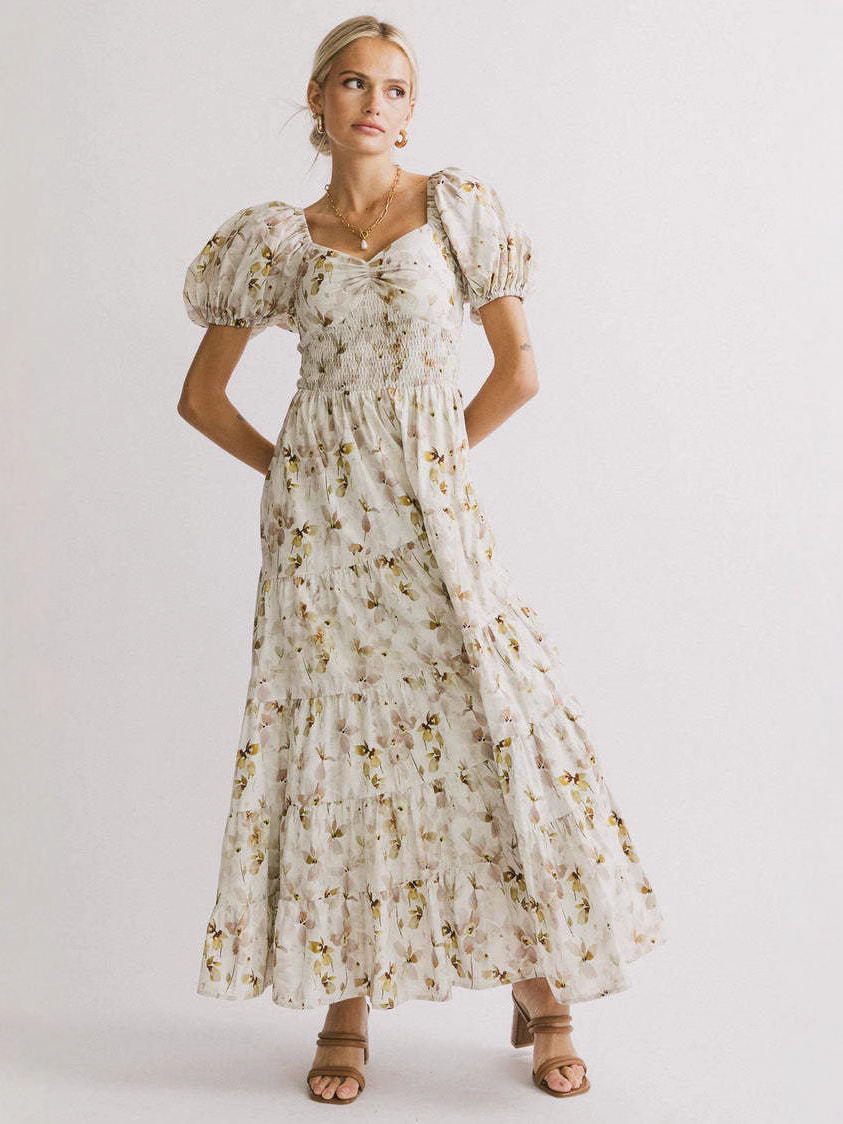 국경 2025 AliExpress 유럽과 미국 여성의 여름 새로운 프랑스 퍼프 소매 빈티지 인쇄 스티칭 원피스