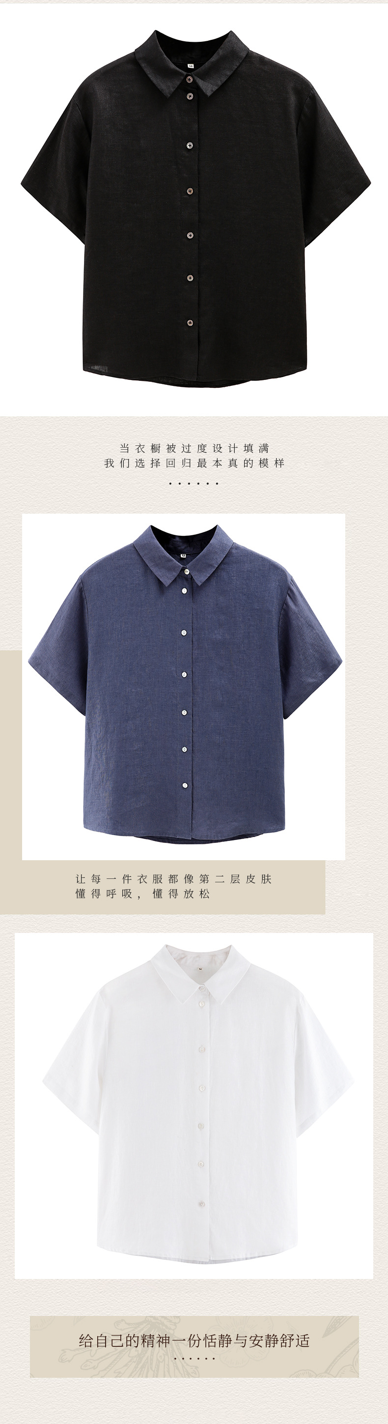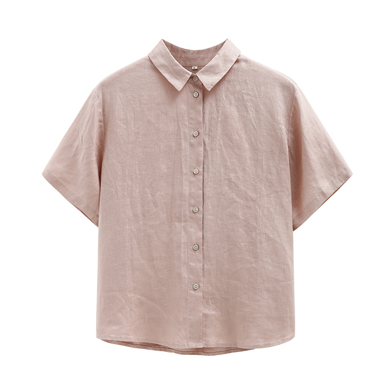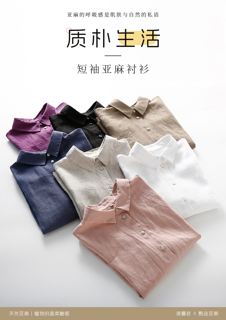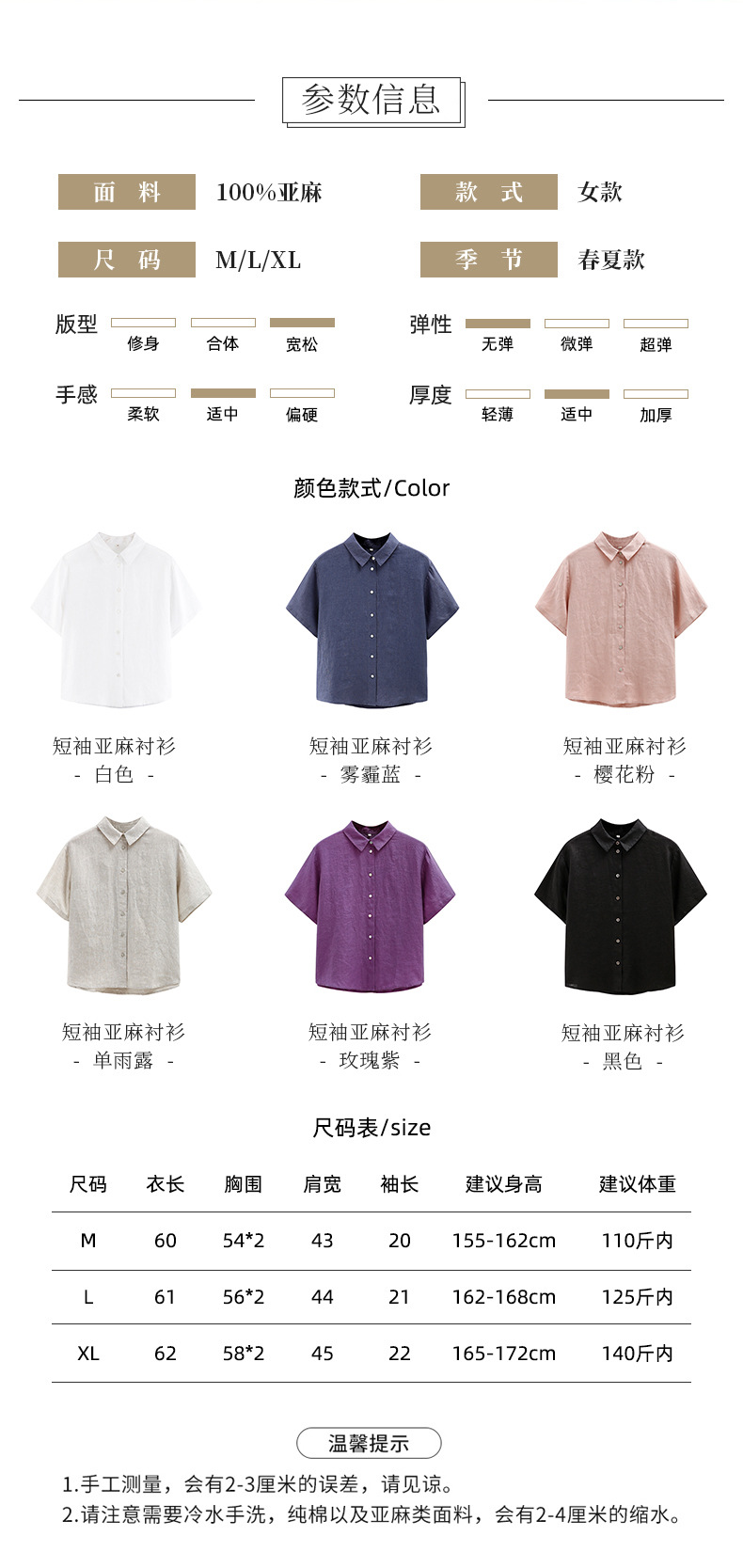 春夏新款短袖亚麻衬衫女2025宽松衬衫领夏天法国雨露麻女款上衣