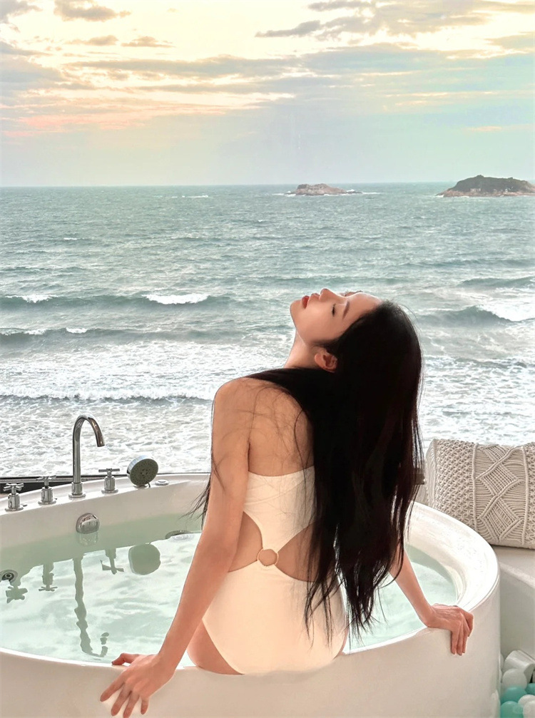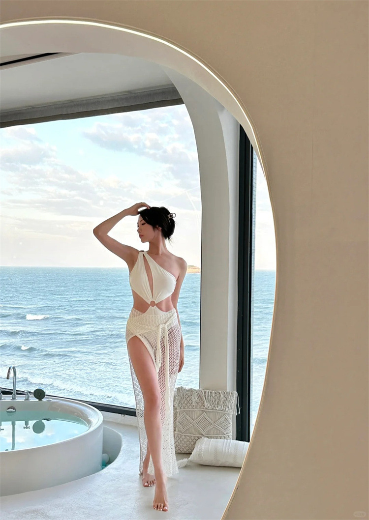 새로운 인터넷 연예인 스타일 화이트 체인 꽃 섹시한 원 숄더 중공 슬리밍 온천 휴가 원피스 스커트 수영복 여성용스토어 가기