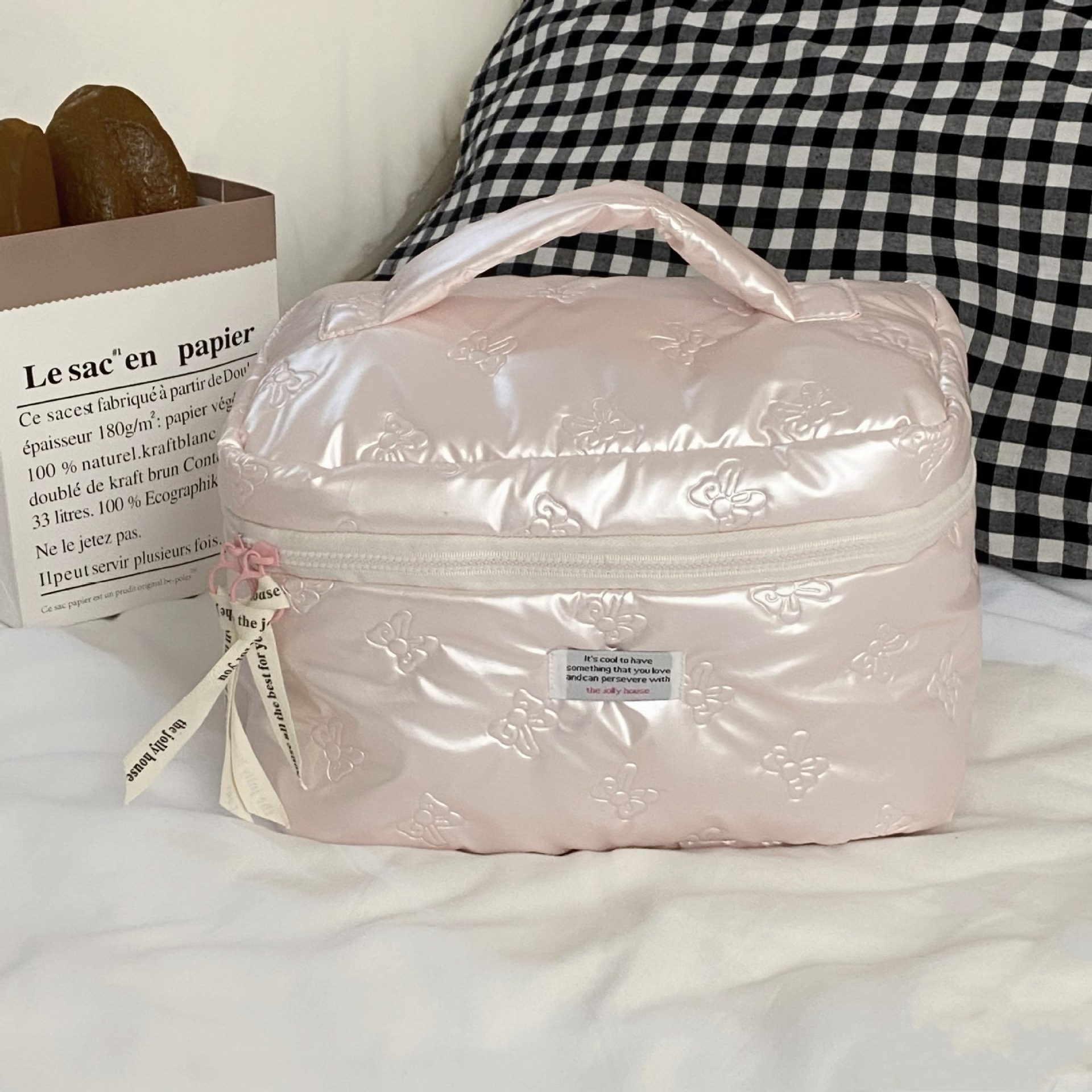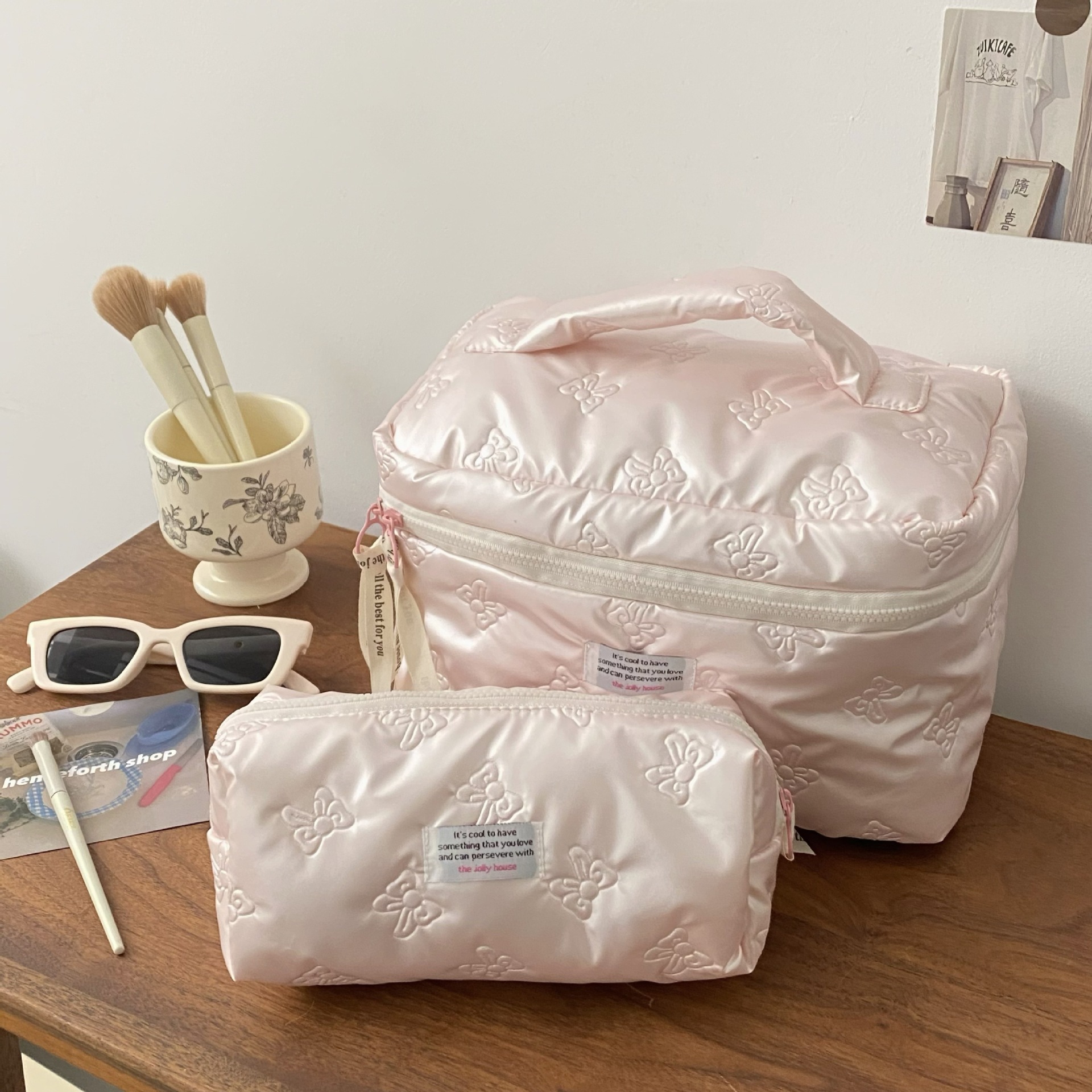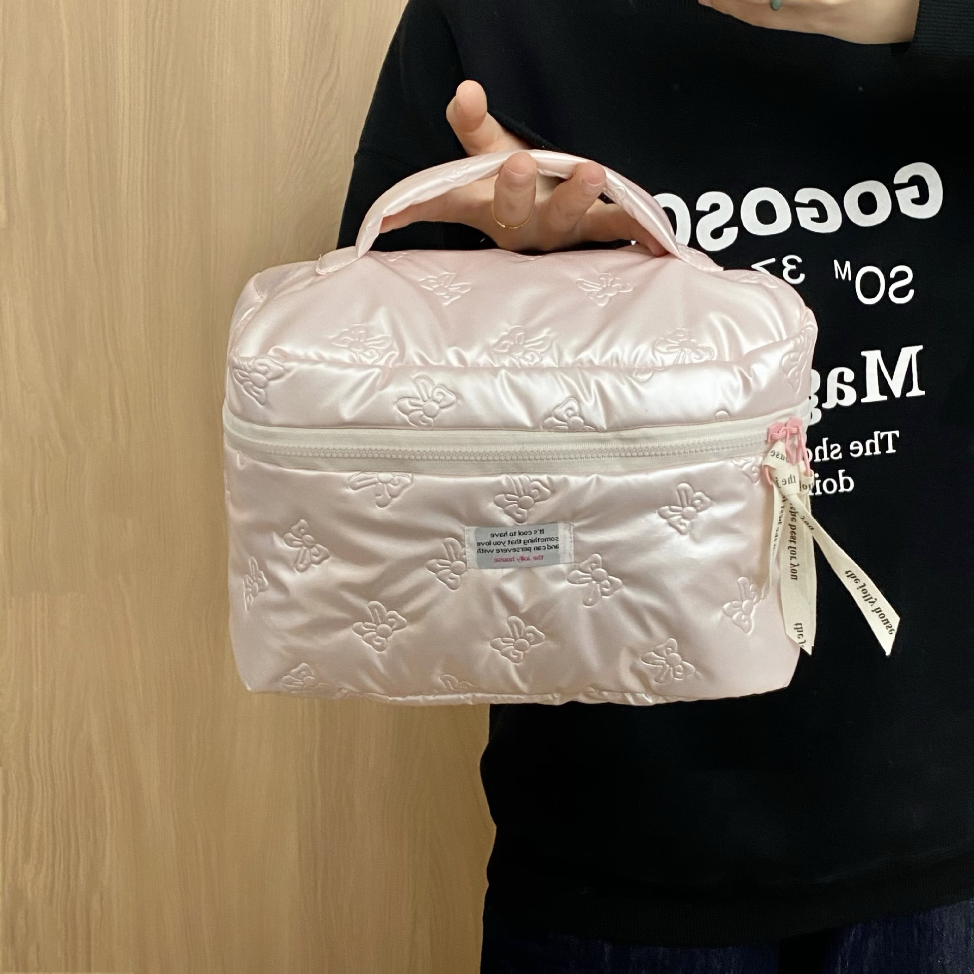 미모가 좋은 소녀들을 위한 대용량 화장품 가방, 리본 장식 화장품 수납 가방, 여성용 휴대용 외출용 세면도구 가방스토어 가기
